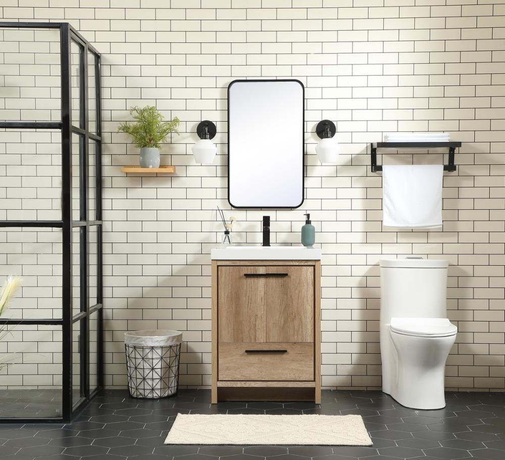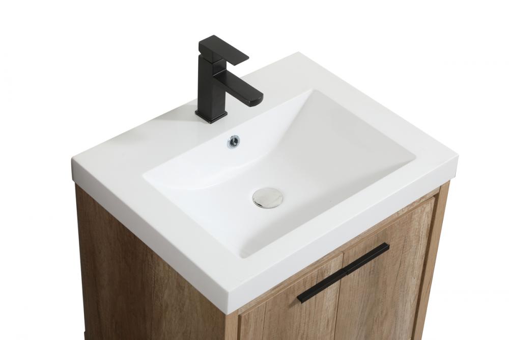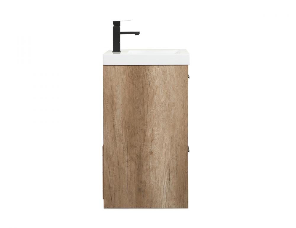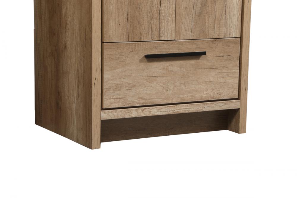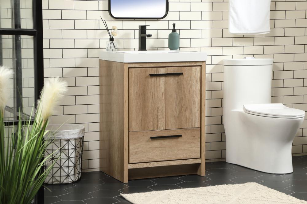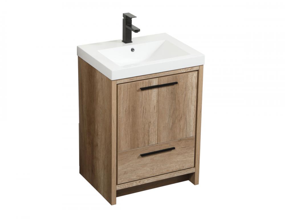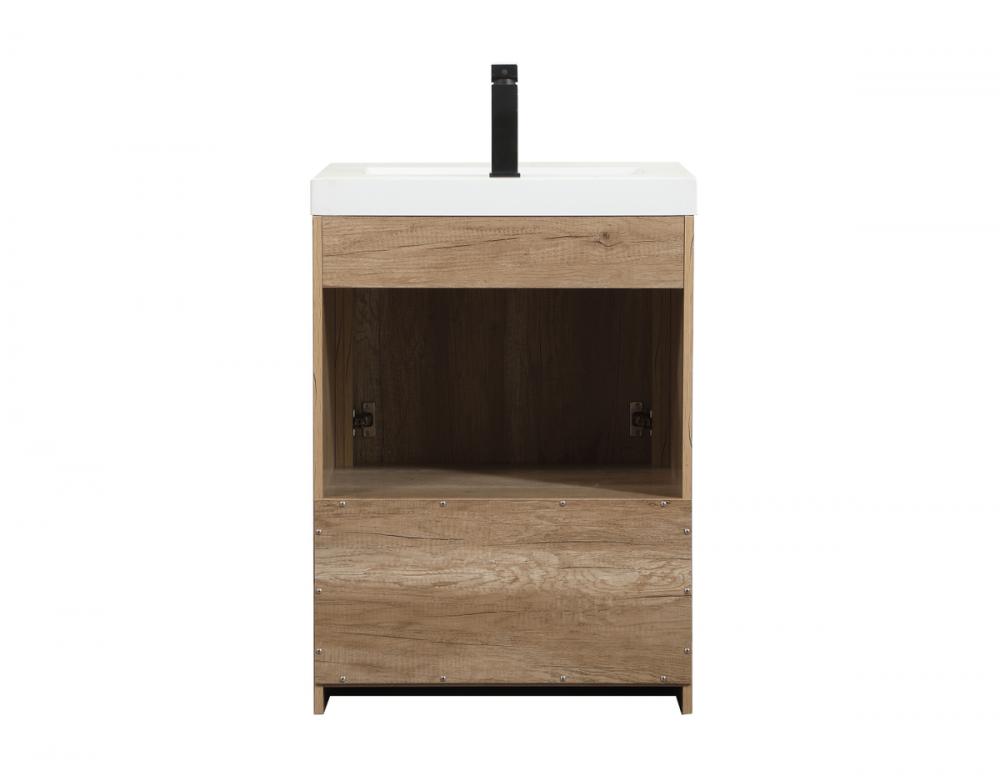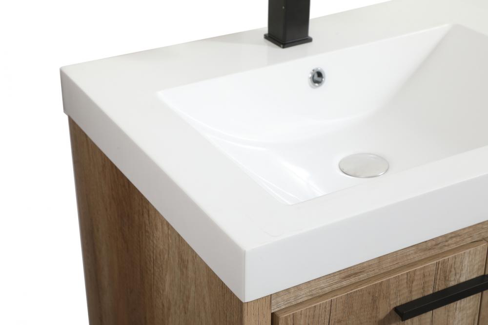 Modern sophistication is defined within the wood finish look and black barpulls of this vanity. Its length makes it the perfect addition to any sized home, and saves space with its storage area hidden behind the double cabinet doors and one bottom drawers. Topped with a highly durable thick resin white counter top and an integrated sink, this modern design will add everlasting class to your bathroom and powder room.