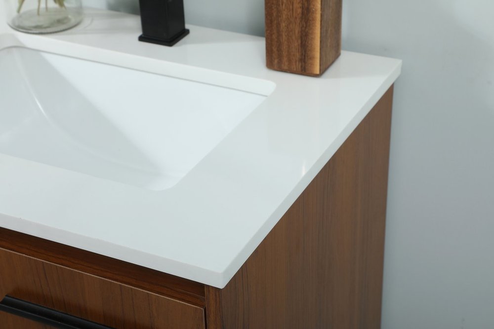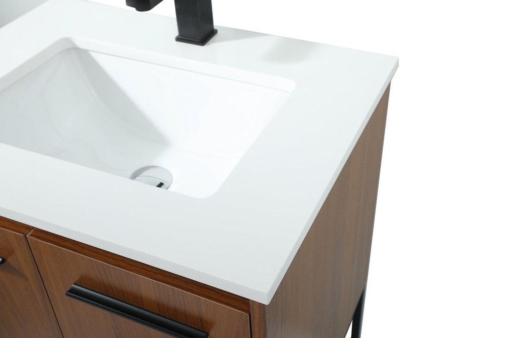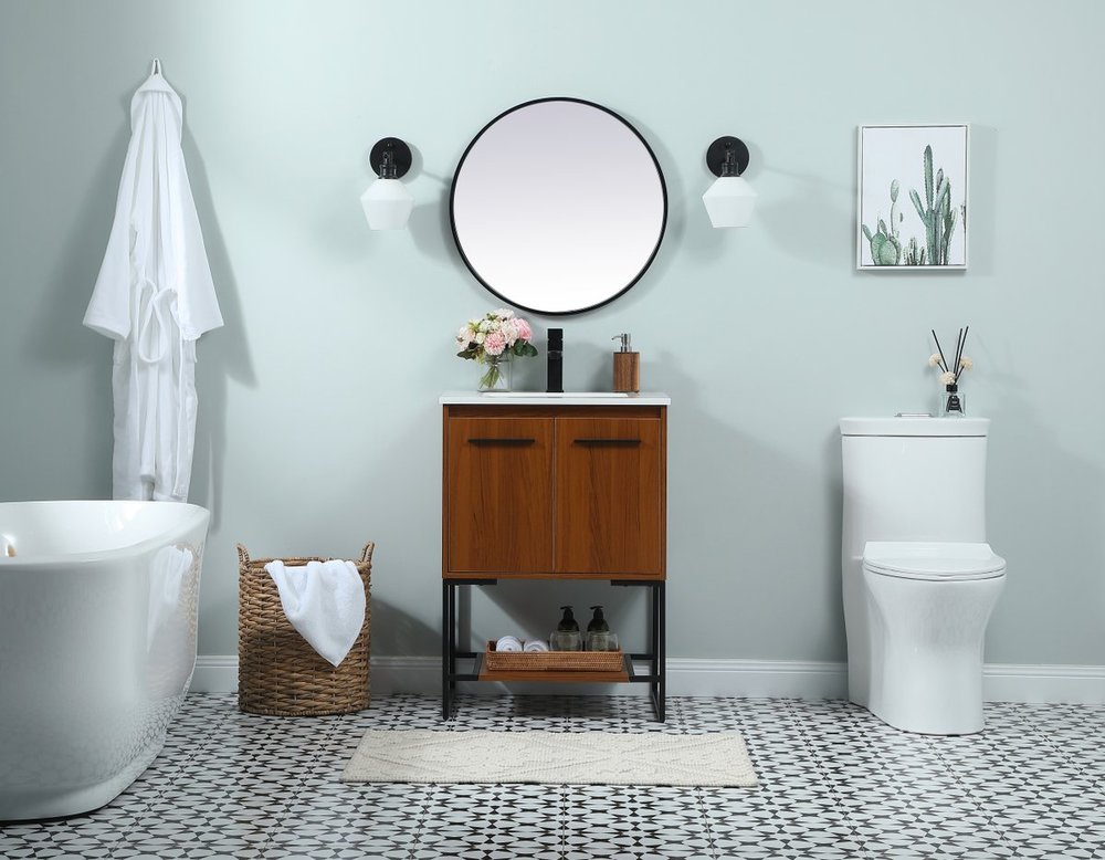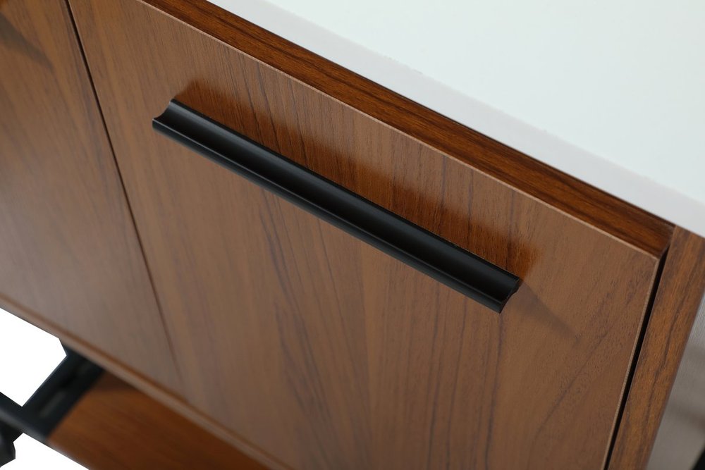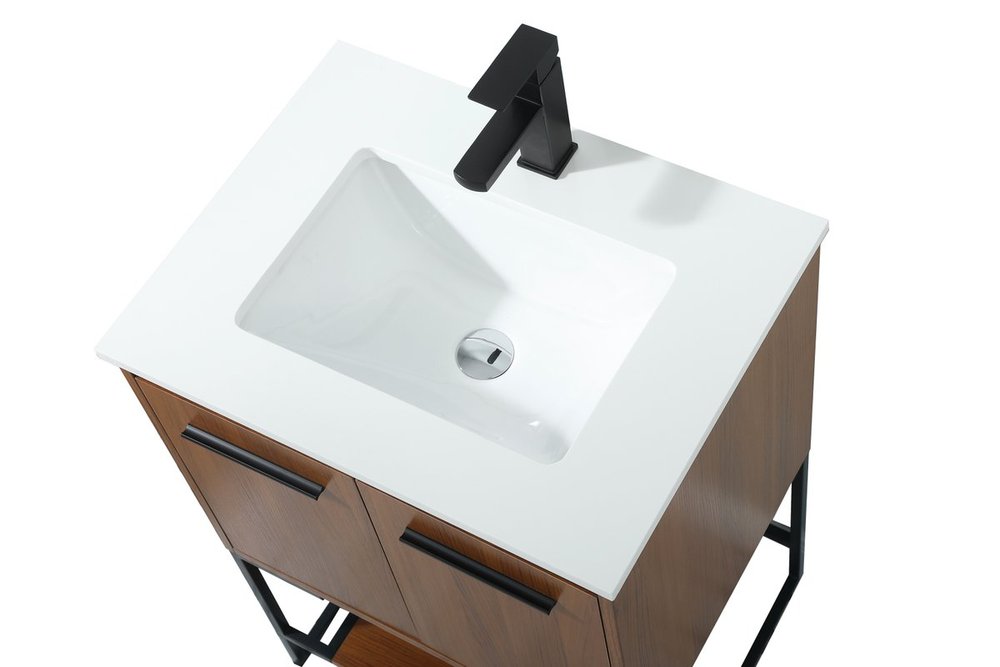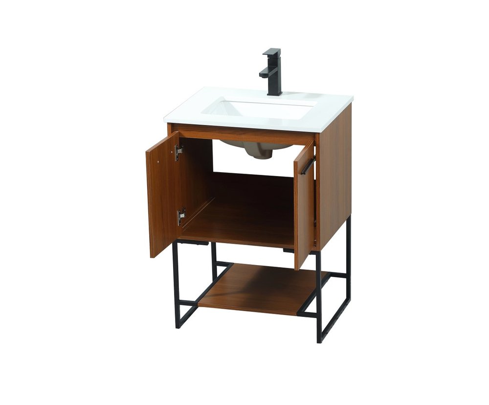 Live in modern comfort with this 24" teak finish vanity. Dressed in a teak and sleek black metal hardware, its contemporary style will have your bathroom or powder room elevated in industrial sophistication. The open shelf at the base and two doors reveal ample storage space for your bathroom essentials and miscellany. Clean lines create its own visual interest, adding trendy looks to your already chic room.