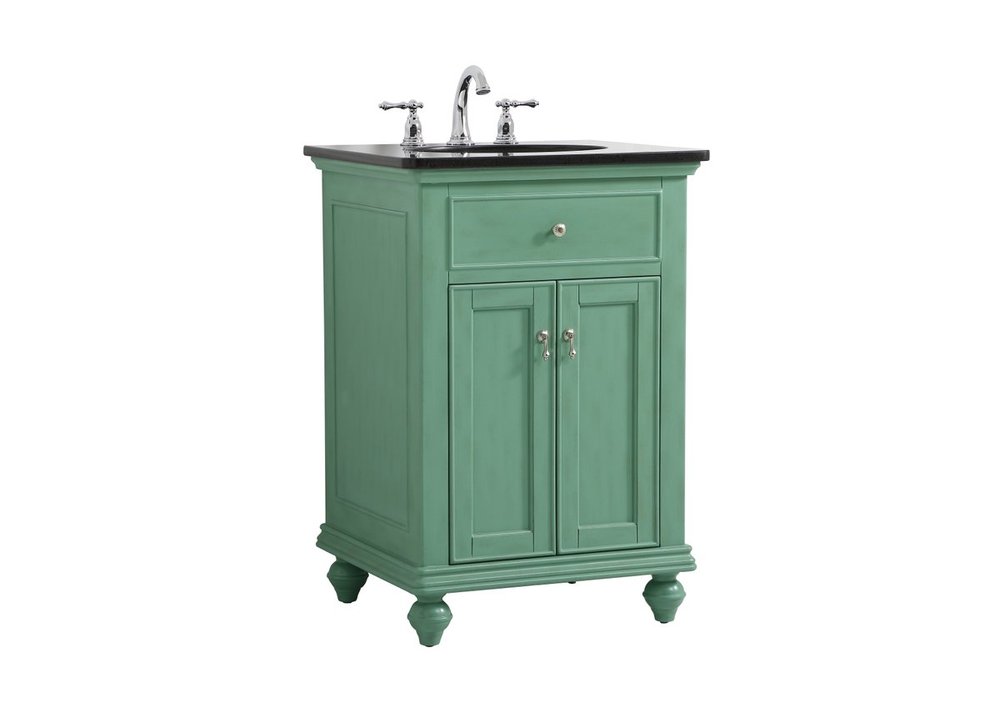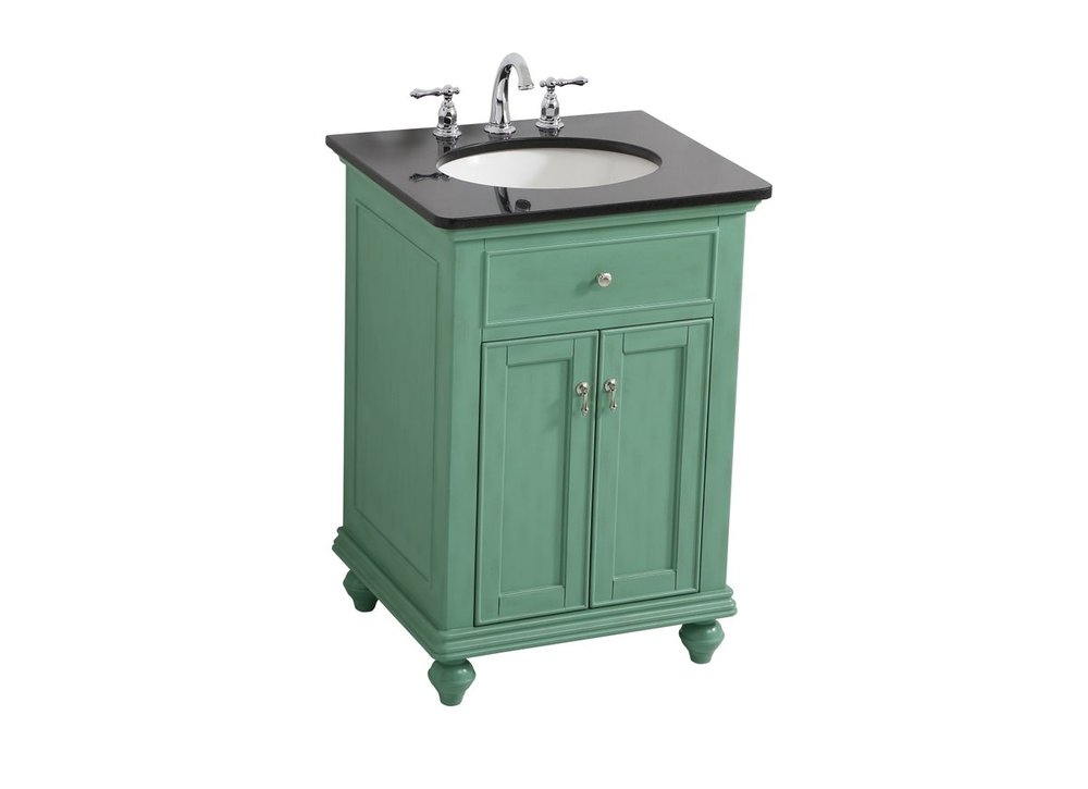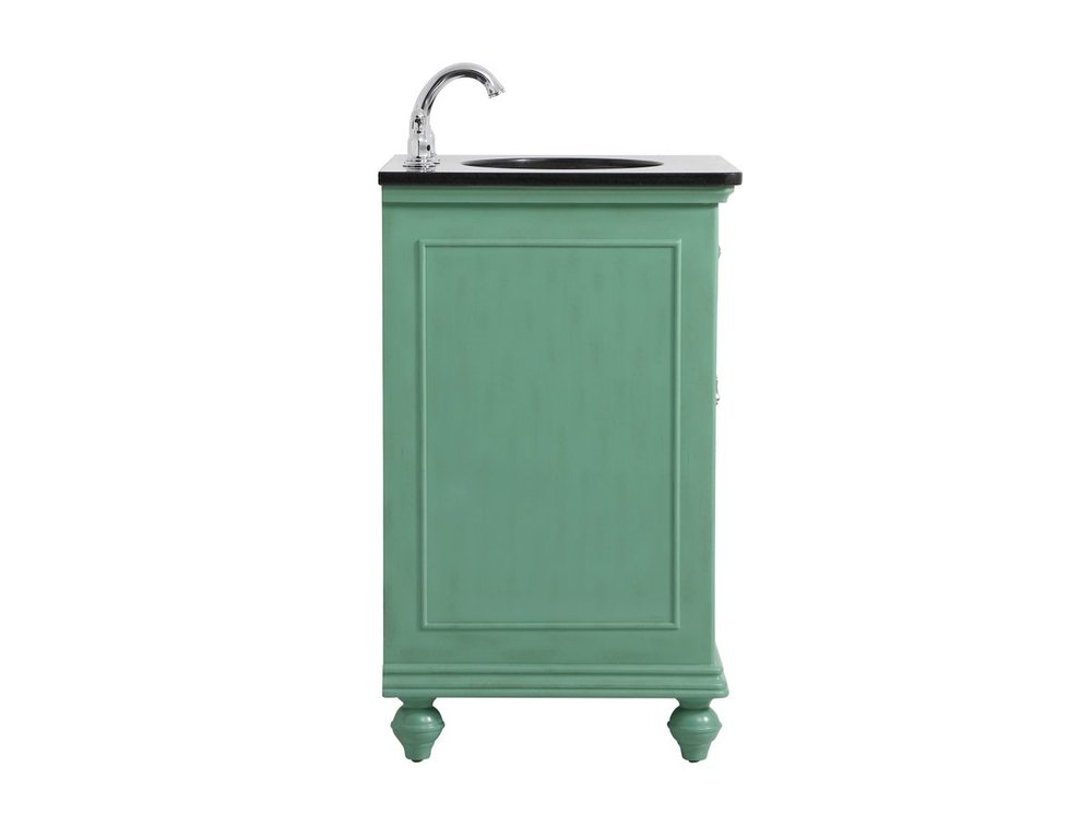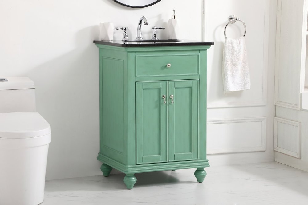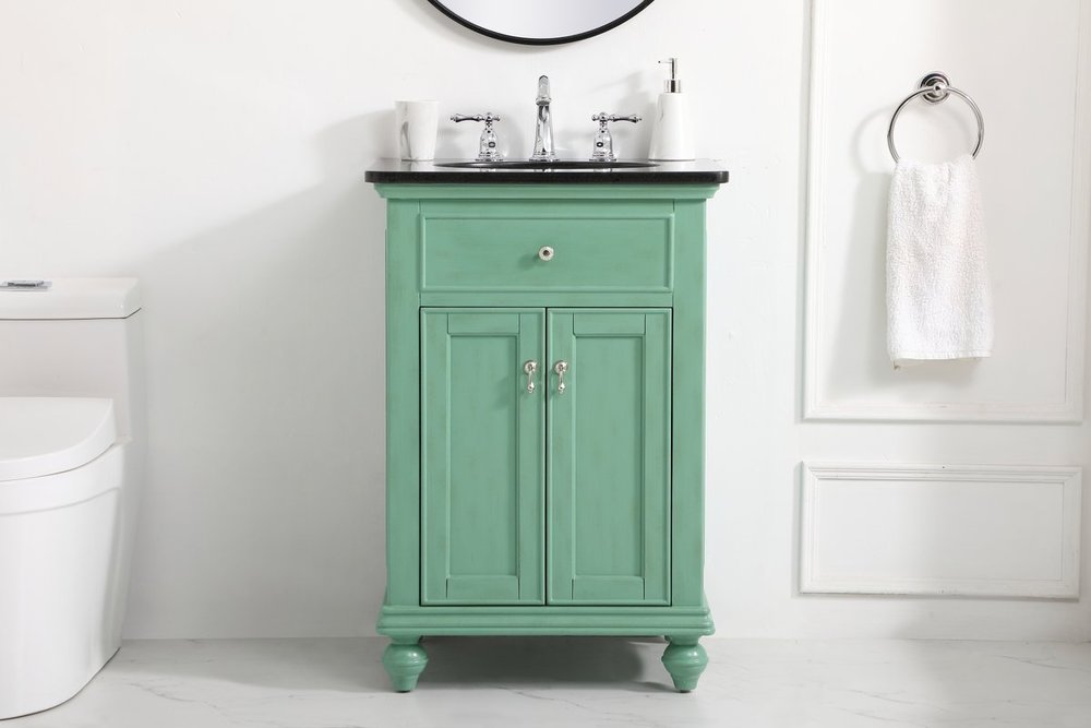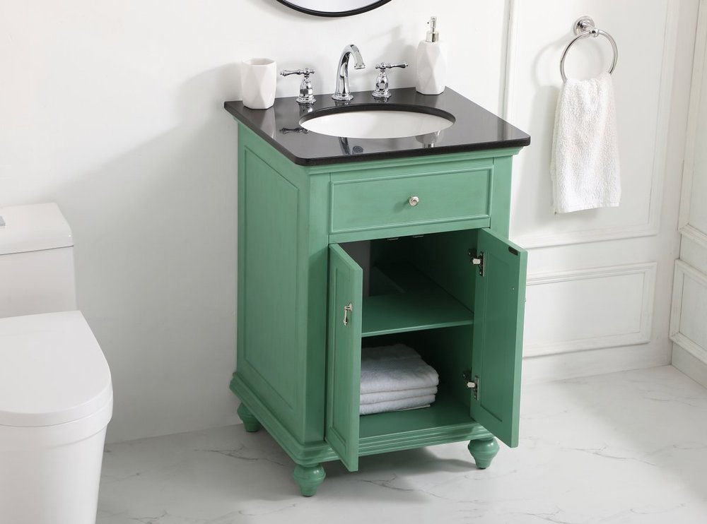 Create a refined and relaxing bath space with this contemporary design vanity, presenting its simplicity and clean straight lines in a minimalist appeal. This vanity, crafted of solid poplar wood and engineered wood panels, provides ample storage within its soft-close cabinet door, accentuated with metal hardware. Rounding out the design is a black granite top with a white porcelain under-mount oval sink. Convenient access for plumbing installation with cut out back panel. Hand painted finish with distressing application to provide an antique effect.