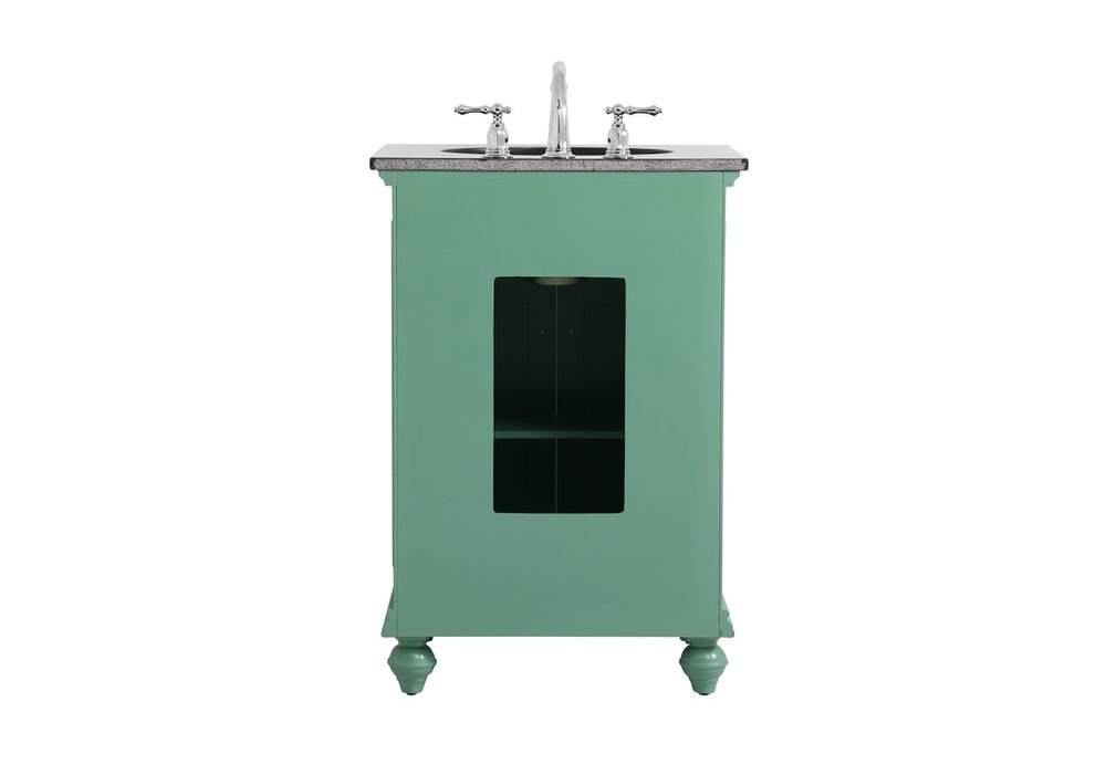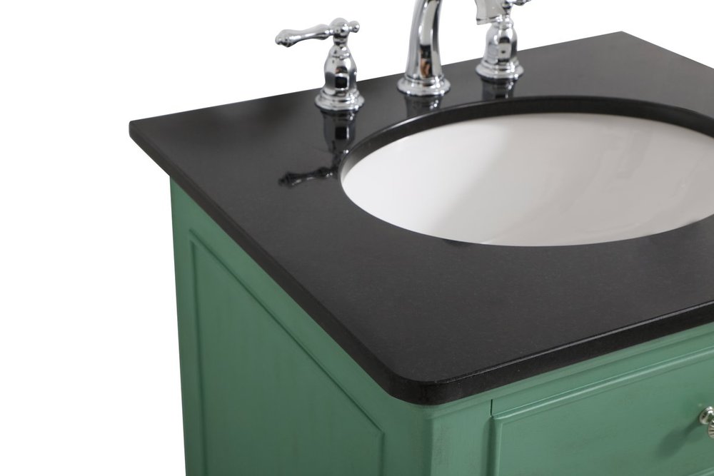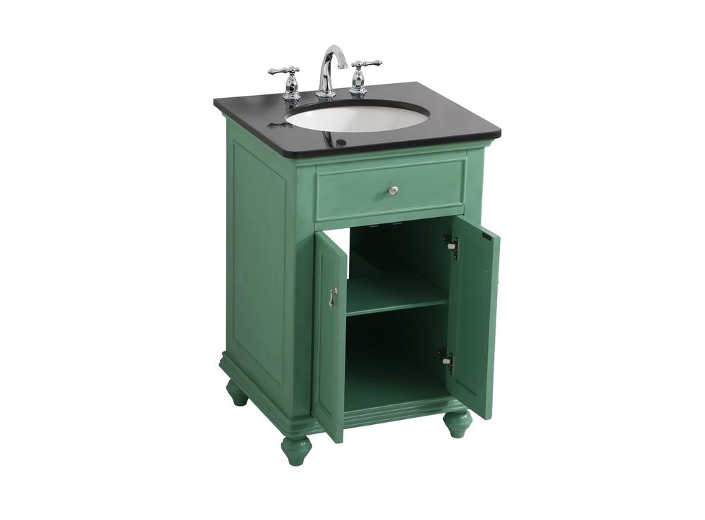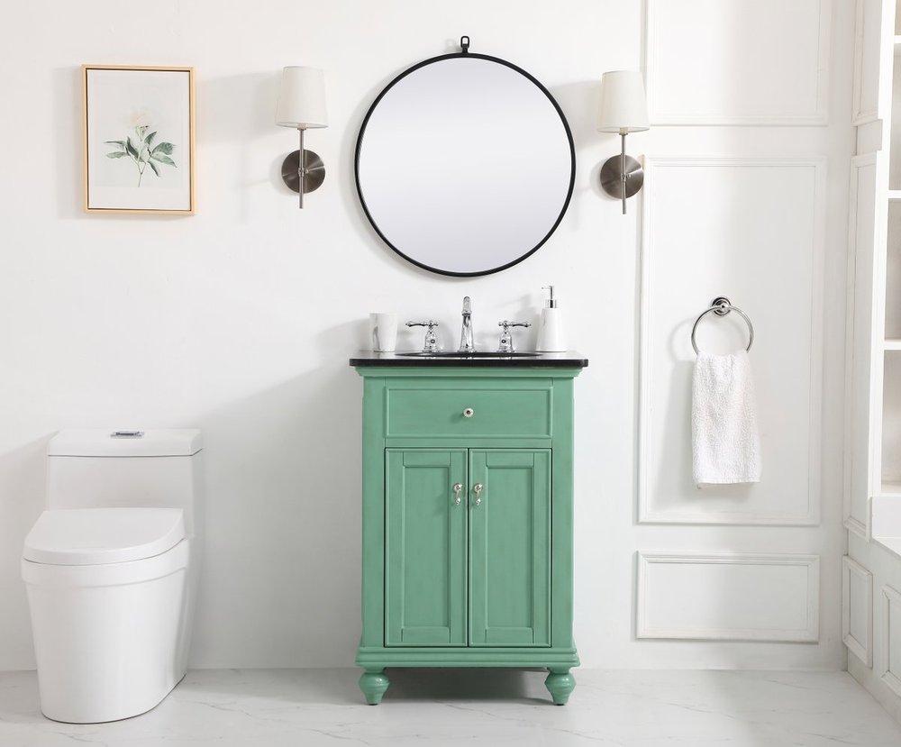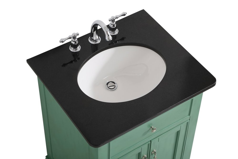 Create a refined and relaxing bath space with this contemporary design vanity, presenting its simplicity and clean straight lines in a minimalist appeal. This vanity, crafted of solid poplar wood and engineered wood panels, provides ample storage within its soft-close cabinet door, accentuated with metal hardware. Rounding out the design is a black granite top with a white porcelain under-mount oval sink. Convenient access for plumbing installation with cut out back panel. Hand painted finish with distressing application to provide an antique effect.
