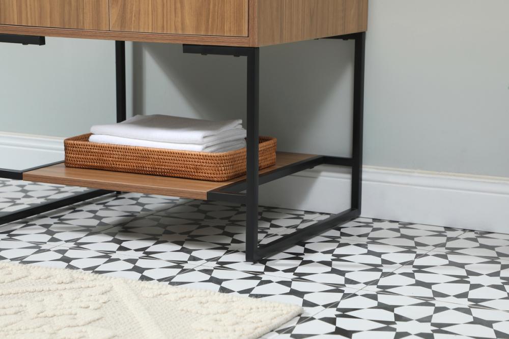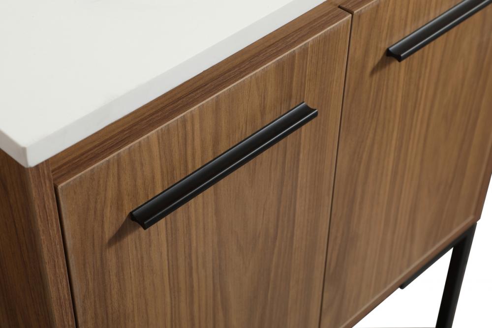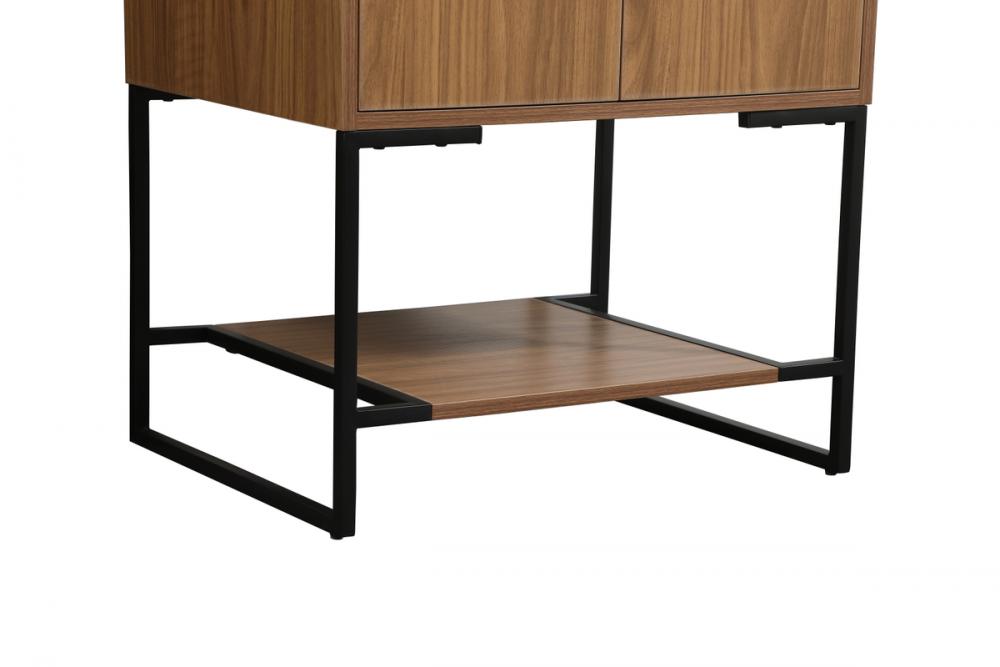 Live in comfort with this modern vanity. Dressed in a walnut brown and modern black metal hardware, its sleek style will have your bathroom or powder room elevated in industrial sophistication. The open shelf at the base and two doors reveal ample storage space for your bathroom essentials. Clean lines create its own visual interest, adding trendy looks to your already chic room.