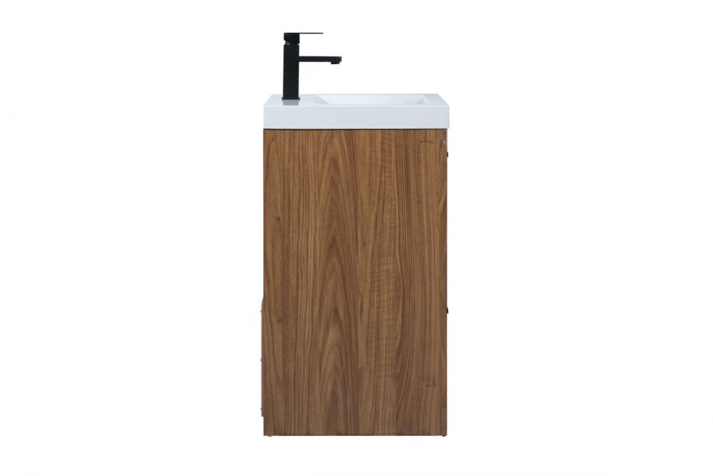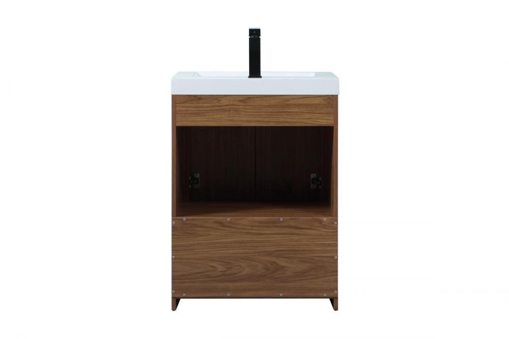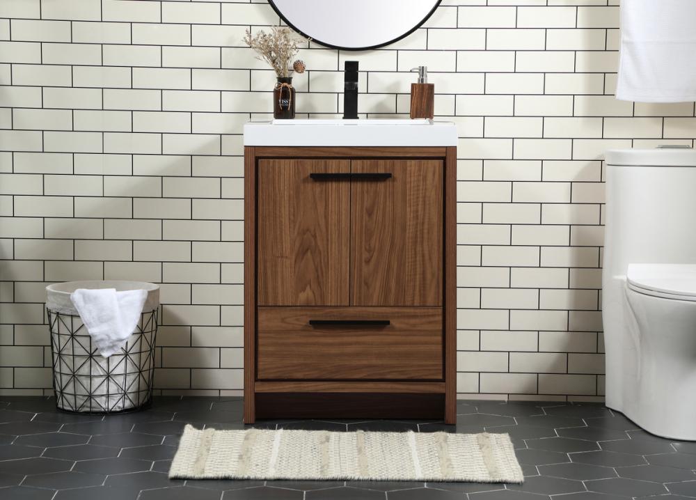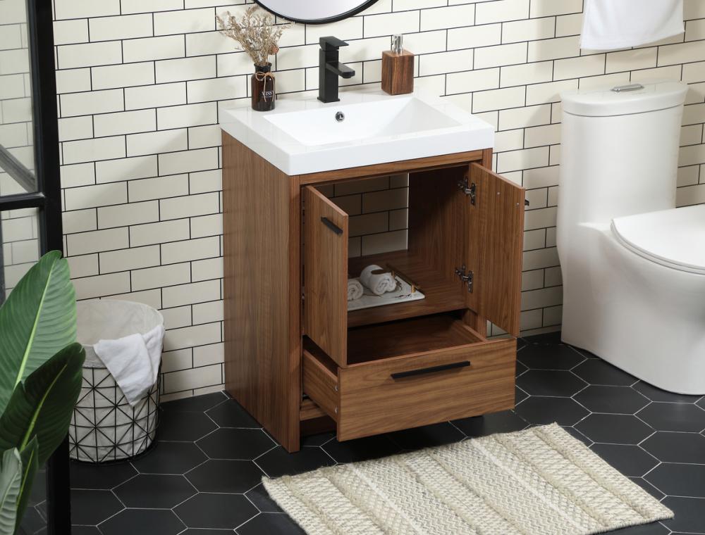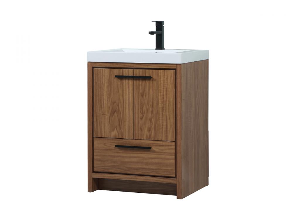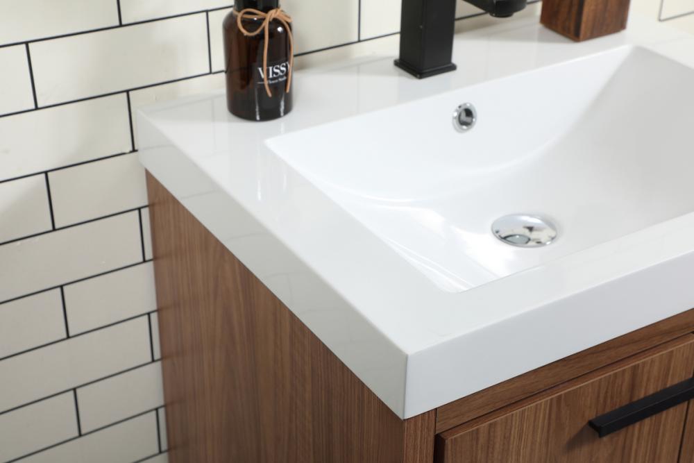 Modern sophistication is defined within the wood finish look and black barpulls of this vanity. Its length makes it the perfect addition to any sized home, and saves space with its storage area hidden behind the double cabinet doors and one bottom drawers. Topped with a highly durable thick resin white counter top and an integrated sink, this modern design will add everlasting class to your bathroom and powder room.