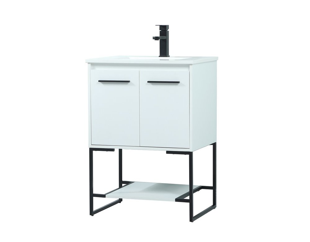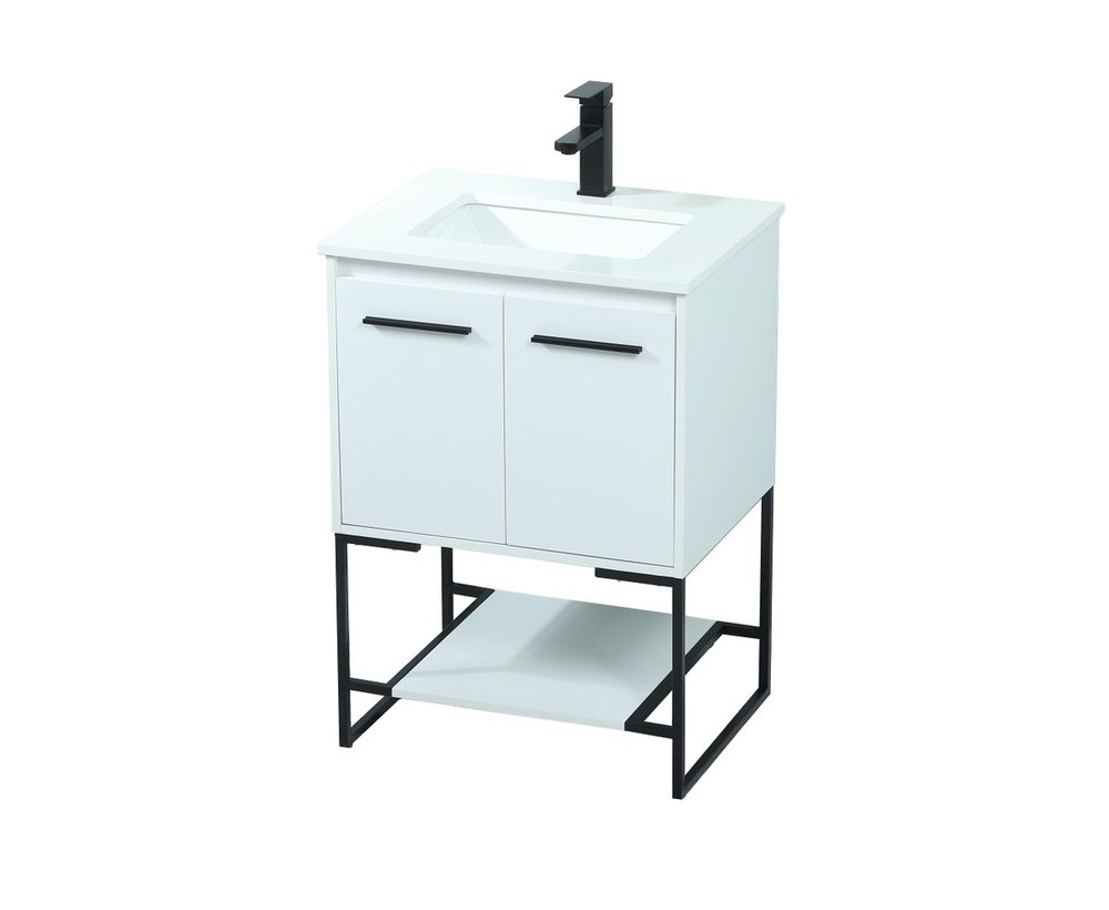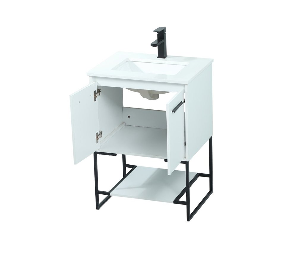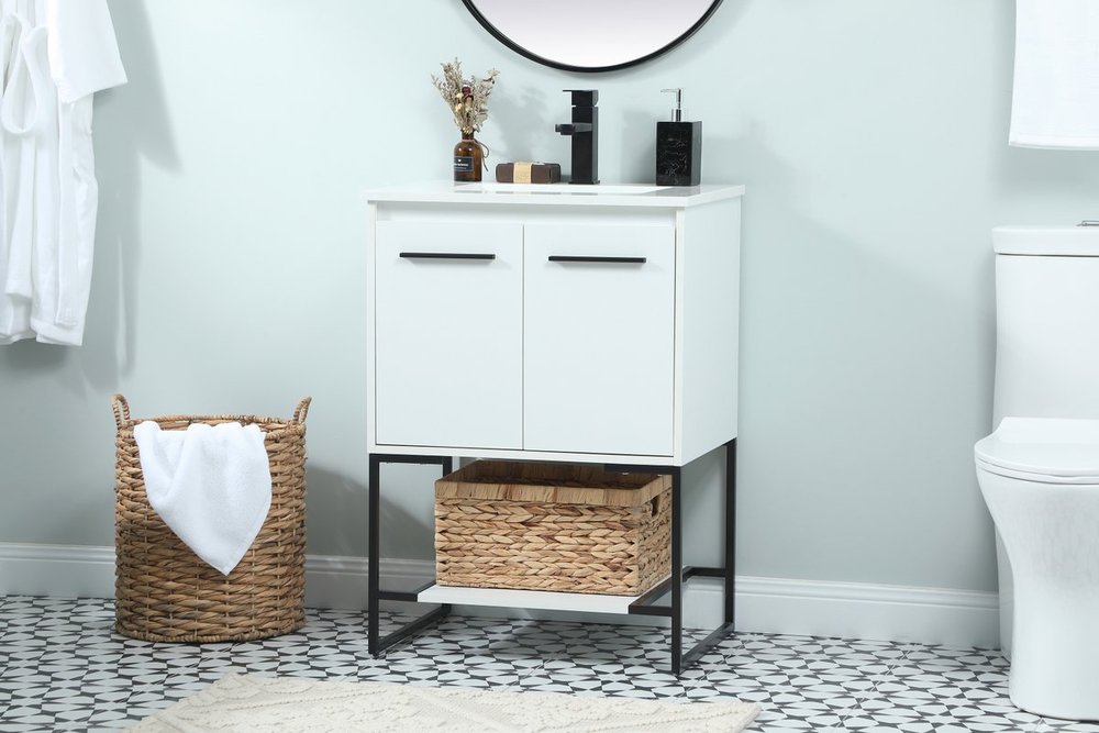 Live in modern comfort with this 24" white finish vanity. Dressed in a white and sleek black metal hardware, its contemporary style will have your bathroom or powder room elevated in industrial sophistication. The open shelf at the base and two doors reveal ample storage space for your bathroom essentials and miscellany. Clean lines create its own visual interest, adding trendy looks to your already chic room.