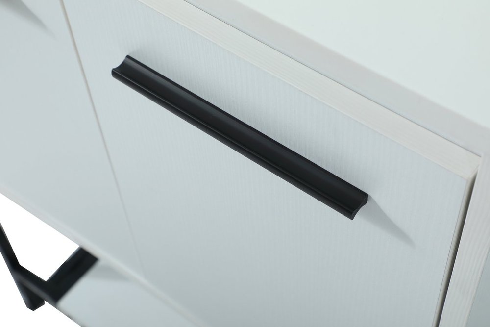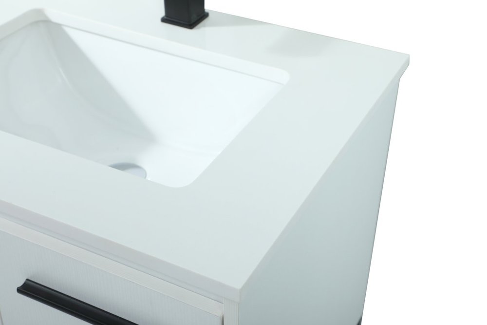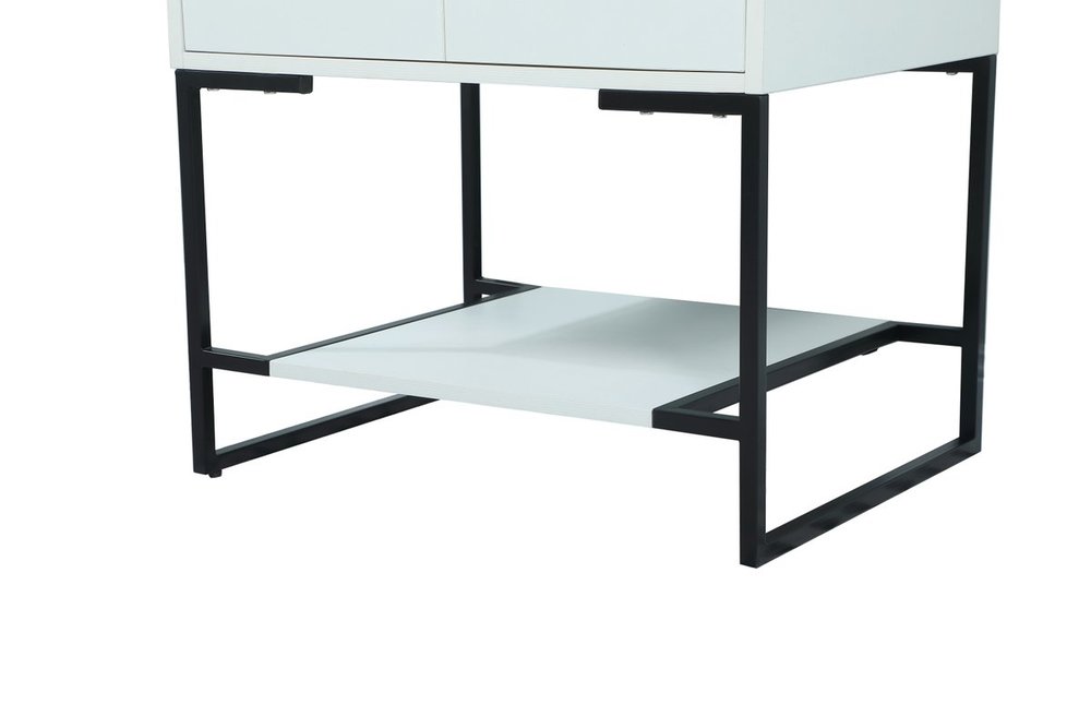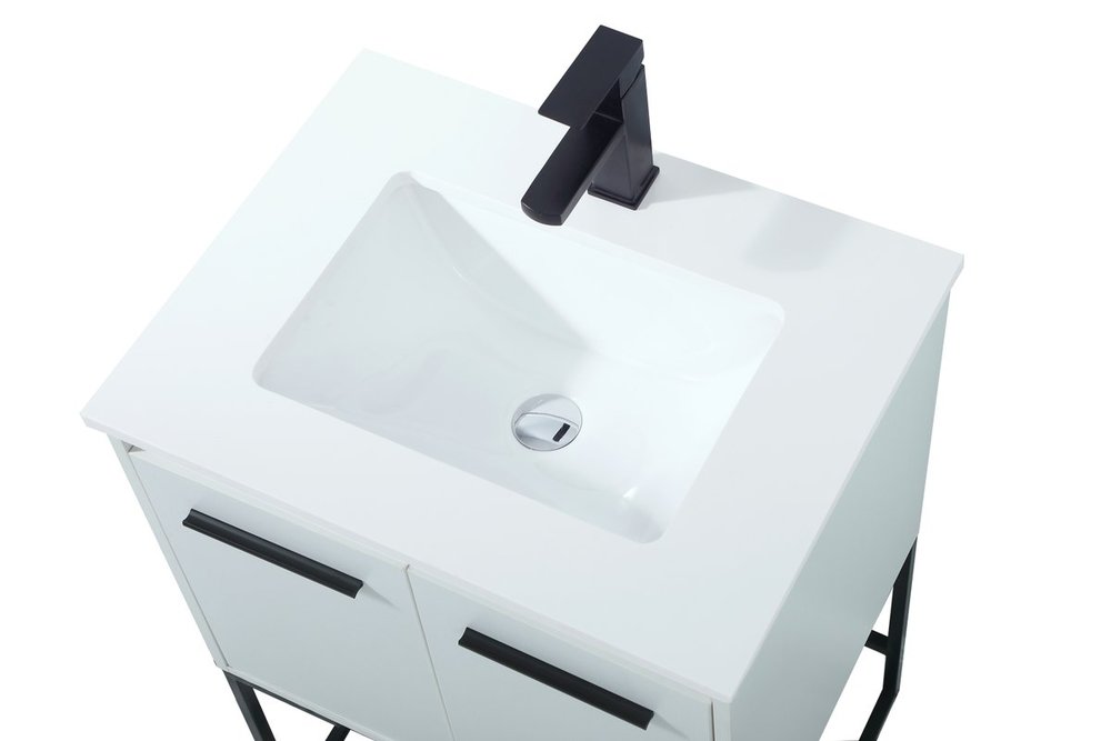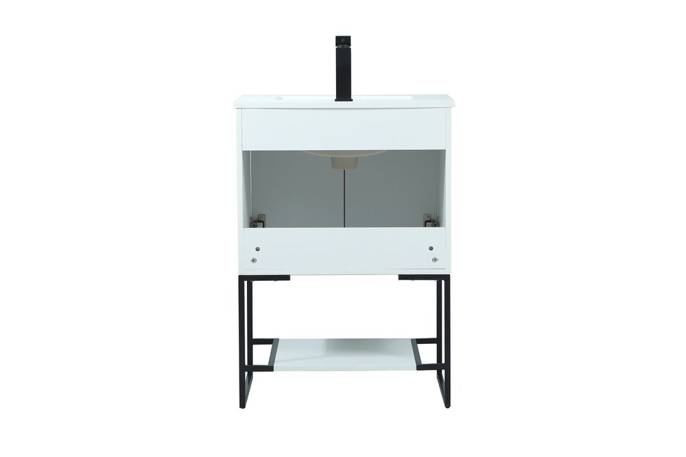 Live in modern comfort with this 24" white finish vanity. Dressed in a white and sleek black metal hardware, its contemporary style will have your bathroom or powder room elevated in industrial sophistication. The open shelf at the base and two doors reveal ample storage space for your bathroom essentials and miscellany. Clean lines create its own visual interest, adding trendy looks to your already chic room.