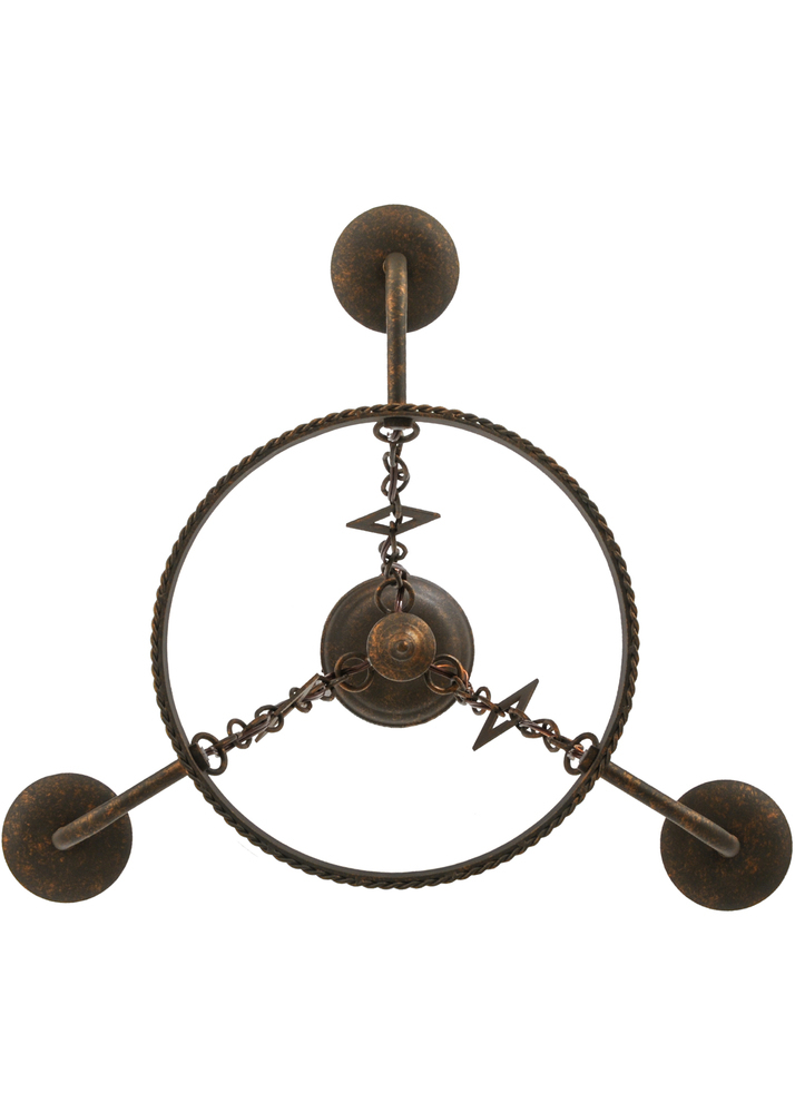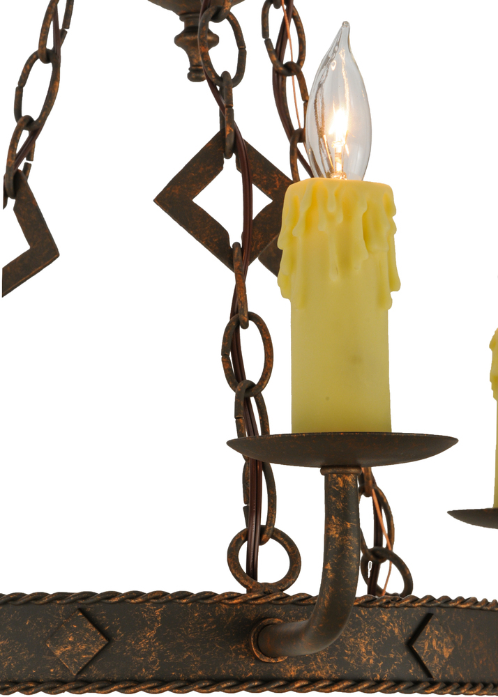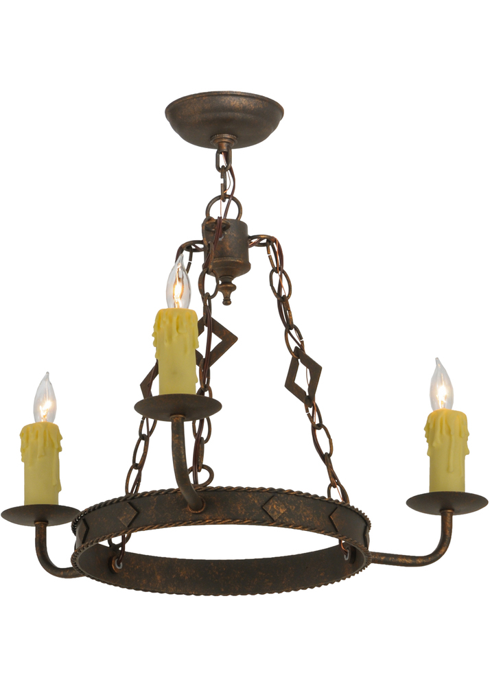 Defined by an elegant and impressive Gothic look. This Elvita chandelier features a rugged ring frame with decorative rope-like borders. Three exquisite Ivory faux candlelights are perched on bobeches embraced by curved arms. The hardware; frame and chain with matching diamond shaped accents are featured in a Gilded Tobacco finish. Handcrafted by highly skilled artisans in our 180;000 sq ft manufacturing facility in Yorkville; New York. Overall height ranges from 19.5 to 67 inches as the chain can be adjusted in the field to meet your lighting application needs. Customize the candlelight colors; metal finishes and chandelier sizes. UL and cUL listed for damp and dry locations.