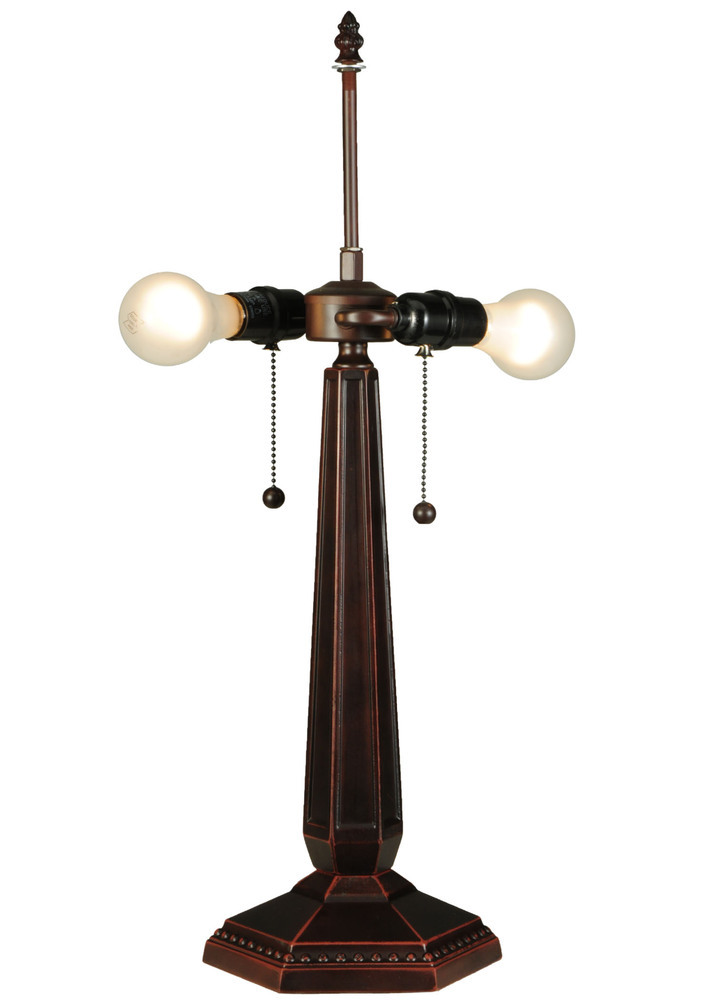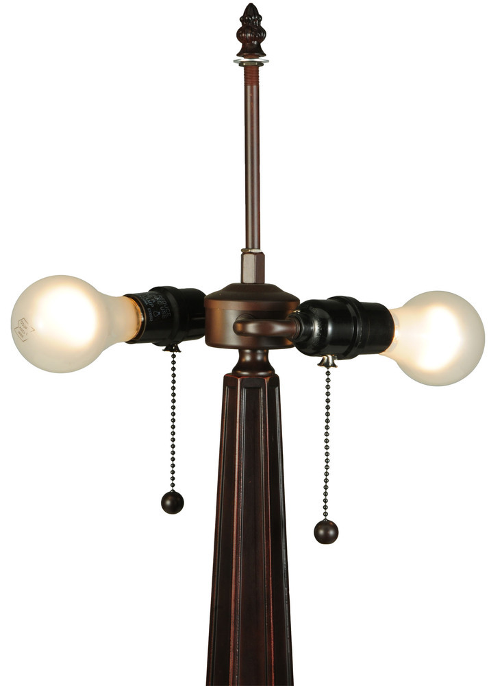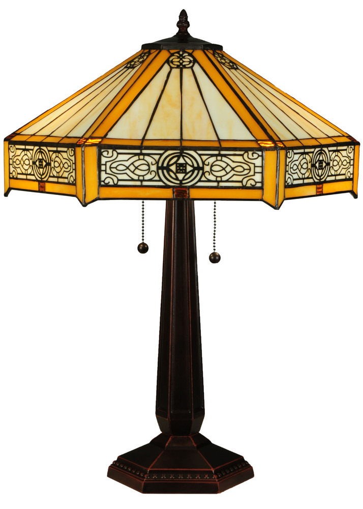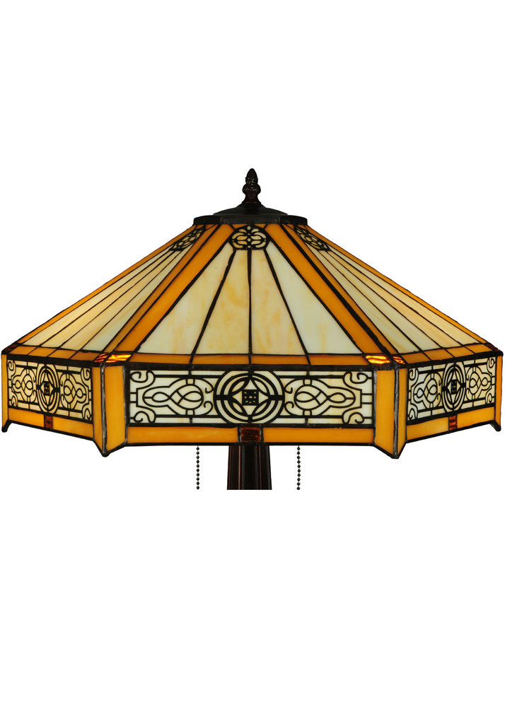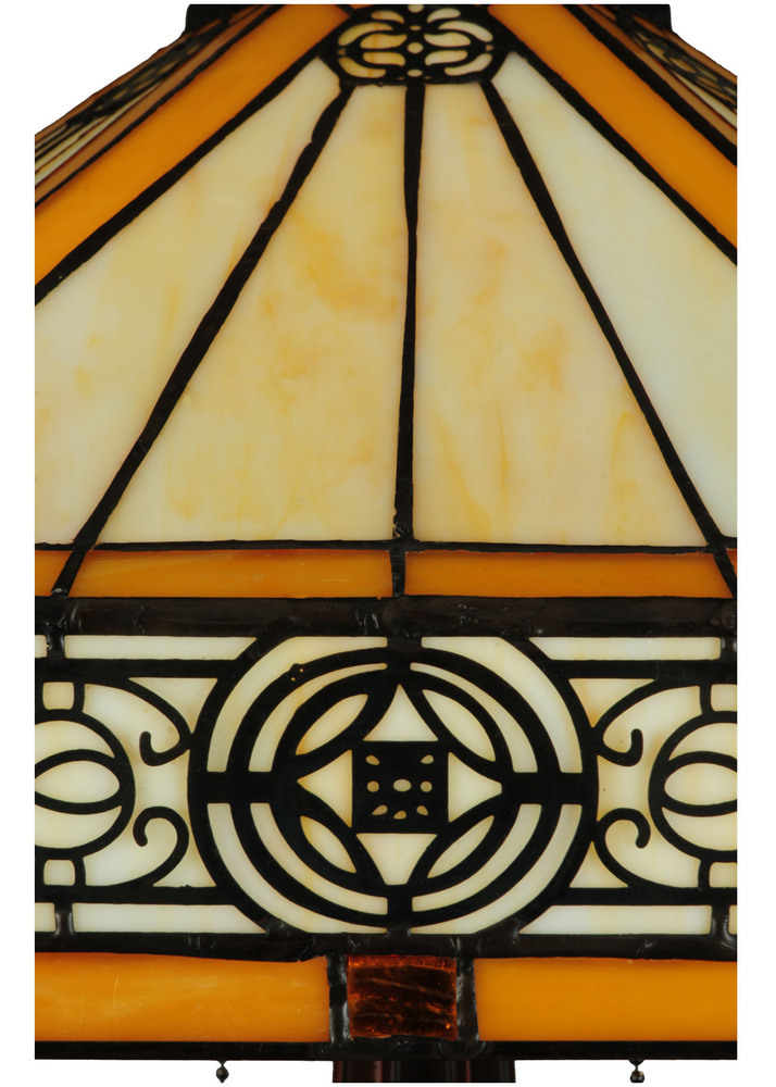 Honey stained glass strips accent Beige panels of this hexagonal shaped shade; which is highlighted with decorative Brass details on the shade's skirt. The small center square pieces of glass feature Sunburst and Amber accents. The shade is constructed using Meyda Tiffany's famous copperfoil construction process and the base is finished in Mahogany Bronze.