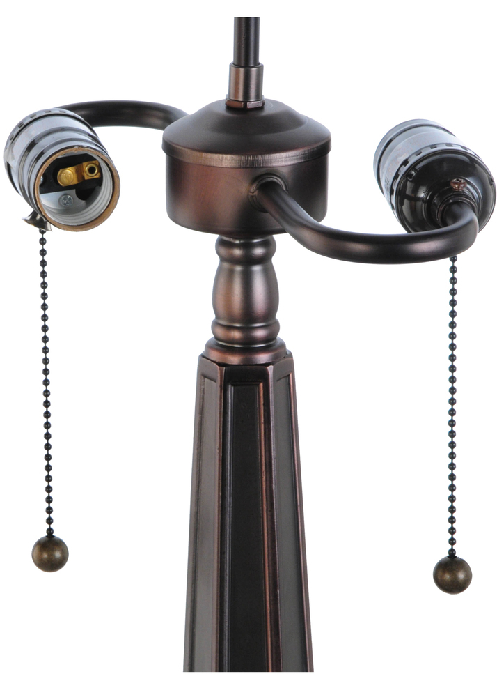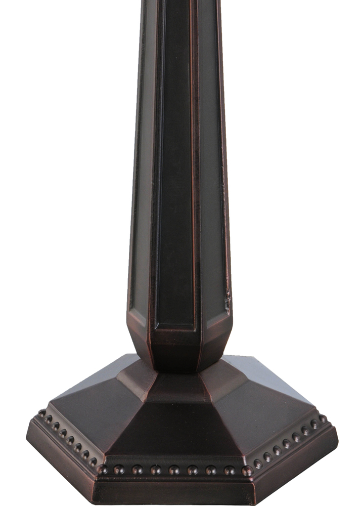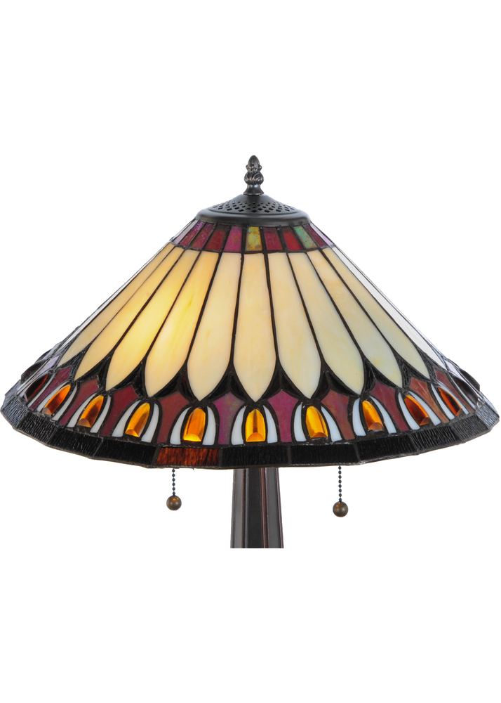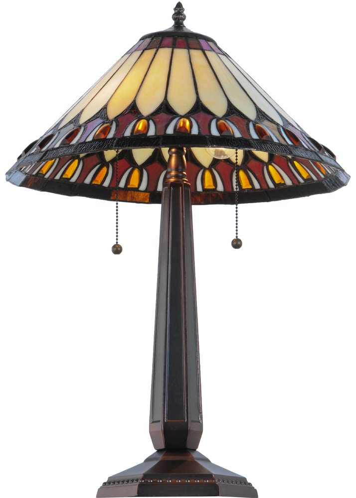 Slender Beige stained glass petals sprout from a Chestnut crown with matching background accented with Amber Acorn glass jewels outlined in Willow White and bordered in Bark Brown. This gracious shade is created using Meyda Tiffany's famous copperfoil construction process and complemented with an elegant Mahogany Bronze lamp base.