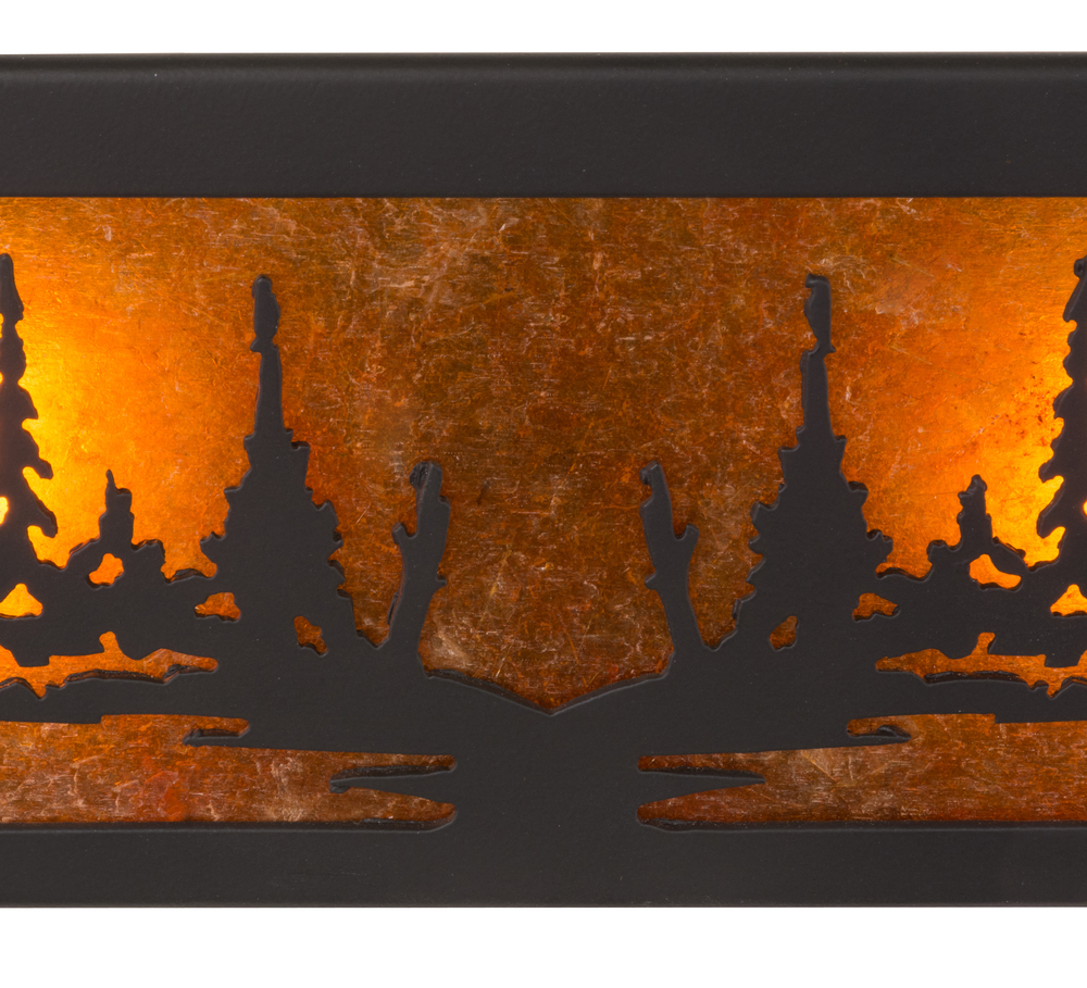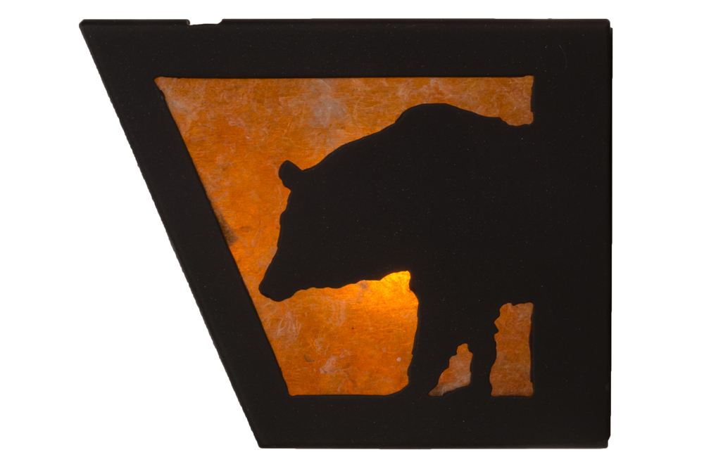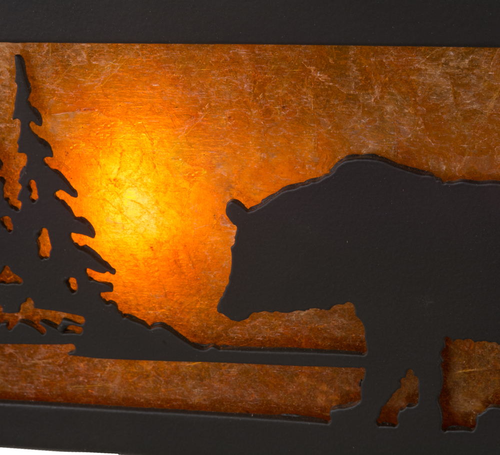 Drawing inspiration from the wildlife and natural beauty in the nearby Adirondack Mountains; this stunning lighting fixture depicts majestic Bears wandering around the woodland lakes. A warm ambient glow projects through warm Amber Mica; which is complemented with a frame and hardware featured in a Flat Black finish. The fixture; which is ideal for illuminating baths as a vanity light or corridors as a wall sconce; is handcrafted by Meyda artisans in our Yorkville; NY facility. Custom designs; finishes; styles; sizes and dimmable energy efficient lamping are available.
