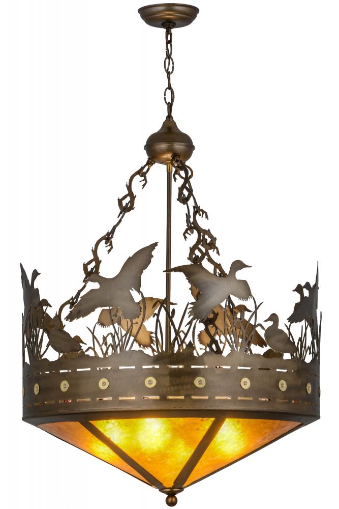 Ducks splash and fly among the cattails and marsh grasses in this wildlife inspired original lighting fixture. Beautiful ambient lighting is projected through Amber Mica with the hardware and decorative accents hand finished inAntique Copper while Solid Copper accents adorn the sturdy trim. Handcrafted in the USA by Meyda artisans in the Yorkville; NY manufacturing facility which is located at the foothills of the glorious Adirondack Mountains.Wildlife and other custom designs are available; as well as dimmable energy efficient lamping options.