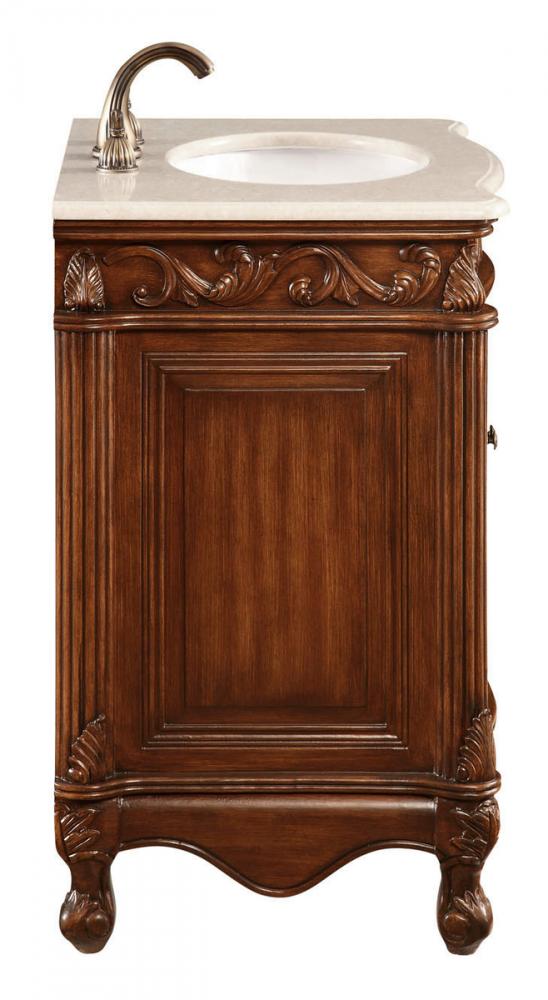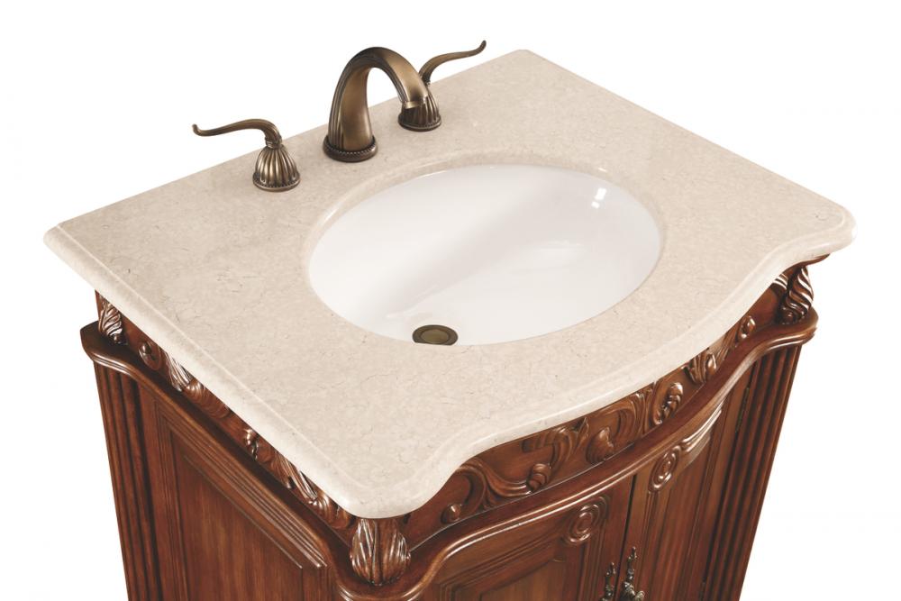 Measurements: W27” x D21” x H36” · Authentic cream marble countertop · Pre-drilled faucet holes, 8” spread · white porcelain under mount sink · Antique bronze finish door knobs · 2 doors, 1 shelf inside ·
