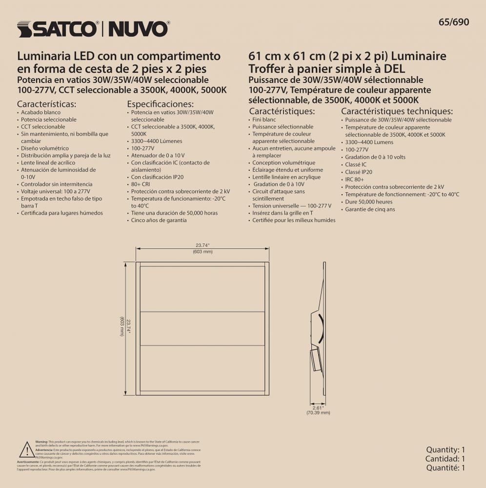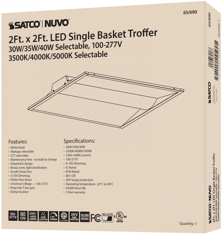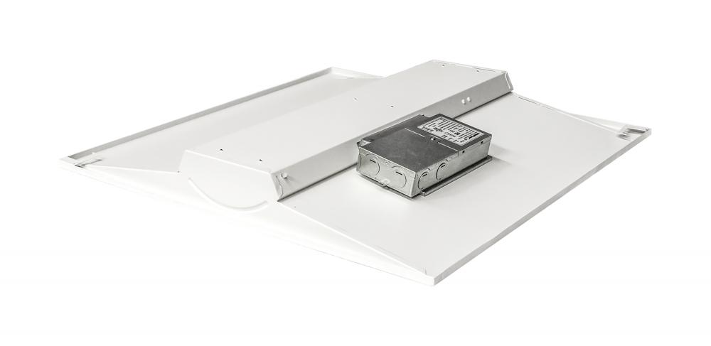 A two foot by two foot single basket troffer which feature selectable wattage and color temperature. The troffer features an acrylic linear prismatic lens which allows for broad, even light distribution. The driver allows for flicker-free illumination, and