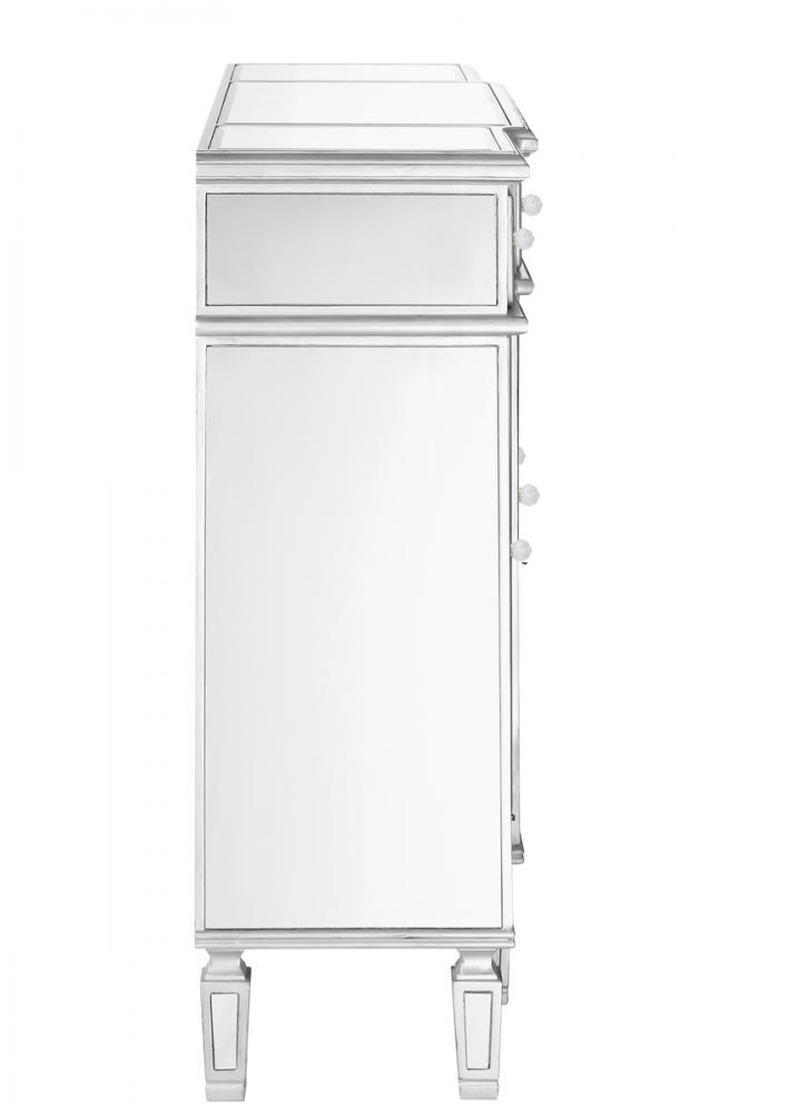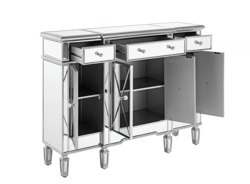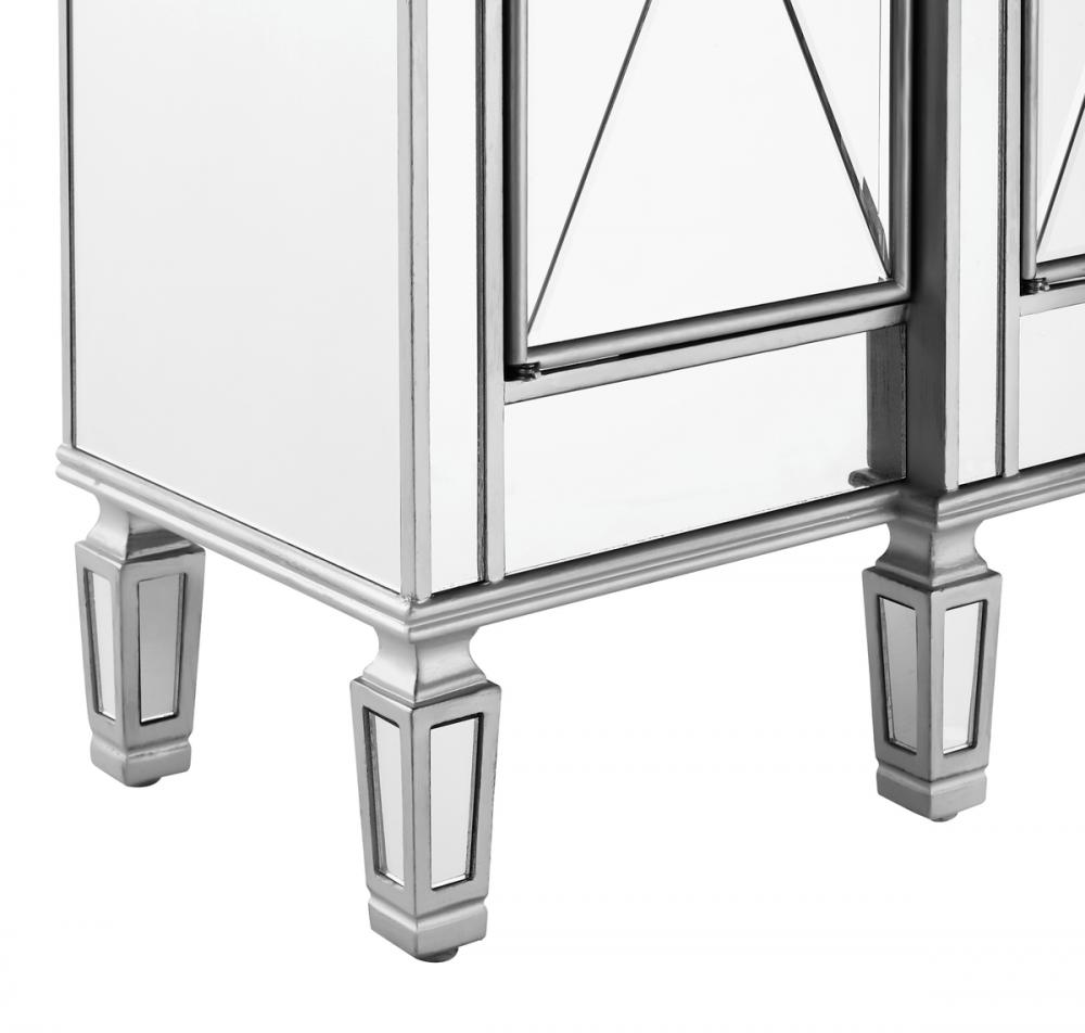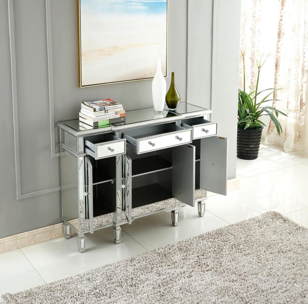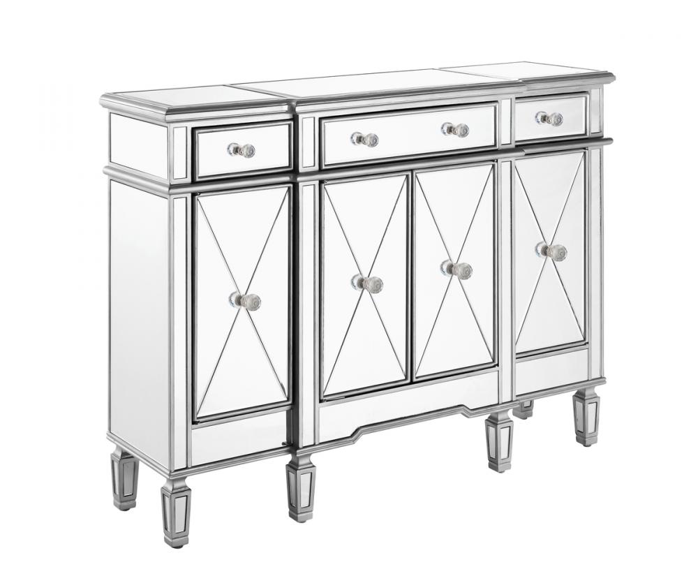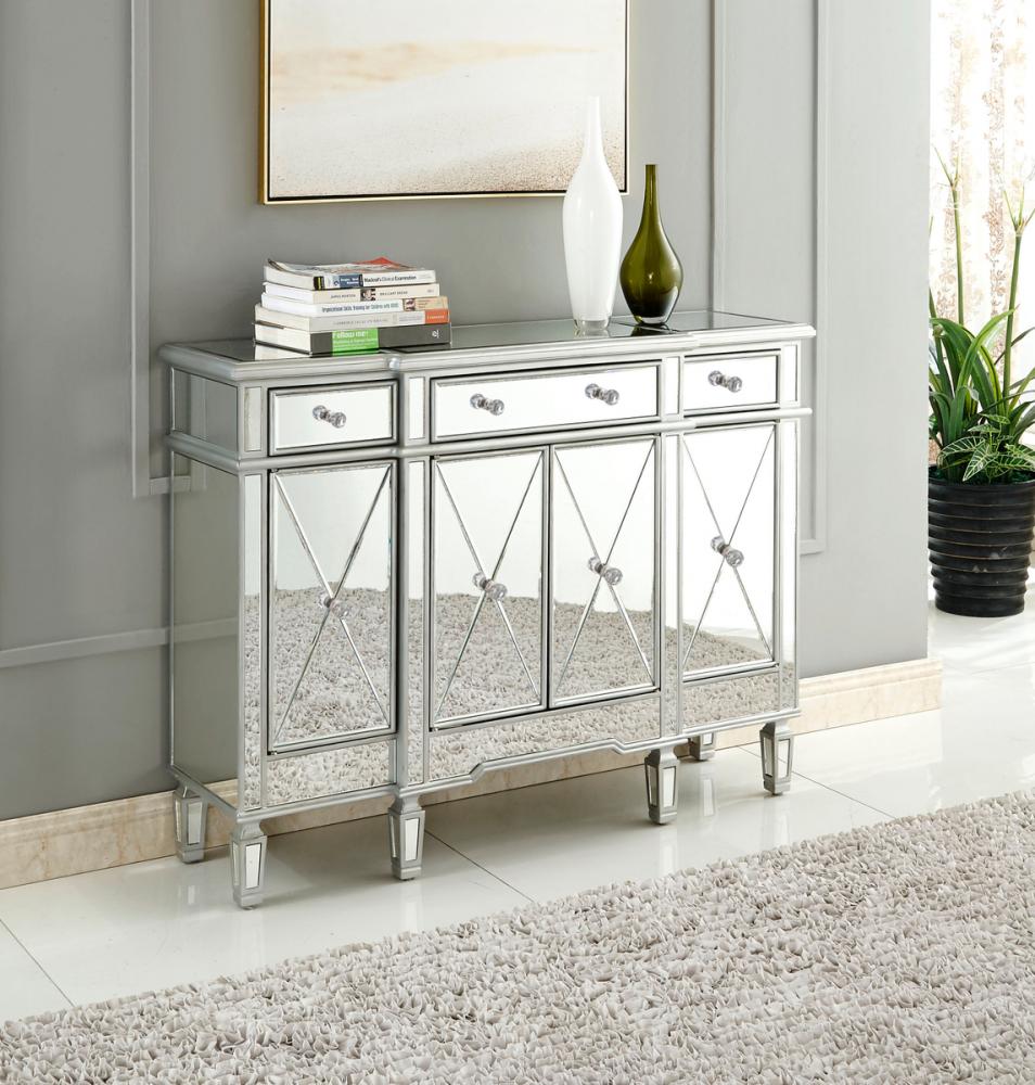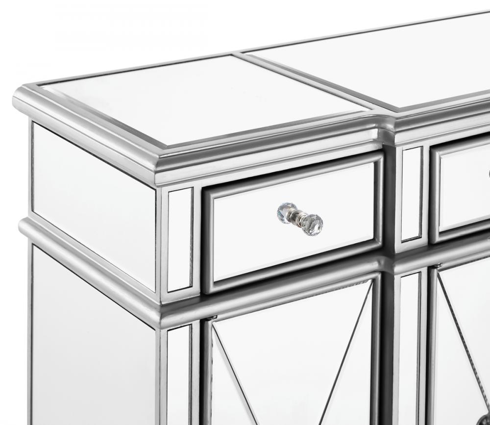 This fashionable, contemporary Mirrored console, with its hand-rubbed silver finish and incised carved, tapered legs, features a slight antique touch. Its 3 Mirrored drawers and 4 Mirrored door fronts are enhanced with brushed steel knobs. Measuring L48” x W14” x H36”, its alluring symmetry, size and shape make this piece perfect to magnify the beauty of your living room or add a touch of elegant decor to a hallway or narrow space. In addition, this attractive Mirrored cabinet offers you extra storage space and a wide display area for your art objects, figurines or candle holders. (Constructed with selected kiln-dried solid wood and engineered wood panels.)