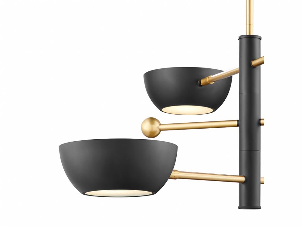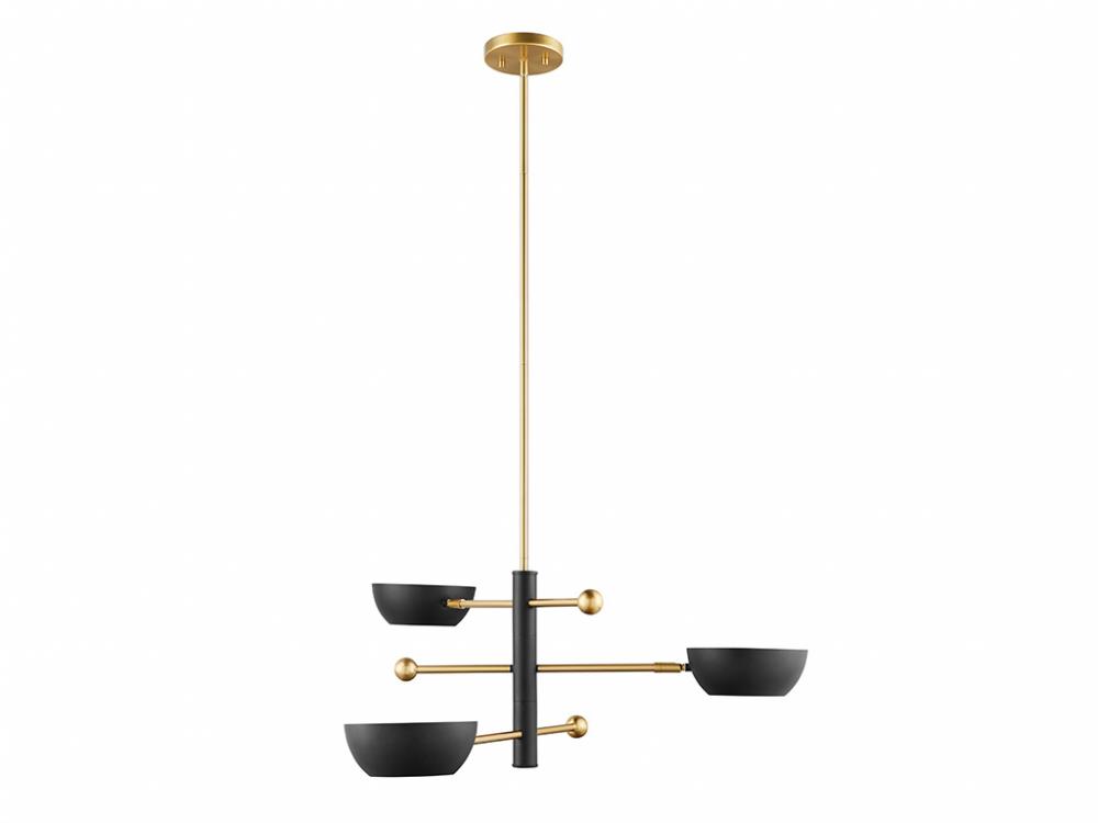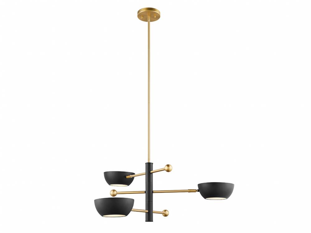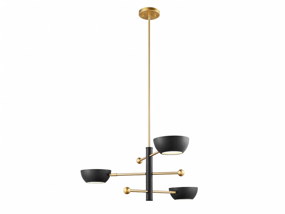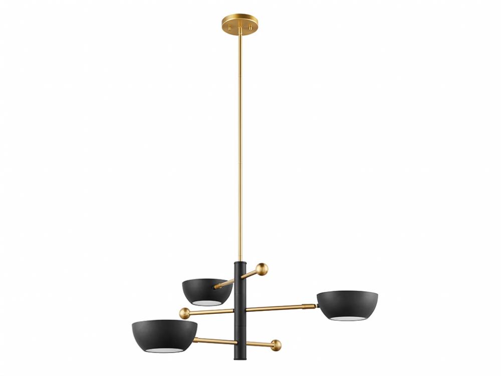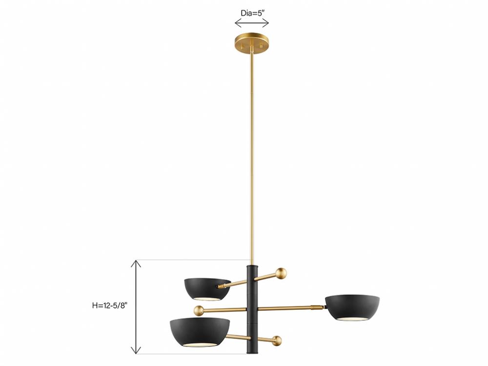 Bring this inventive 3-light pendant into your home and watch it become a conversation starter! The three lights are stacked atop one another on adjustable arms, allowing you to create a unique lighting look. Light shines above and below the Matte Black finished cups and the arms are finished in Natural Brass for two-tone appeal. It is 12" in height and 33.75" in width. Uses three candelabra size bulbs of up to 60 watts per bulb. Bulbs not included.