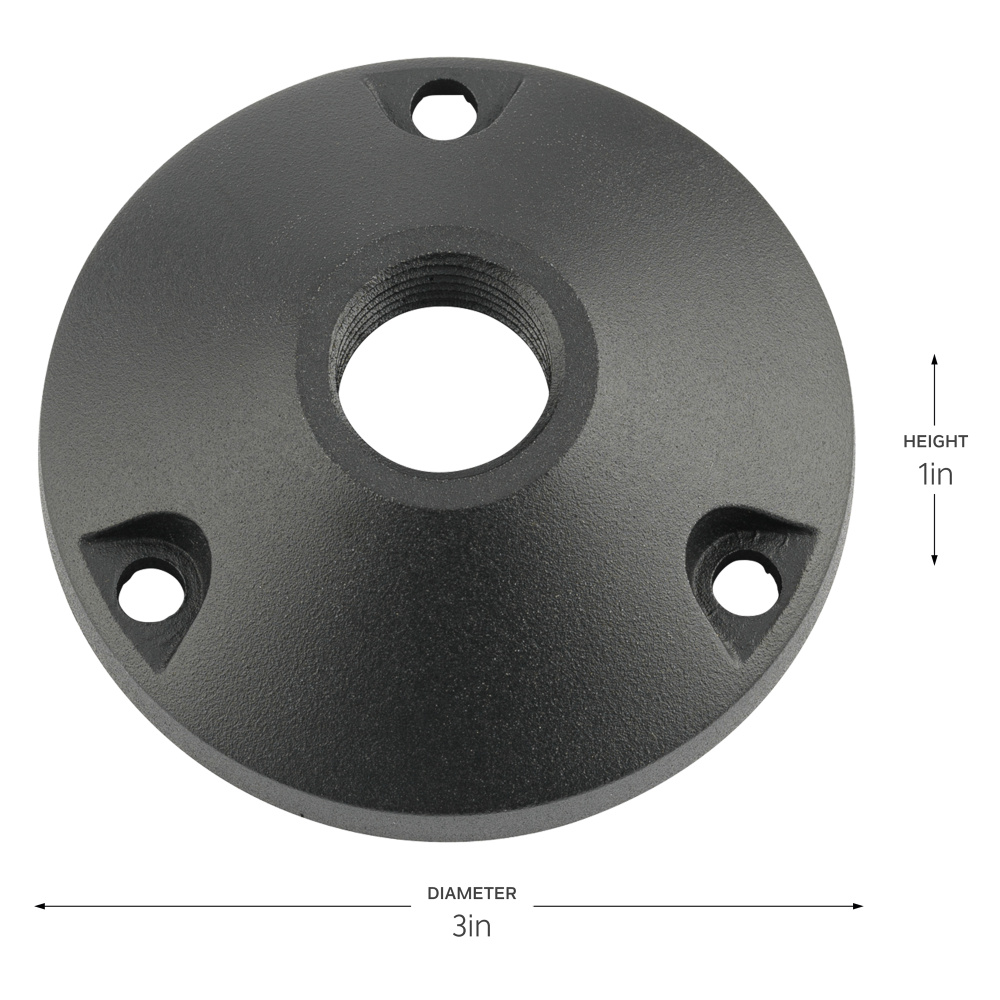 The 3-inch Round Mounting Base in Black Brass allows for mounting to a hard surface that will accept a screw, such as a deck or pergola. It accepts a half-inch Male Thread NPSM. All Kichler 12V low voltage landscape drop-in fixtures are compatible with a wide selection of Professional and Contractor Series LED Lamps and are a great economical choice for any design application.