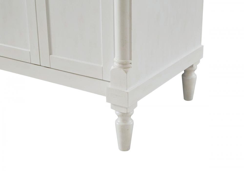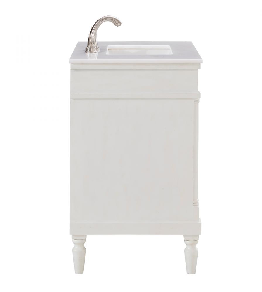 This Traditionally styled, yet fashionably designed vanity can add distinction and grace to your home or office bathroom. Beautifully combining a lustrous natural white marble countertop with a large rectangular white porcelain under mount sink, and a hand painted antique white 2-door cabinet with a shelf inside, brushed steel door pulls, standing on turned, tapering legs. You’ll enjoy its charming allure for many years to come. Measurements: W30” x D21” x H35”