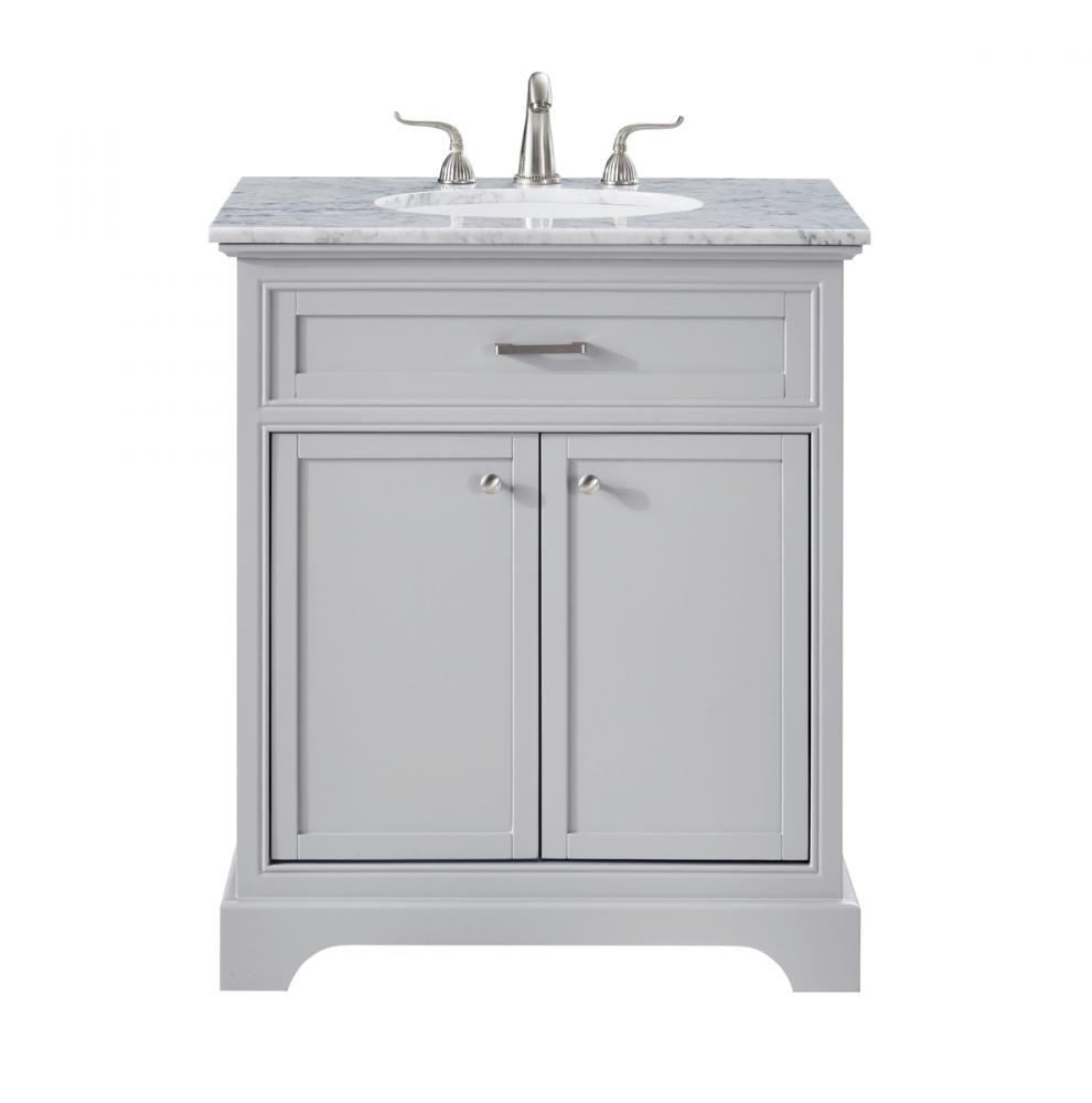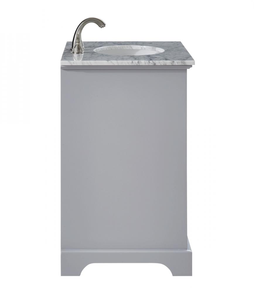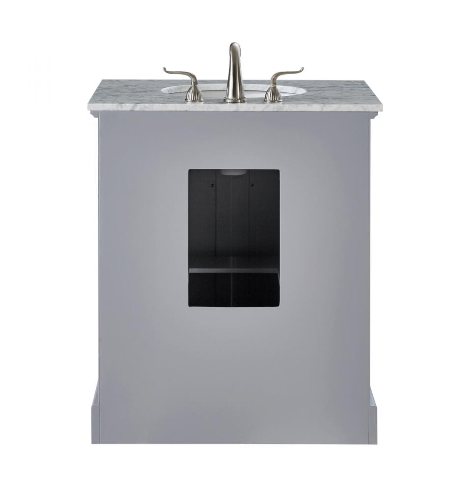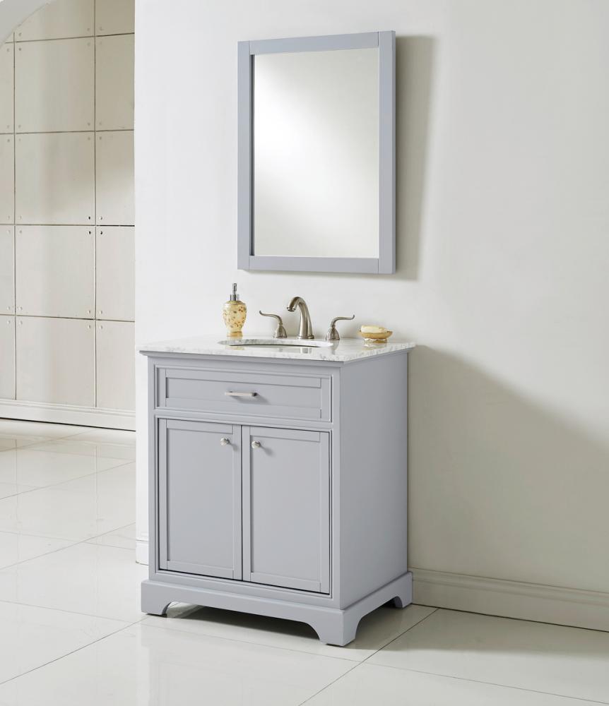 From its Italian Carrara white marble top to its contemporary-styled hand painted soft grey cabinet, this member of our “Americana” vanity collection is sure to enhance either your home or office bathroom. Beneath its lustrous, natural marble top and an oval, white porcelain under mount sink, a handsome 2-door cabinet with a Single shelf for all your bathroom essentials, highlighted with recessed panel doors, brushed steel bar handle and knobs, stands on strong solid pedestal feet. A wonderful balance of simplicity and practical function! Measurements: W30”xD21.5”xH35”