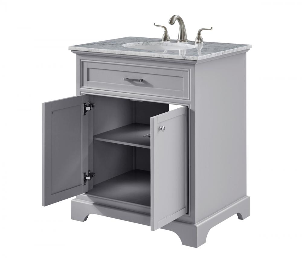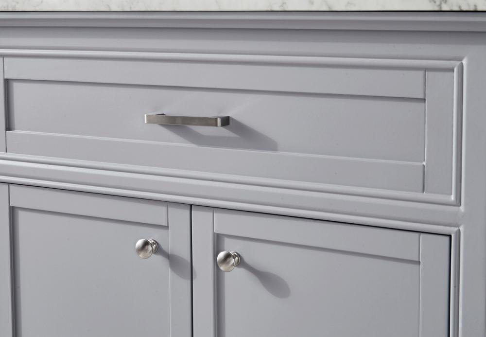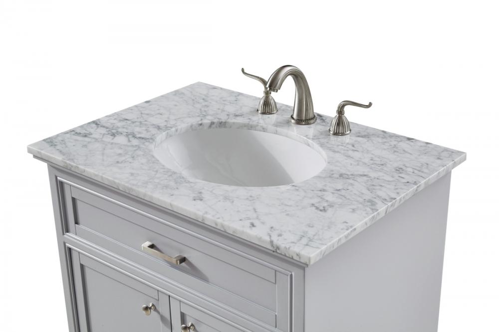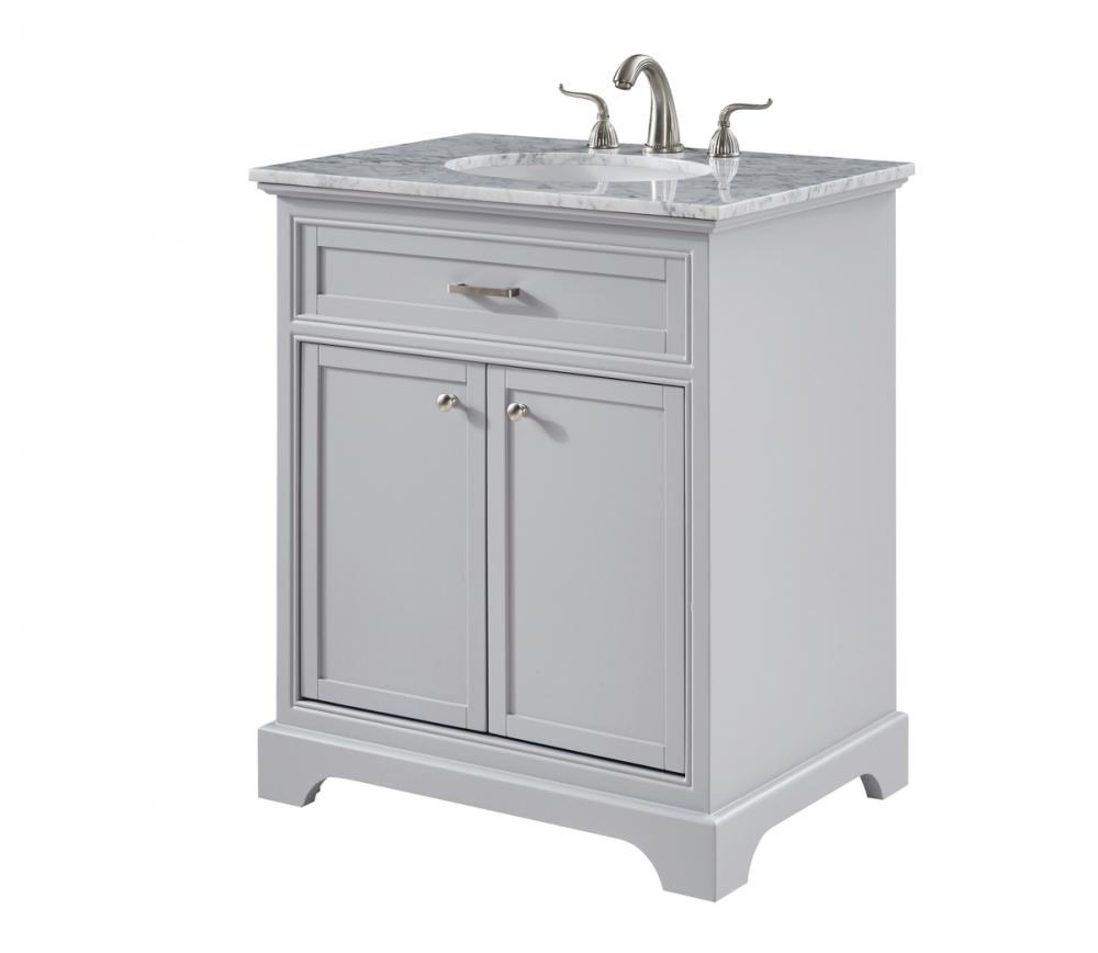 From its Italian Carrara white marble top to its contemporary-styled hand painted soft grey cabinet, this member of our “Americana” vanity collection is sure to enhance either your home or office bathroom. Beneath its lustrous, natural marble top and an oval, white porcelain under mount sink, a handsome 2-door cabinet with a Single shelf for all your bathroom essentials, highlighted with recessed panel doors, brushed steel bar handle and knobs, stands on strong solid pedestal feet. A wonderful balance of simplicity and practical function! Measurements: W30”xD21.5”xH35”