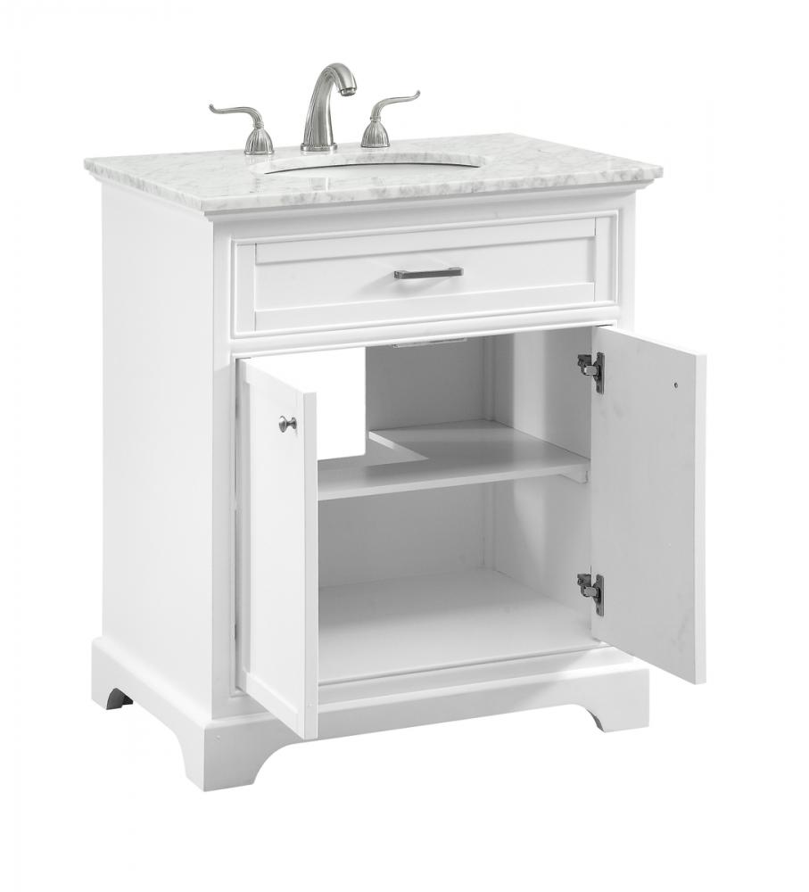 From its Italian Carrara white marble top to its contemporary-styled hand painted white cabinet, this member of our “Americana” vanity collection is sure to enhance either your home or office bathroom. Beneath its lustrous, natural marble top and an oval, white porcelain under mount sink, a handsome 2-door cabinet with a Single shelf for all your bathroom essentials, highlighted with recessed panel doors, brushed steel bar handle and knobs, stands on strong solid pedestal feet. A wonderful balance of simplicity and practical function! Measurements: W30”xD21.5”xH35”