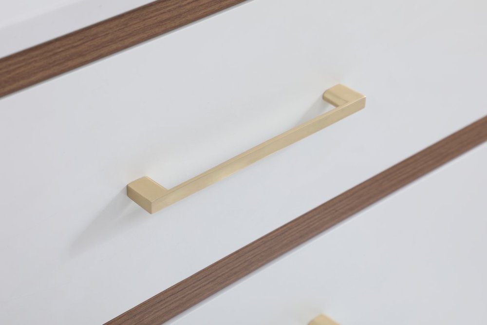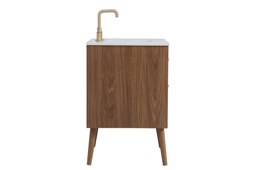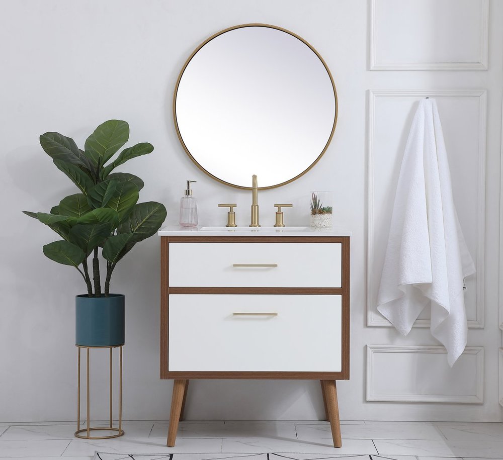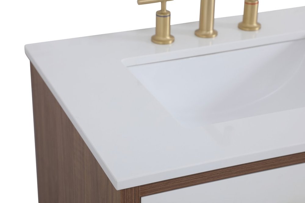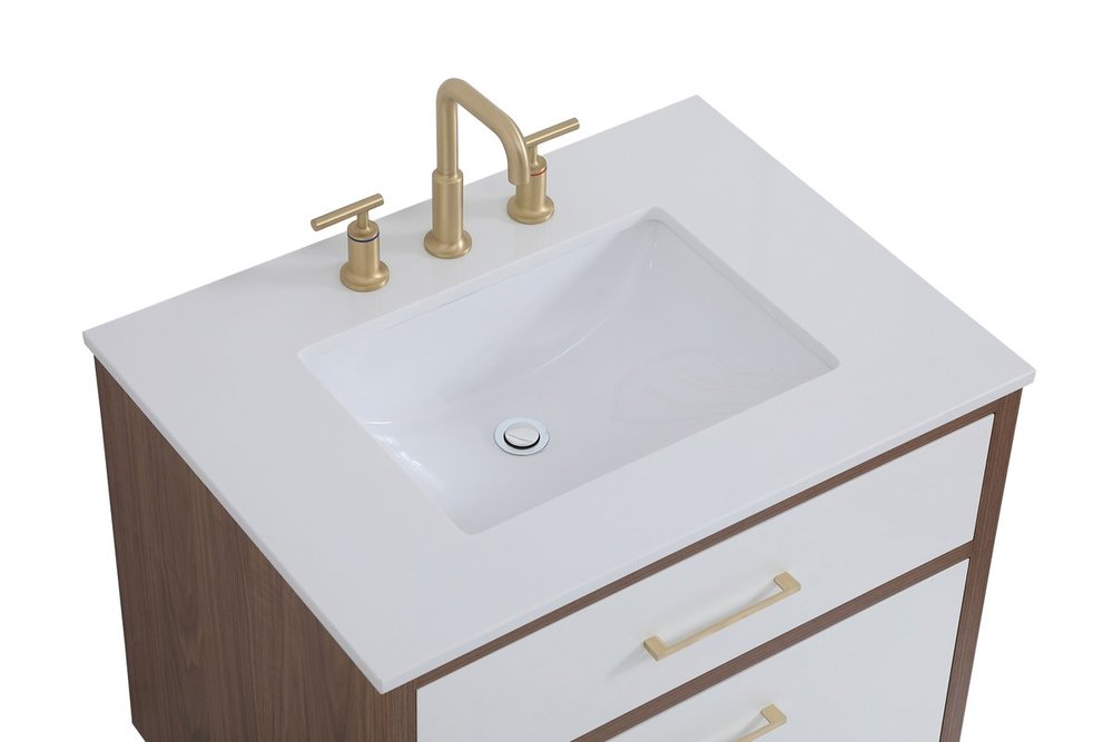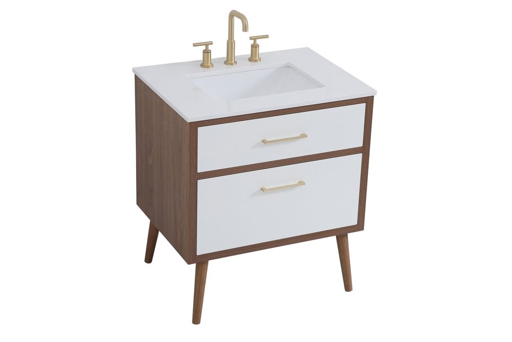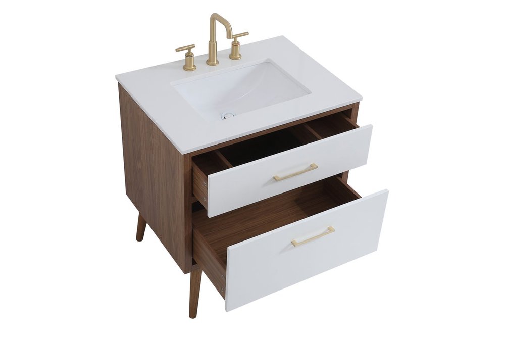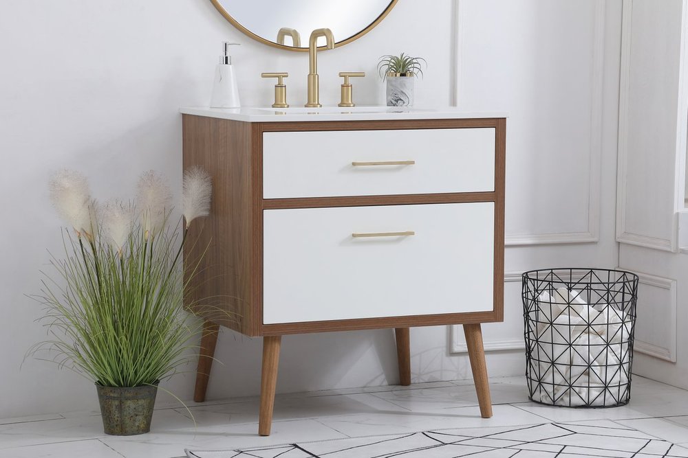 Delve into a world of minimalistic fashion and contemporary styling with this midcentury modern 30" vanity. The clean lines anchors the design, while the oblique tapered cylinder legs add subtle interest. However, the artful juxtaposition between the walnut brown and matte white creates a blend of bright modernity and classical traditions. A gold handle adorns the top fake drawer hiding the base of the undermount porcelain sink while another one allows you to pull the bottom drawer out, letting you store your bathroom necessities and toiletries. The compact size makes it the perfect vanity for any bathroom or powder room, regardless of size.