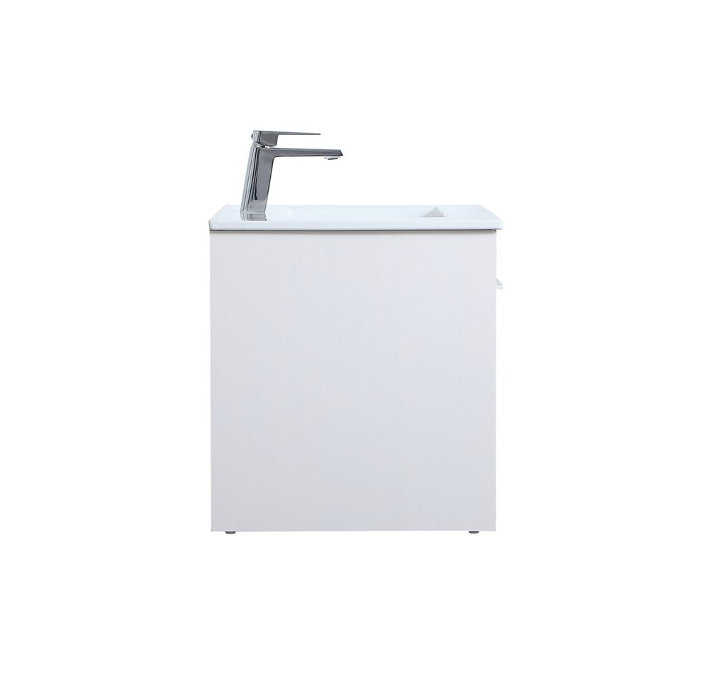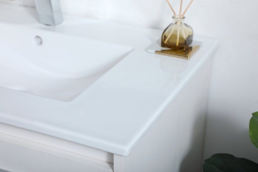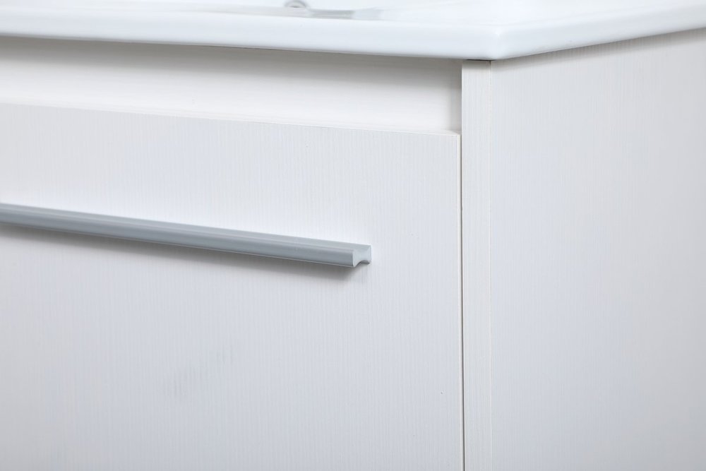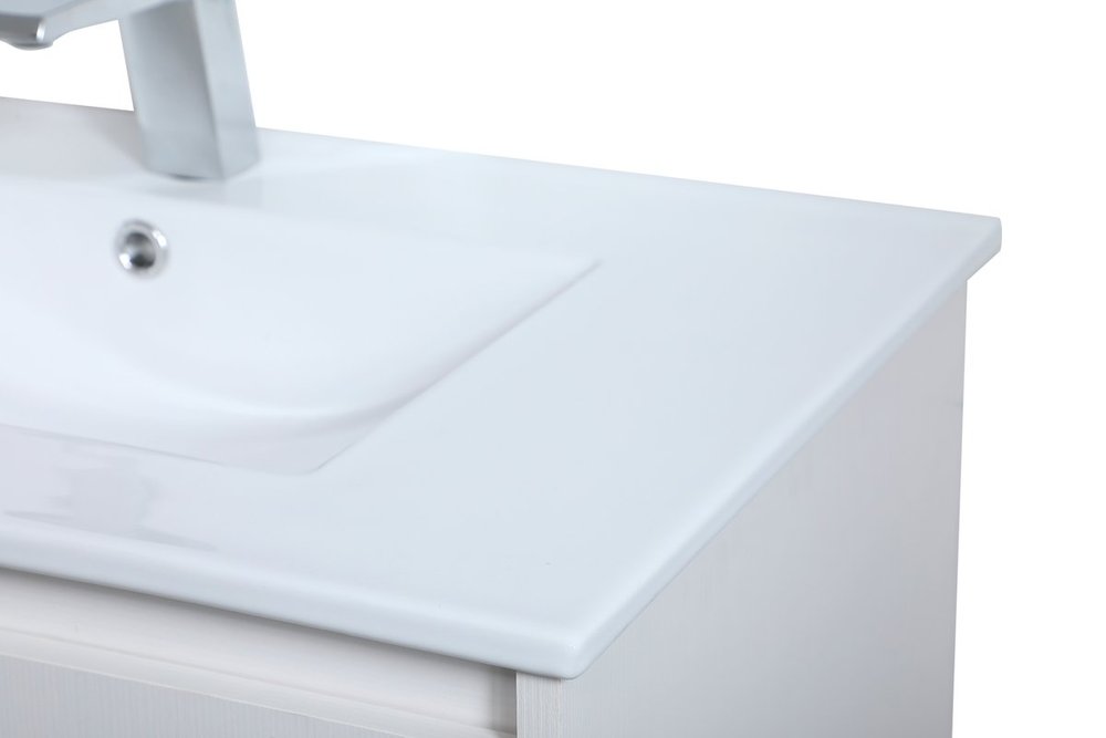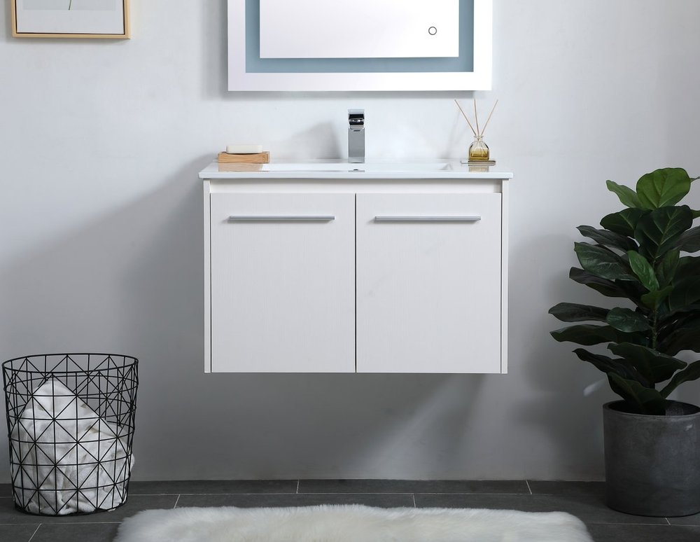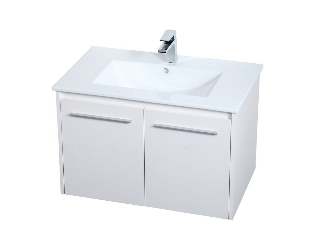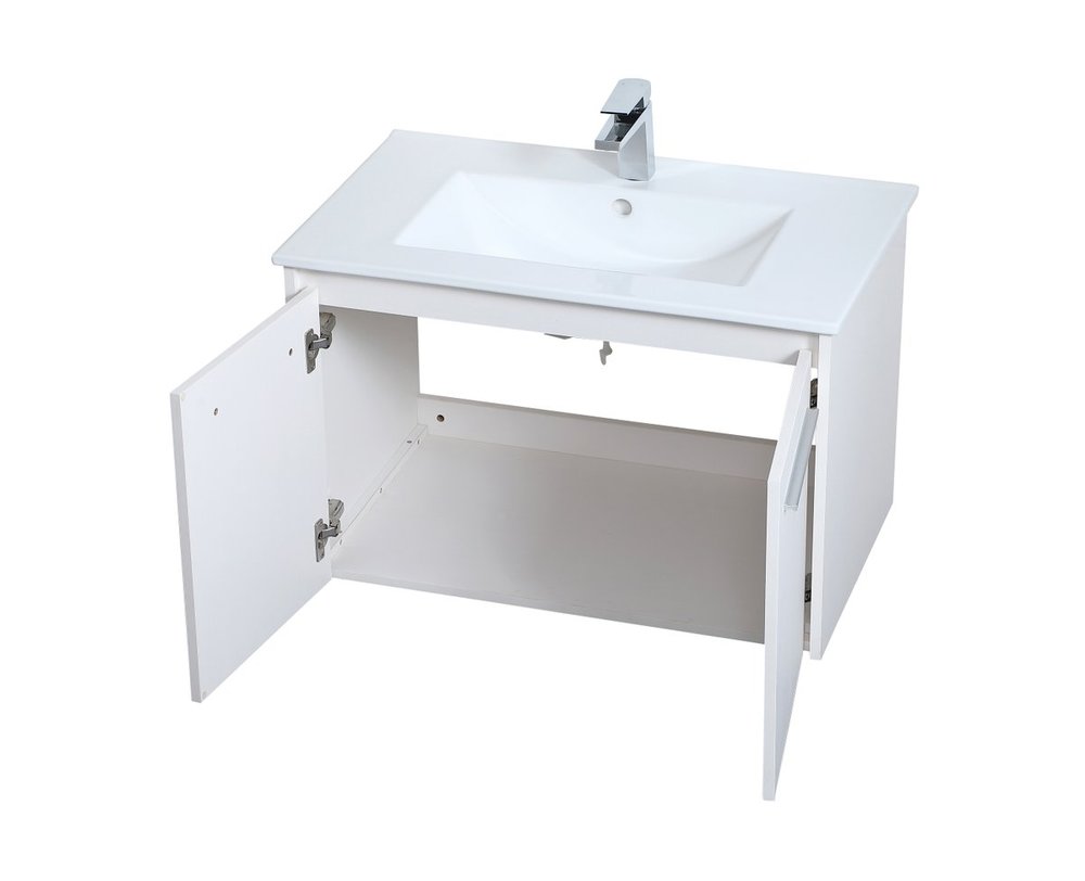 The contemporary simplicity of this 30" floating vanity in a white finish will help open the space and add stunning modern flair to your bathroom or powder room. The open space below makes it easy to show off your tiles and to clean the floor with ease--it's also the perfect place for a hamper. Double doors open to reveal plentiful of storage pace to store all of your bathroom miscellany. The clean lines that permeate through the design will surely create a fresh look in your home.
