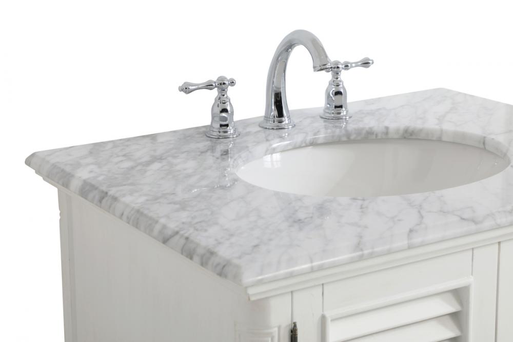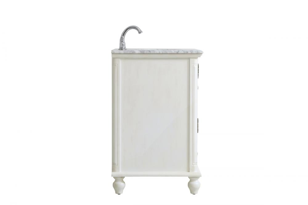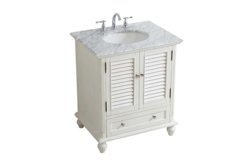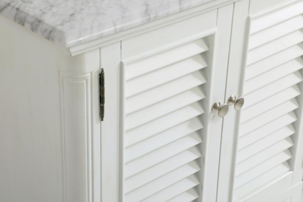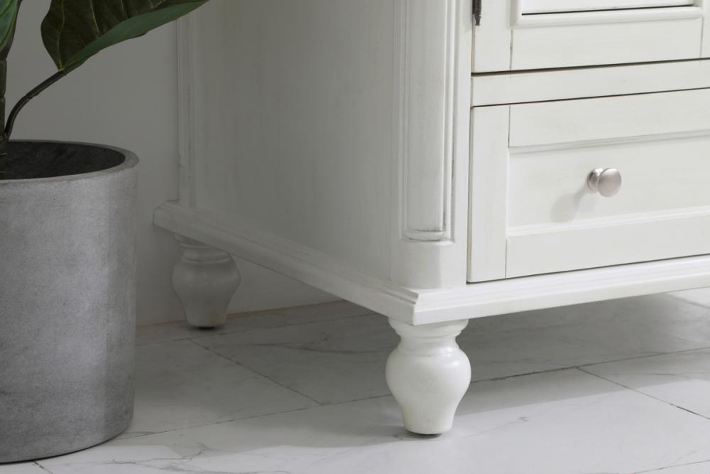 Never compromise beauty--the Rhodes collection stunning vanity in an antique white finish will add lovely sophistication and complement any bathroom or powder room, while utilizing its charm and function to provide you with ample storage spaces. Brushed nickel knobs gently adorn the shuttered cabinet doors and drawer at the base, allowing for you to store away your bathroom essentials. The Carrara white marble countertop, porcelain undermount sink, dignified subtle engravings on the side edges, and rounded legs all come together to create contemporary beauty. Work with your space, and design a beautiful room, no matter the size.