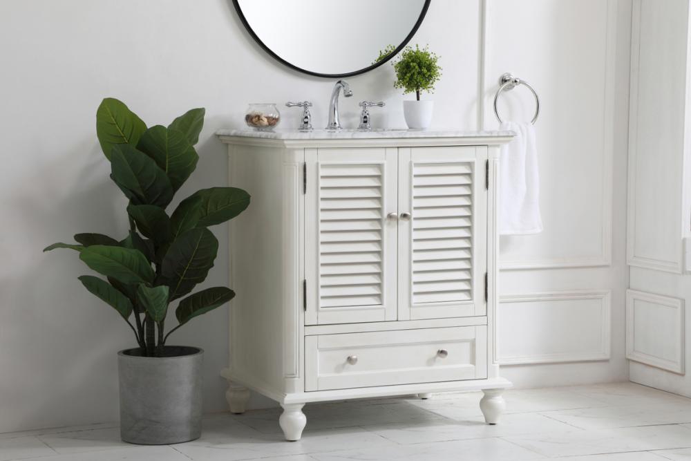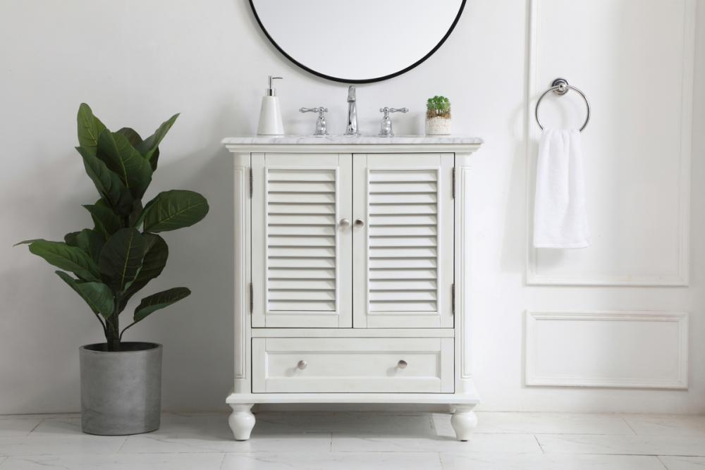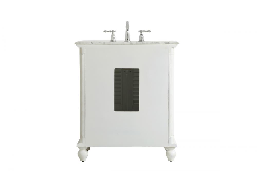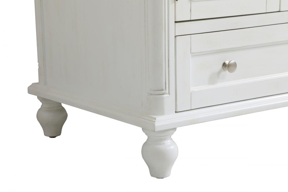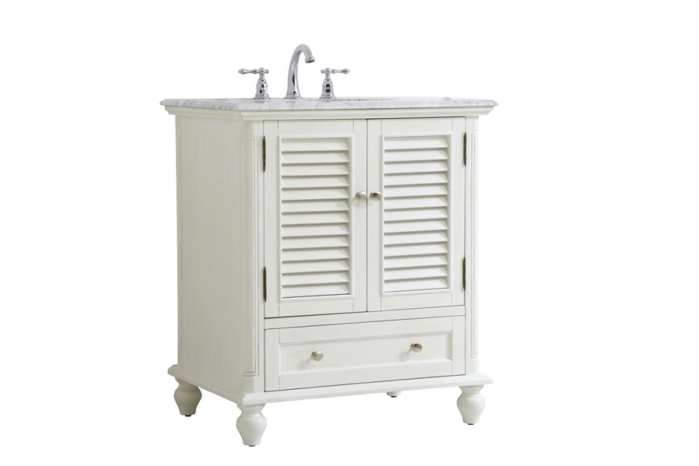 Never compromise beauty--the Rhodes collection stunning vanity in an antique white finish will add lovely sophistication and complement any bathroom or powder room, while utilizing its charm and function to provide you with ample storage spaces. Brushed nickel knobs gently adorn the shuttered cabinet doors and drawer at the base, allowing for you to store away your bathroom essentials. The Carrara white marble countertop, porcelain undermount sink, dignified subtle engravings on the side edges, and rounded legs all come together to create contemporary beauty. Work with your space, and design a beautiful room, no matter the size.