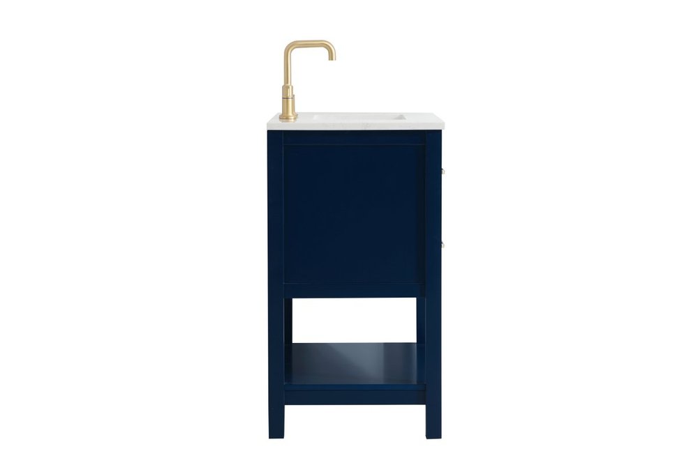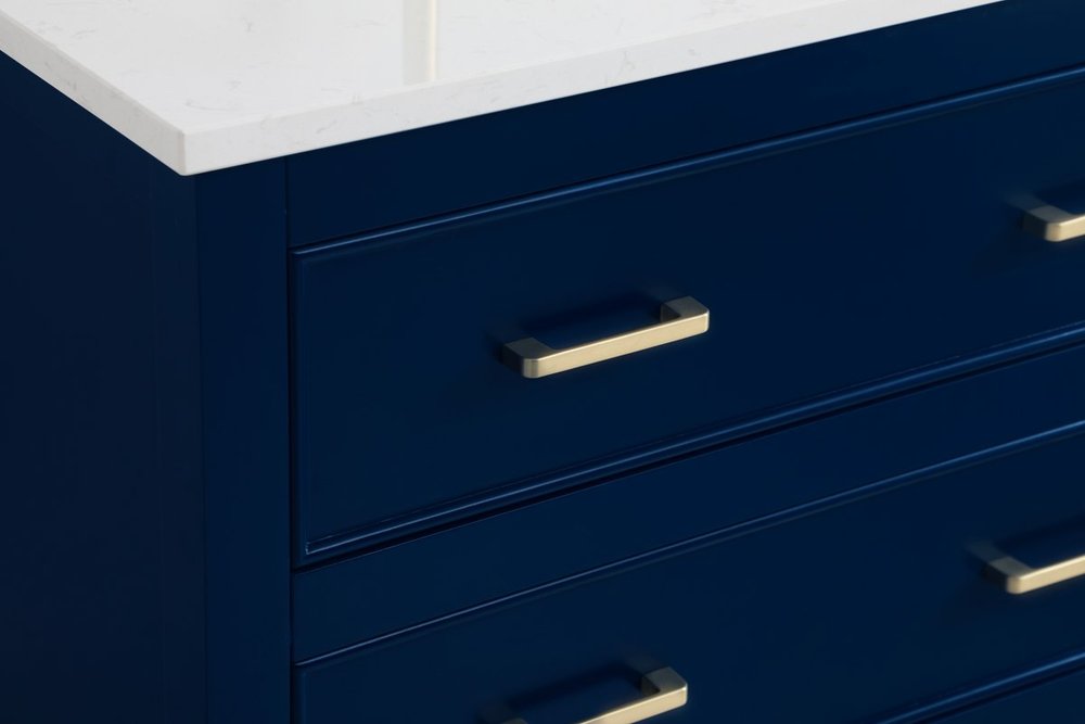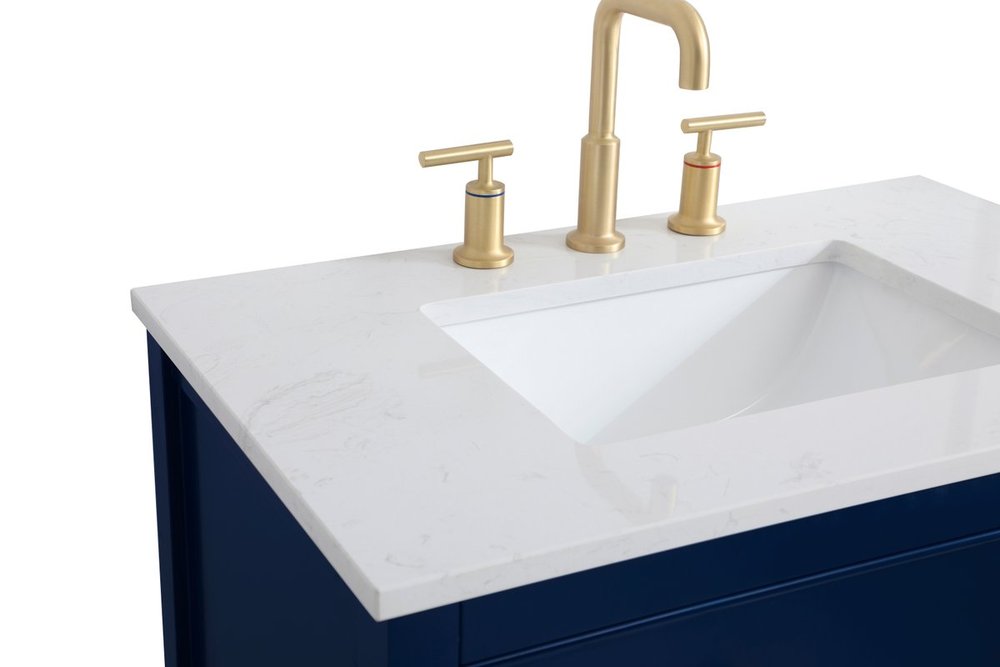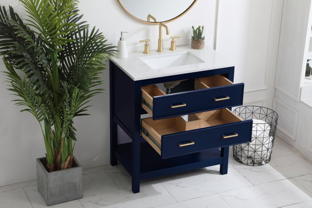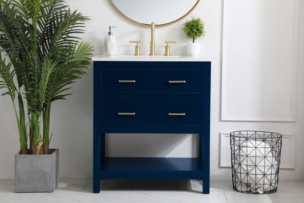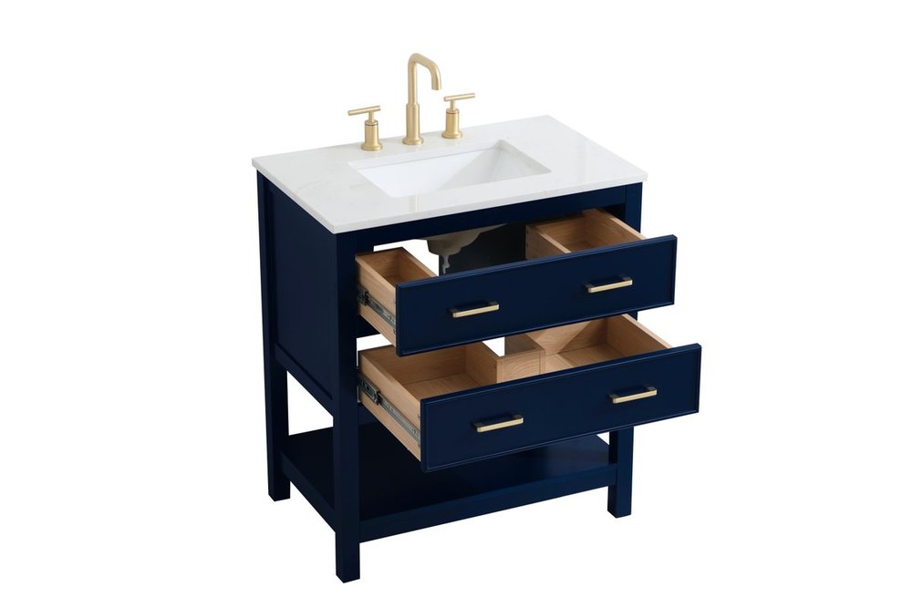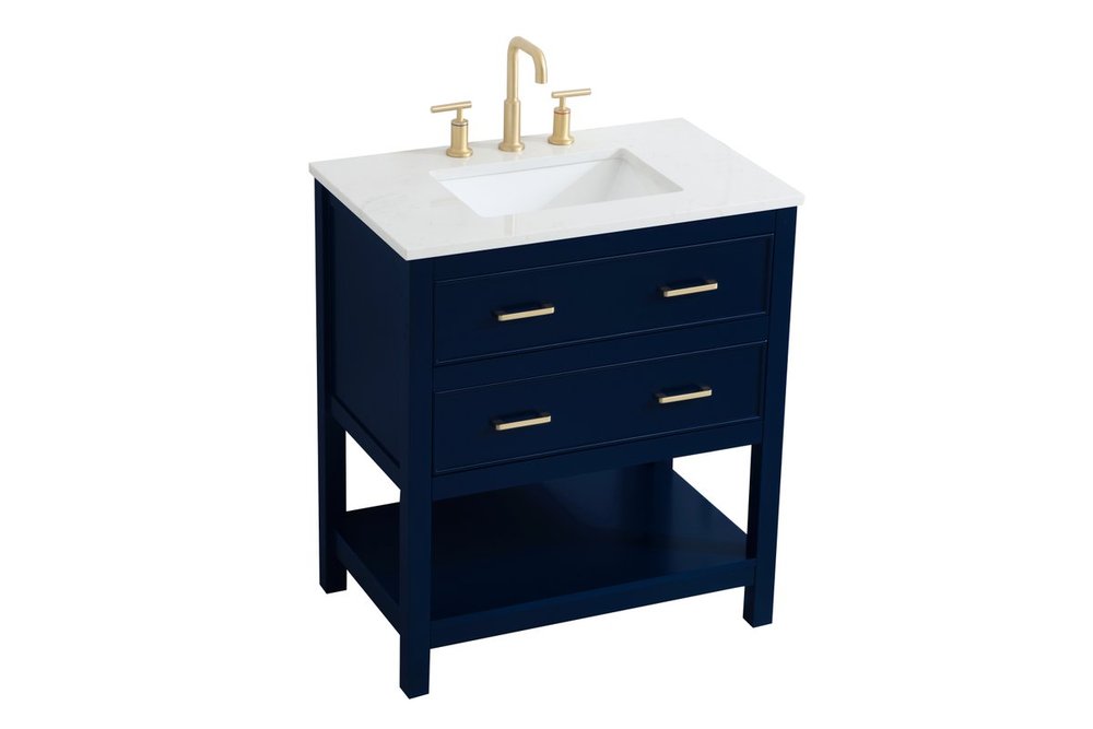 Make the most of your space with this 30" traditional style bathroom vanity. Its traditional style is able to complement many aesthetics with its blue finish, Calacatta engineered marble countertop, and the contemporary slender gold finish handle bar that sits on the two u-shaped drawers, allowing you to store an assortment of bathroom essentials. The lower shelf makes it the perfect space to hold new towels for your guests. This compact vanity ensures both form and function in your bathroom or powder room for you and your guests.