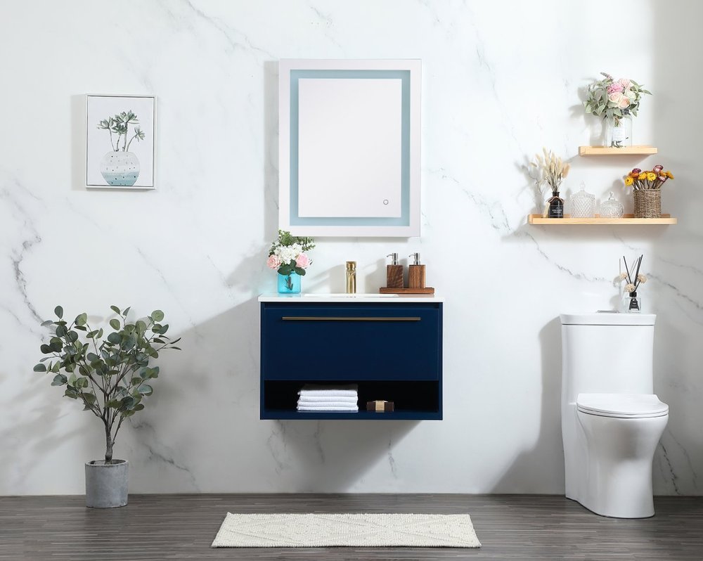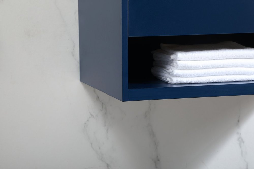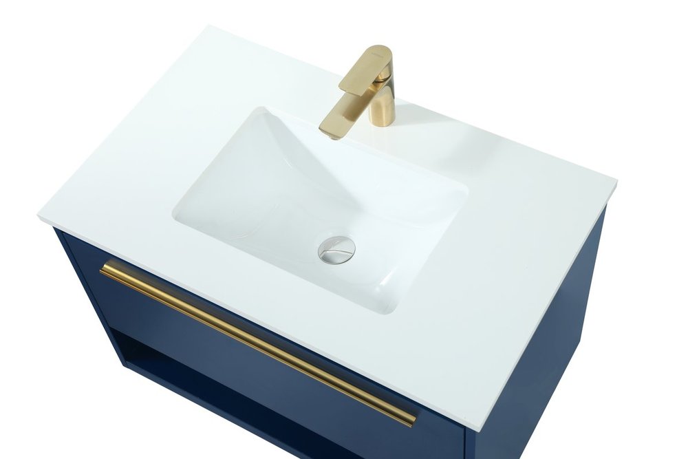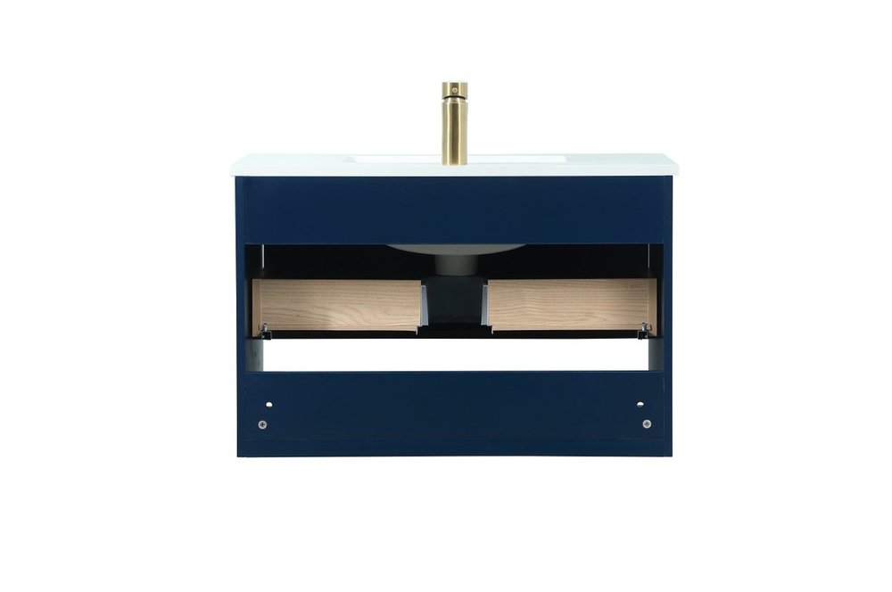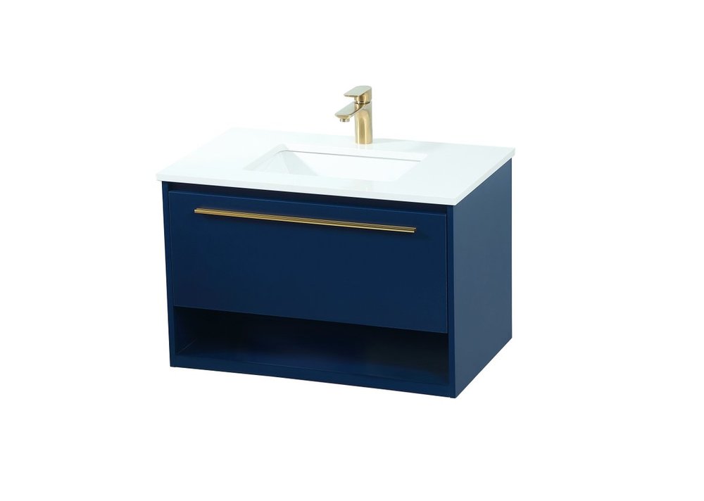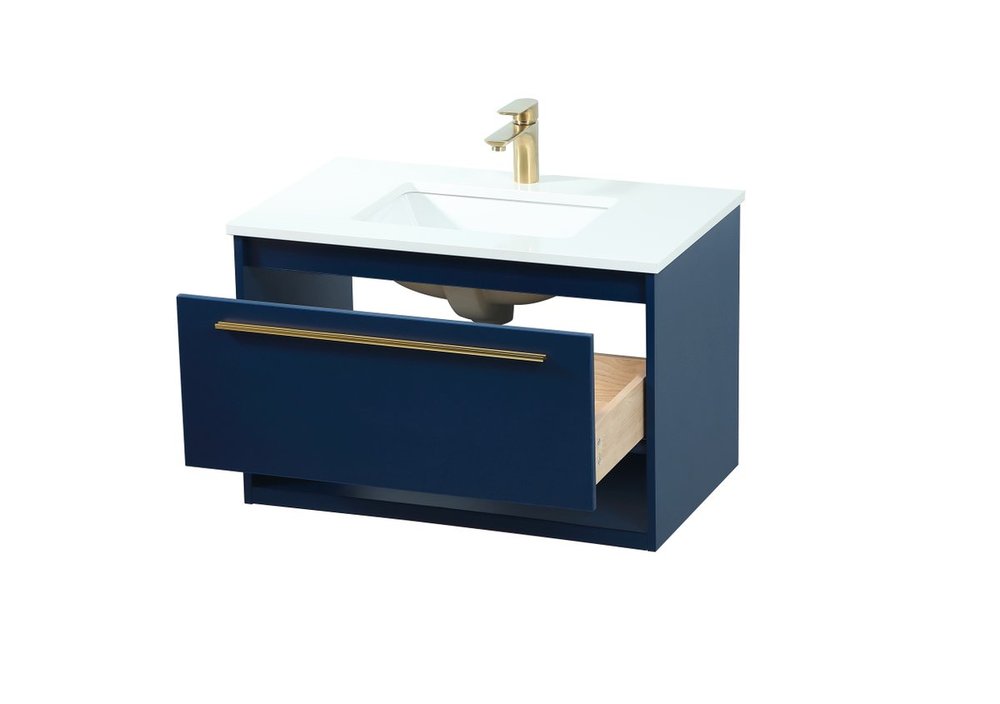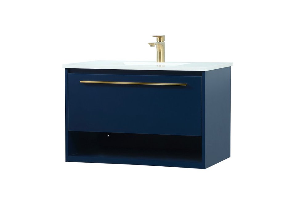 Save space and make your bathroom appear bigger with this floating vanity. Its minimal design will have you in awe, while its clean lines will leave your room feeling fresh and uncluttered. The Single u-drawer pulls out for storage while the open space below allows you to place extra towels or various other essentials. The ivory white engineered marble counter top with porcelain sink adds refined luxe while the aluminum barpull style handle adorn the vanity face.