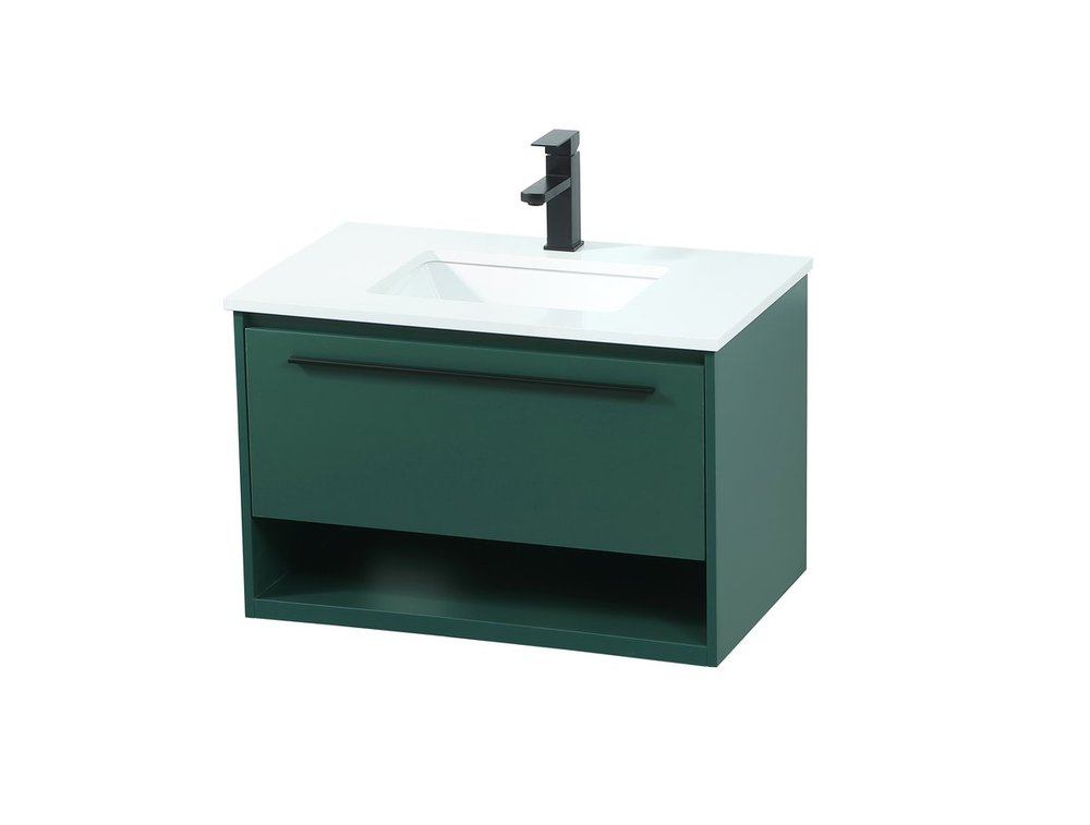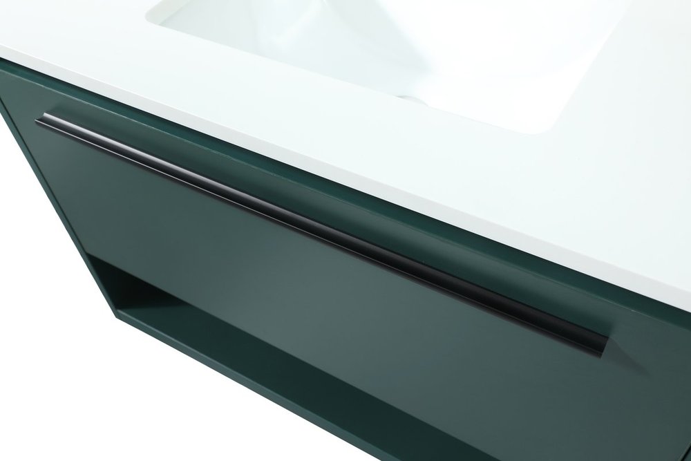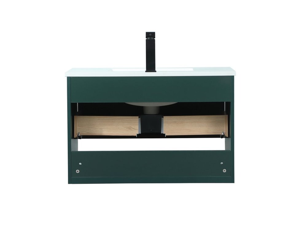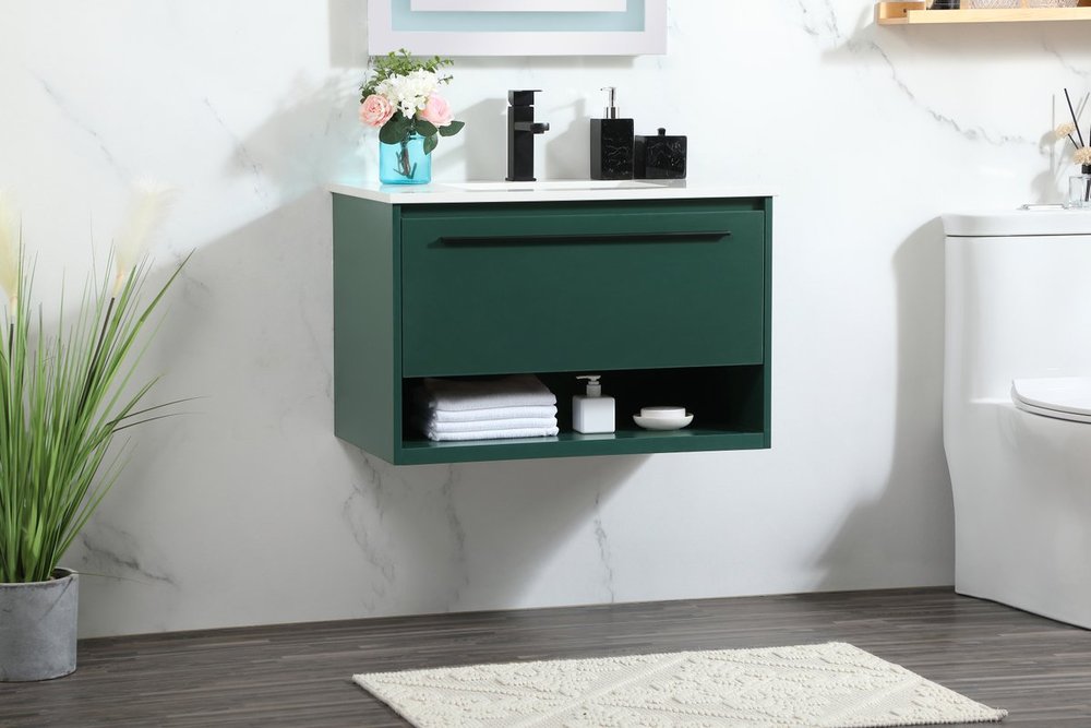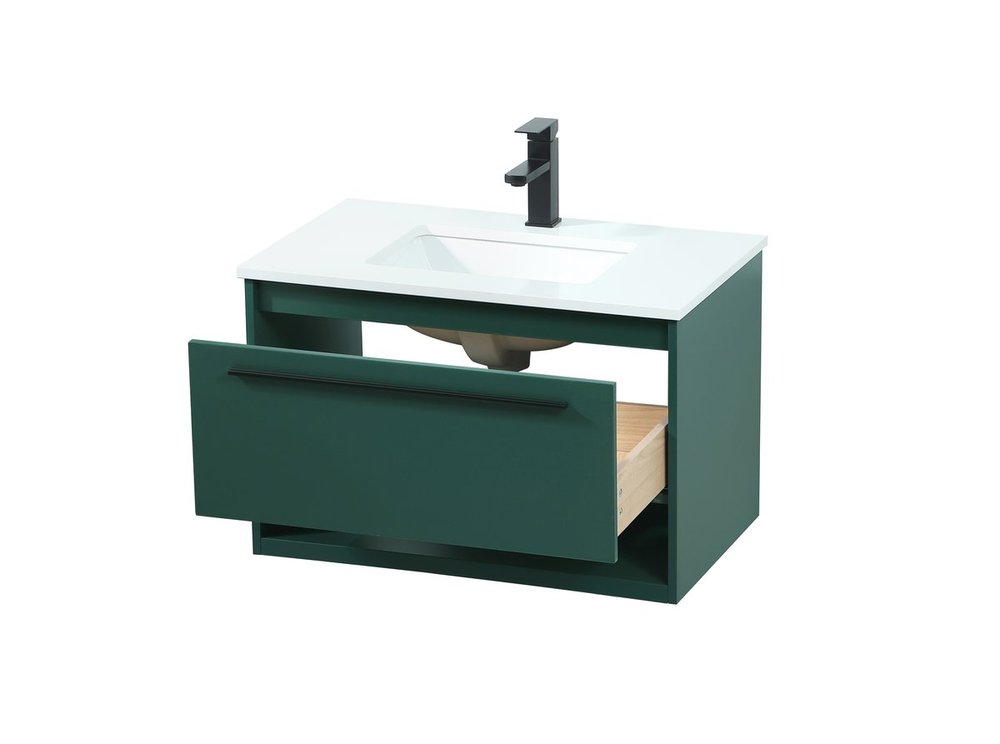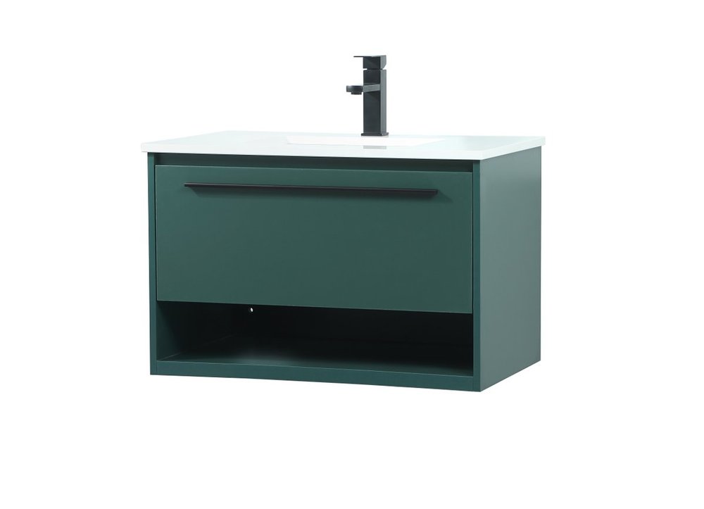 Save space and make your bathroom appear bigger with this floating vanity. Its minimal design will have you in awe, while its clean lines will leave your room feeling fresh and uncluttered. The Single u-drawer pulls out for storage while the open space below allows you to place extra towels or various other essentials. The ivory white engineered marble counter top with porcelain sink adds refined luxe while the aluminum barpull style handle adorn the vanity face.