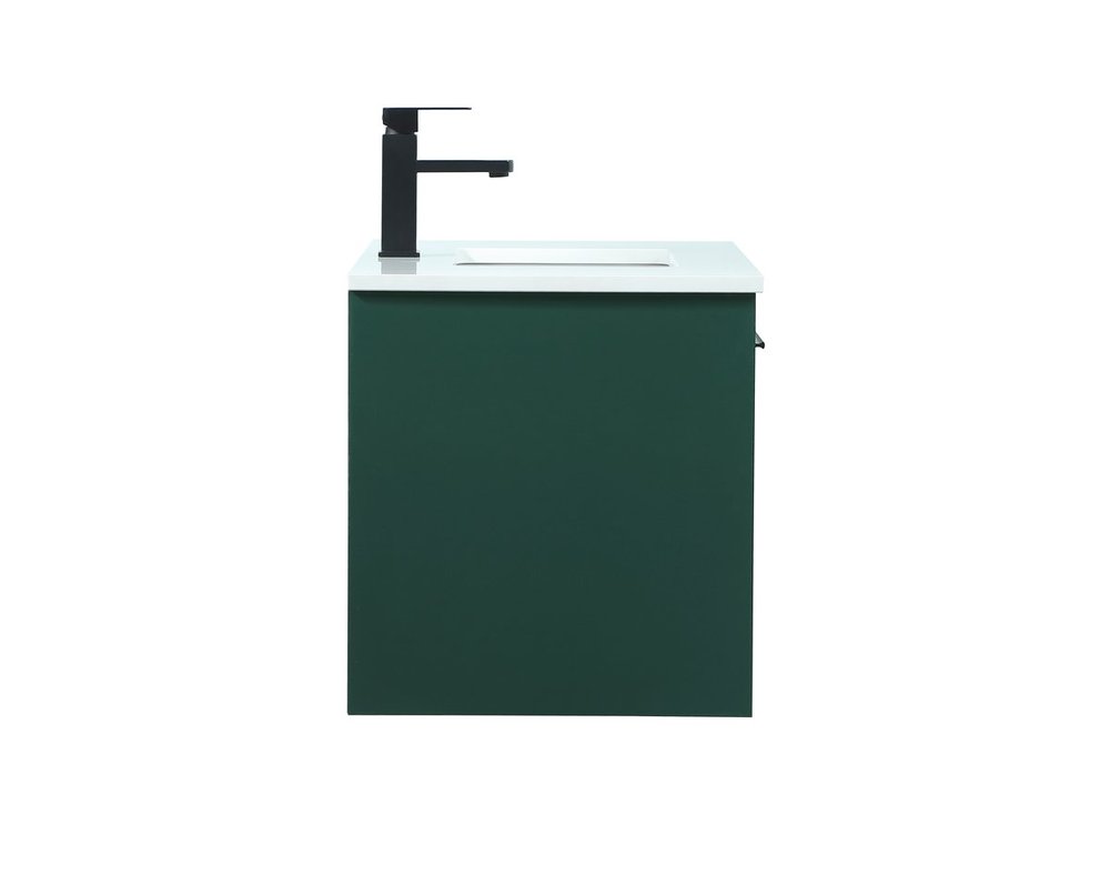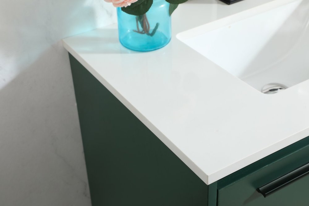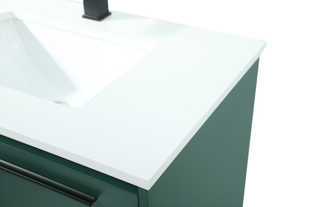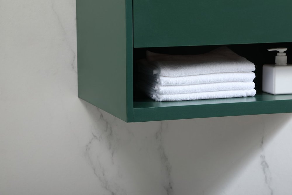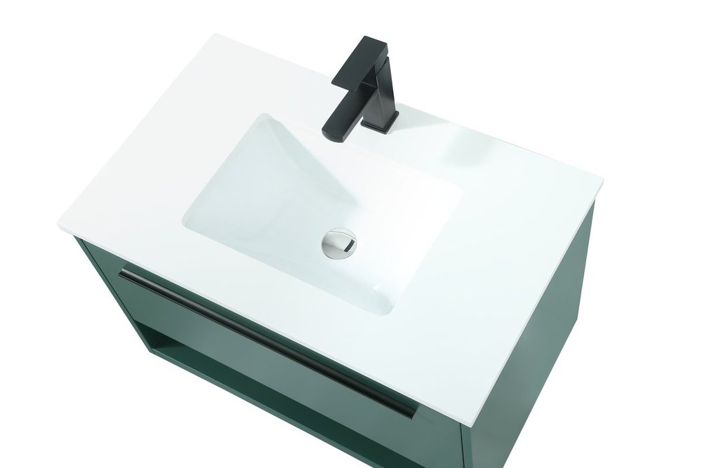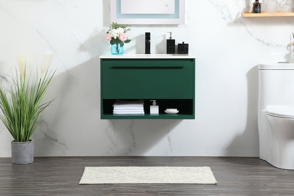 Save space and make your bathroom appear bigger with this floating vanity. Its minimal design will have you in awe, while its clean lines will leave your room feeling fresh and uncluttered. The Single u-drawer pulls out for storage while the open space below allows you to place extra towels or various other essentials. The ivory white engineered marble counter top with porcelain sink adds refined luxe while the aluminum barpull style handle adorn the vanity face.