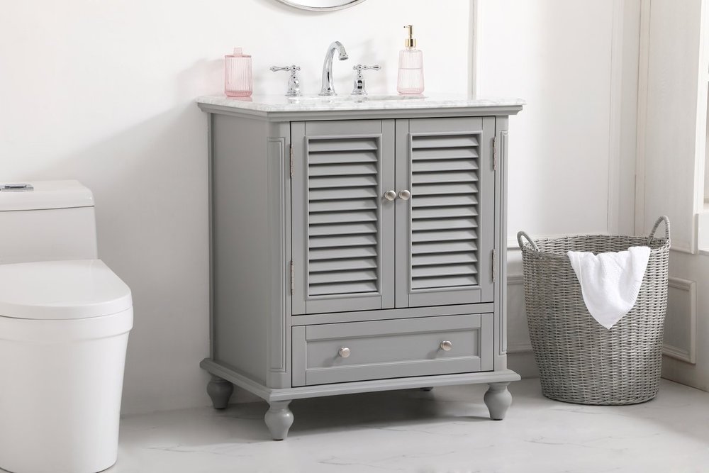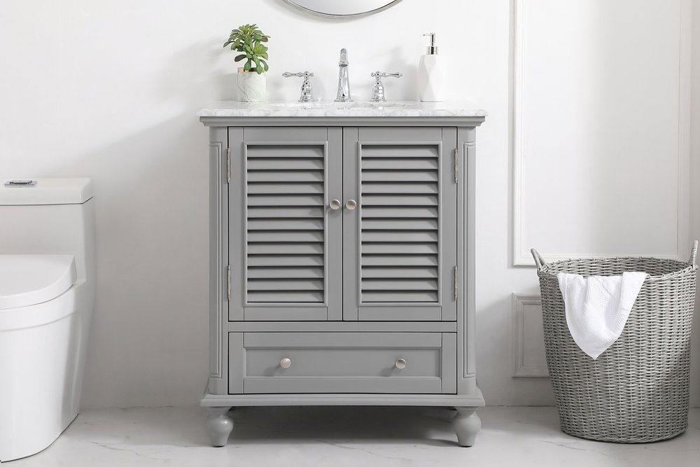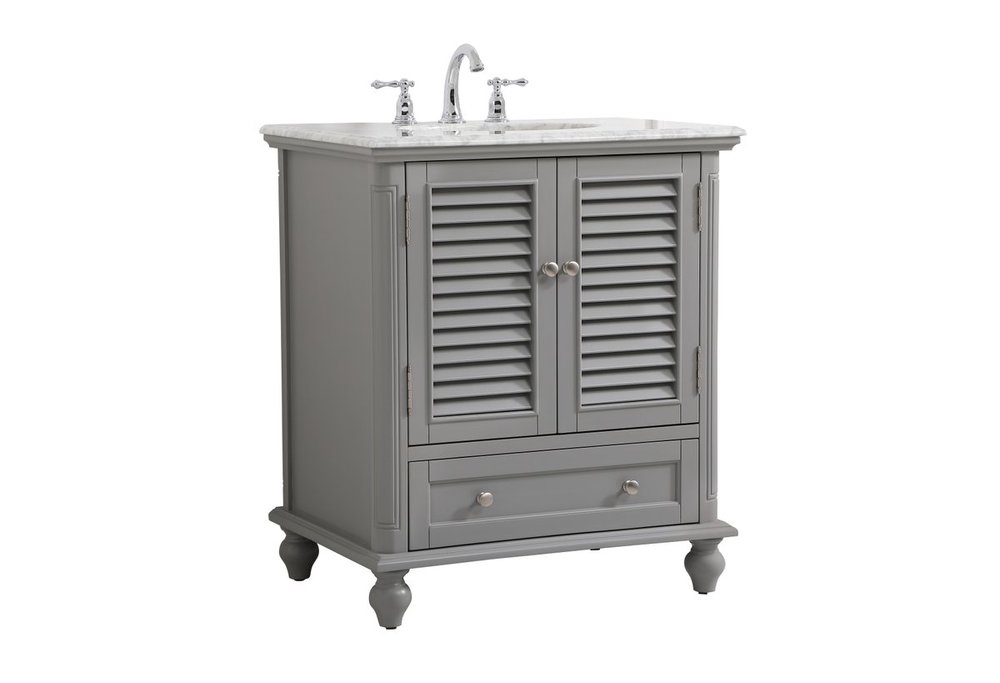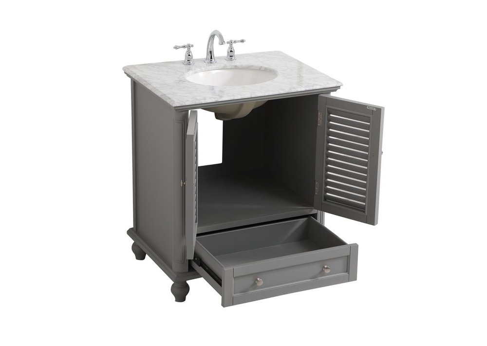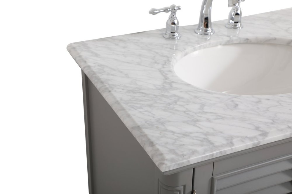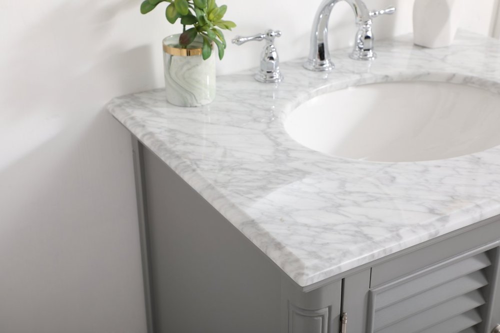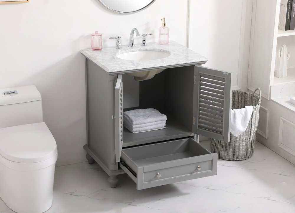 A small space doesn't mean you have to settle for less. The Rhodes collection compact vanity will add lovely sophistication and complement any small bathroom or powder room, while utilizing its charm and function to provide you with ample storage spaces. Metal round knobs gently adorn the shuttered cabinet door and drawer at the base, allowing for you to store away your bathroom essentials. The Carrara white marble countertop, porcelain undermount sink, dignified subtle engravings on the side edges, and rounded legs all come together to create contemporary beauty. Work with your space, and design a beautiful room, no matter the size.
