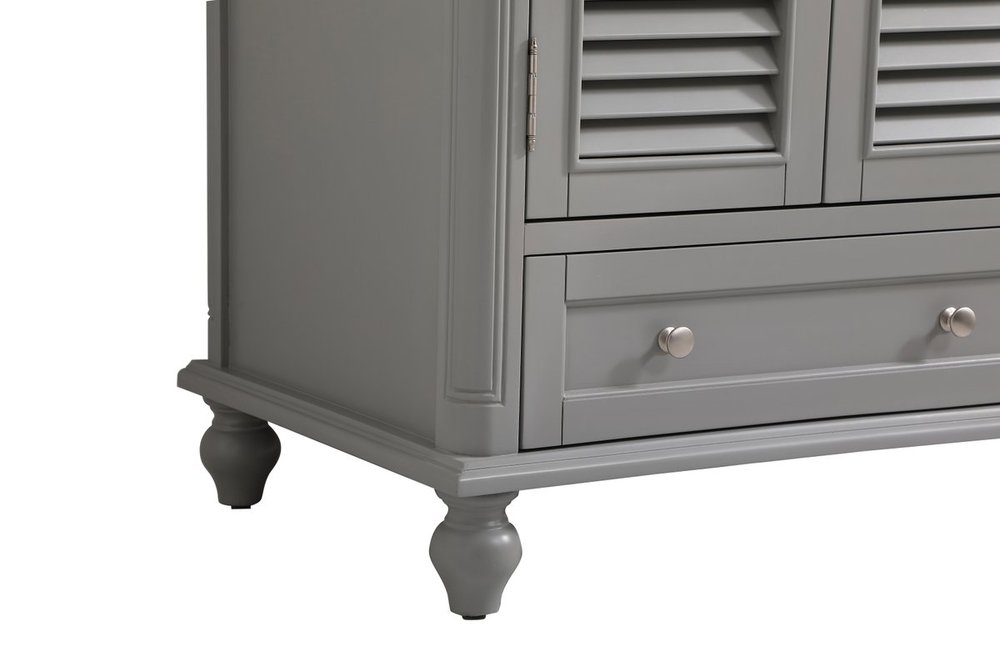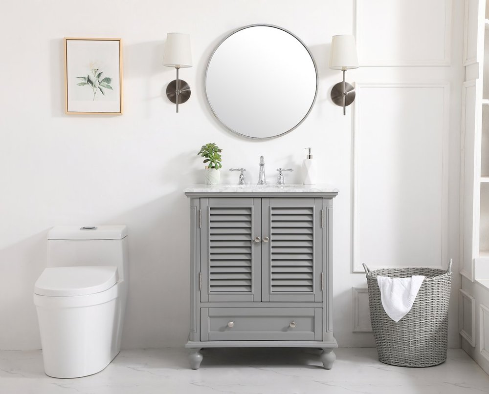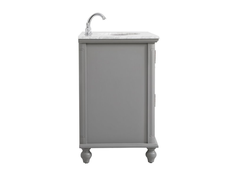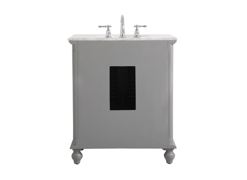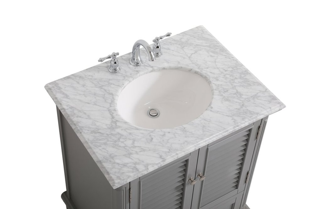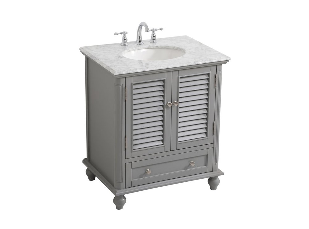 A small space doesn't mean you have to settle for less. The Rhodes collection compact vanity will add lovely sophistication and complement any small bathroom or powder room, while utilizing its charm and function to provide you with ample storage spaces. Metal round knobs gently adorn the shuttered cabinet door and drawer at the base, allowing for you to store away your bathroom essentials. The Carrara white marble countertop, porcelain undermount sink, dignified subtle engravings on the side edges, and rounded legs all come together to create contemporary beauty. Work with your space, and design a beautiful room, no matter the size.