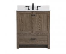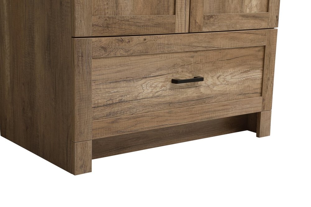 Delve into a world of minimalistic fashion and contemporary styling with this farmhouse 30" vanity. The clean faux lines anchors the weathered design. Black handle adorns the two doors hiding the base of the integrated porcelain sink while the bottom drawer allows you to store your bathroom necessities and toiletries. The compact size makes it the perfect vanity for any bathroom or powder room, regardless of size.