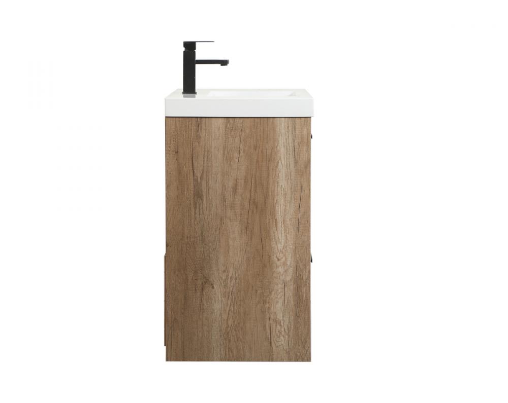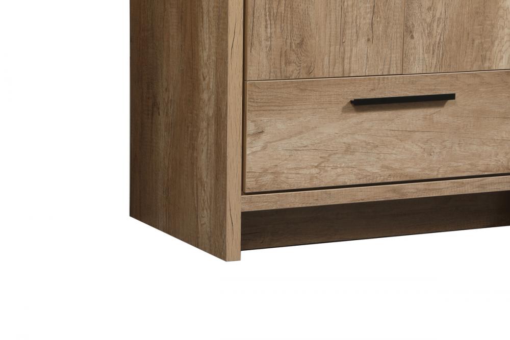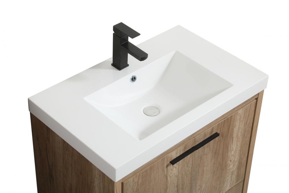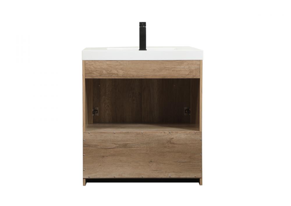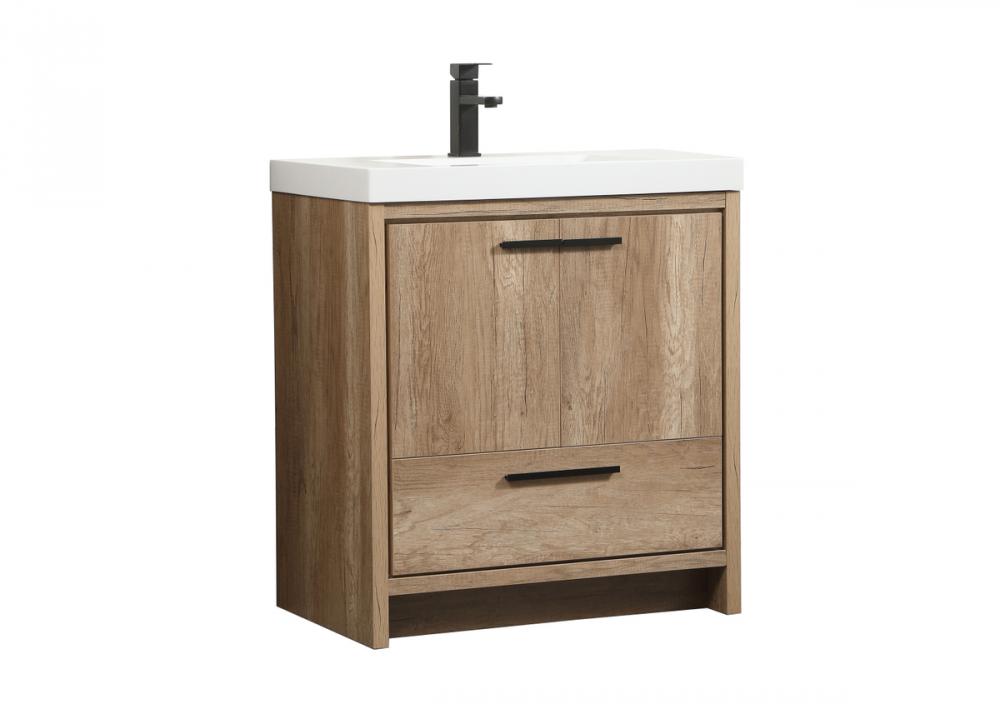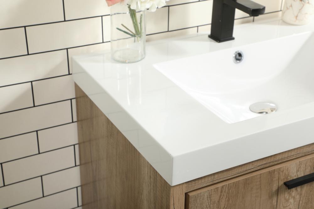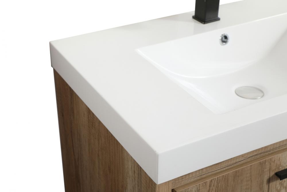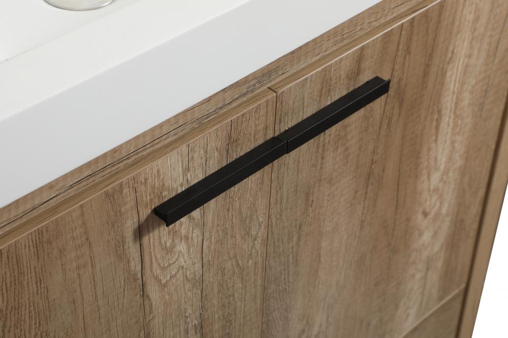 Modern sophistication is defined within the wood finish look and black barpulls of this vanity. Its length makes it the perfect addition to any sized home, and saves space with its storage area hidden behind the double cabinet doors and one bottom drawers. Topped with a highly durable thick resin white counter top and an integrated sink, this modern design will add everlasting class to your bathroom and powder room.