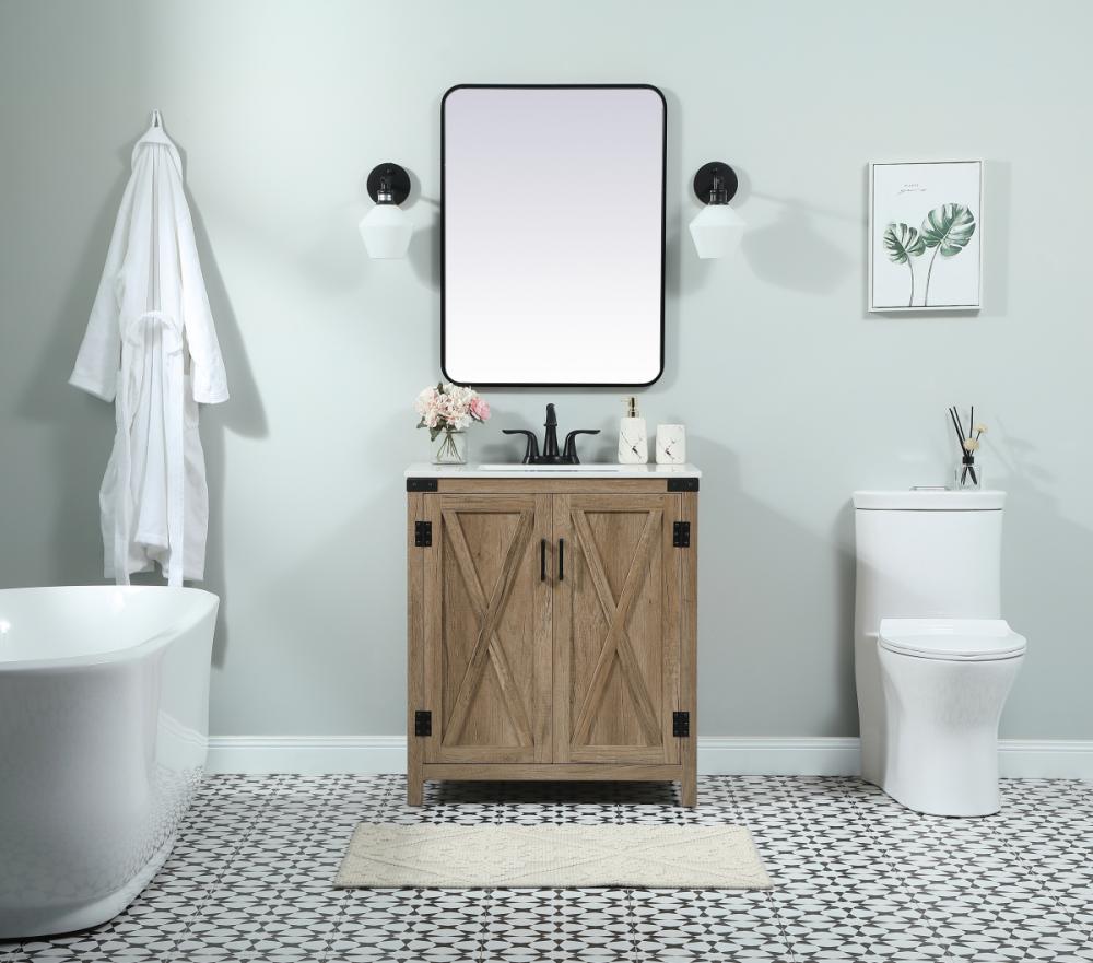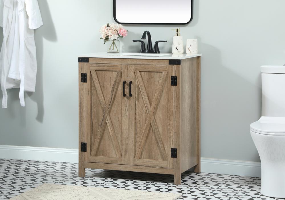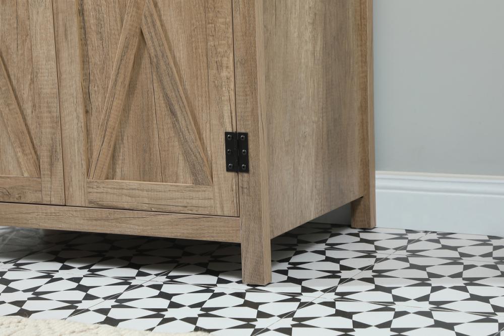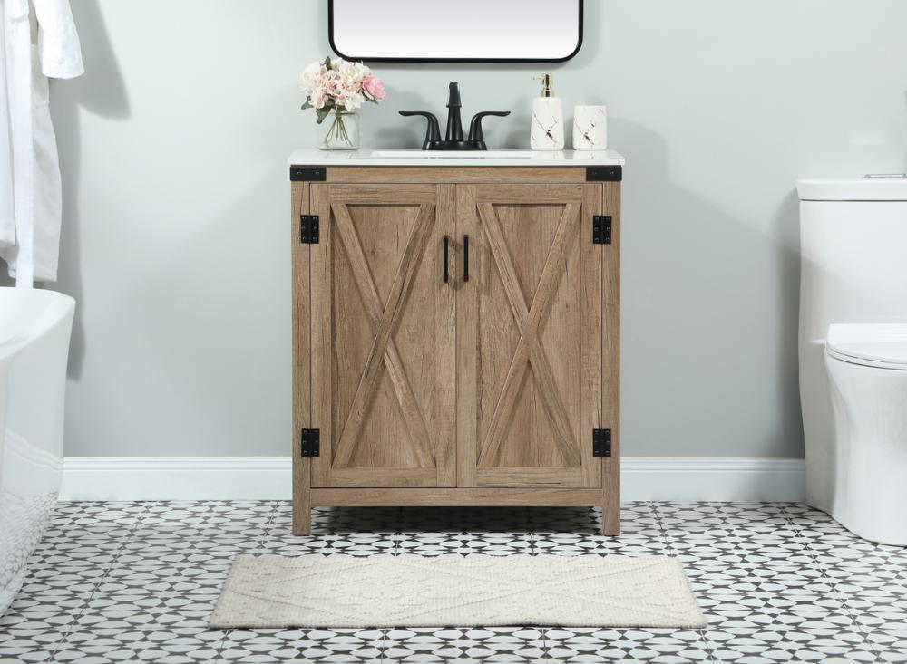 Reminiscent of barn doors, the 2 door cabinet adds both stylistic charm and function with its plethora of storage options for all your bathroom essentials. Whether for your bathroom or the guests', everyone will marvel at its classic look for traditional and farmhouse aesthetics. A slab of engineered marble rounds out the piece up top, as well as the porcelain under mount sink and predrilled faucet holes. This vanity arrives fully assembled.