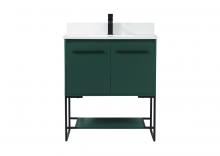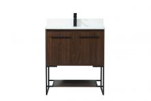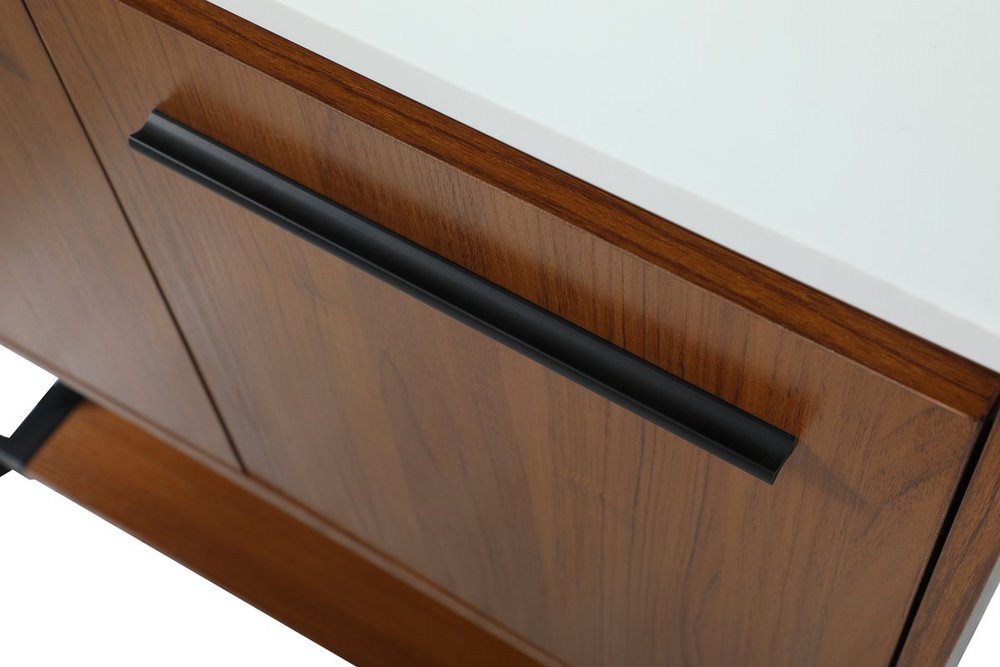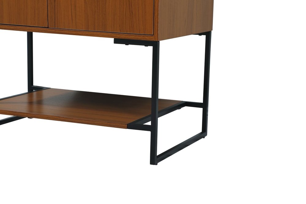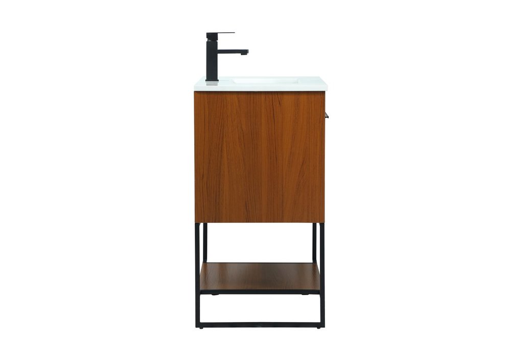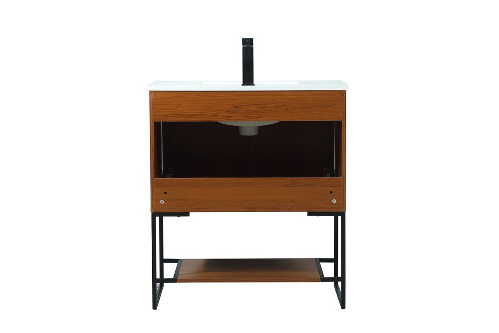 Live in modern comfort with this 30" teak finish vanity. Dressed in a teak and sleek black metal hardware, its contemporary style will have your bathroom or powder room elevated in industrial sophistication. The open shelf at the base and two doors reveal ample storage space for your bathroom essentials and miscellany. Clean lines create its own visual interest, adding trendy looks to your already chic room.