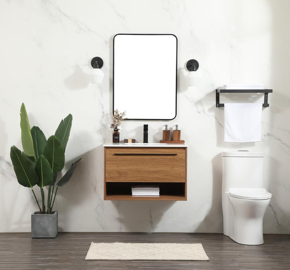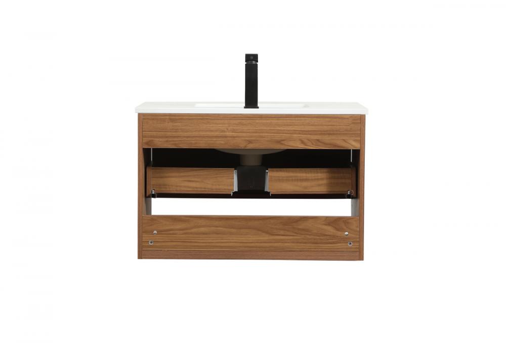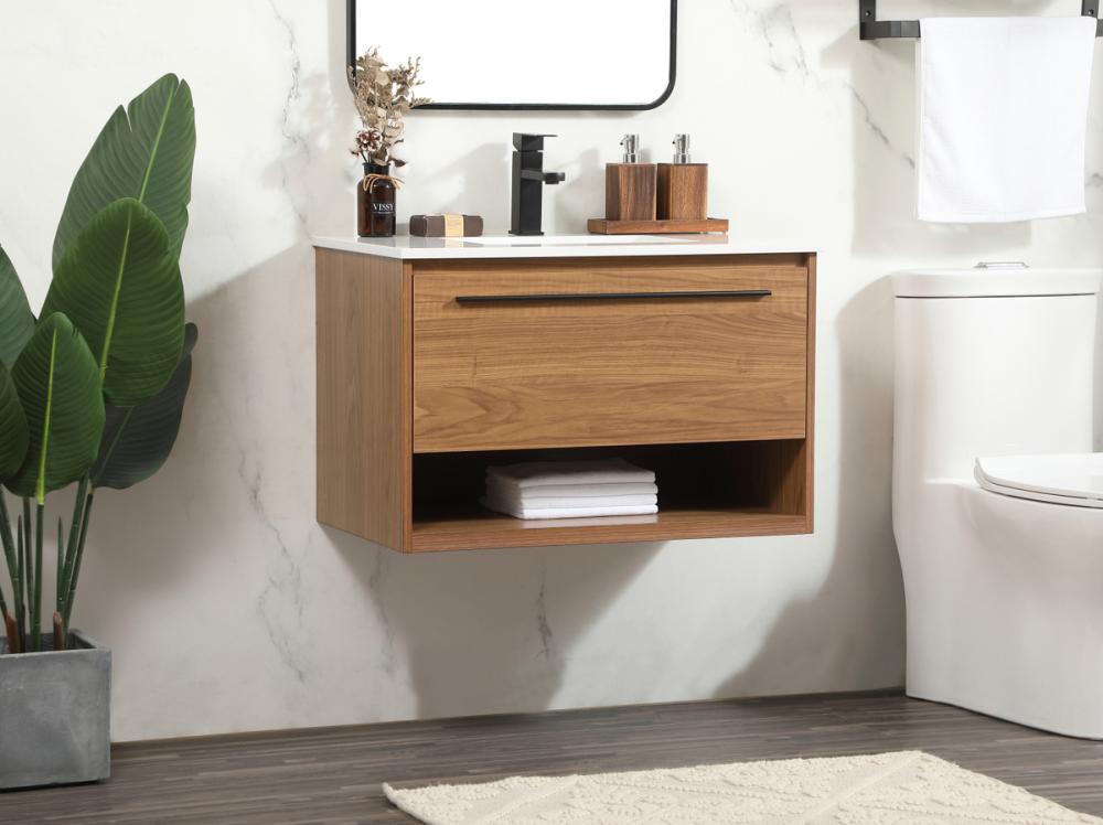 Save space and make your bathroom appear bigger with this floating vanity. Its minimal design will have you in awe, while its clean lines will leave your room feeling fresh and uncluttered. The Single u-drawer pulls out for storage while the open space below allows you to place extra towels or various other essentials. The ivory white engineered marble counter top with porcelain sink adds refined luxe while the aluminum barpull style handle adorn the vanity face.