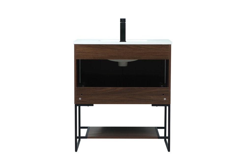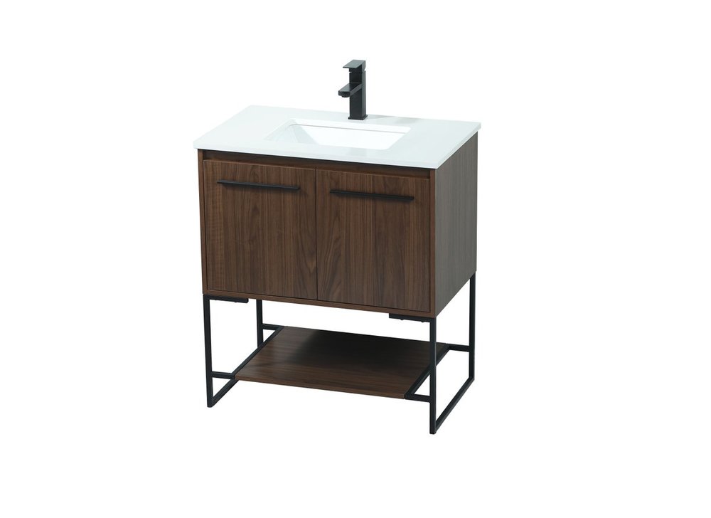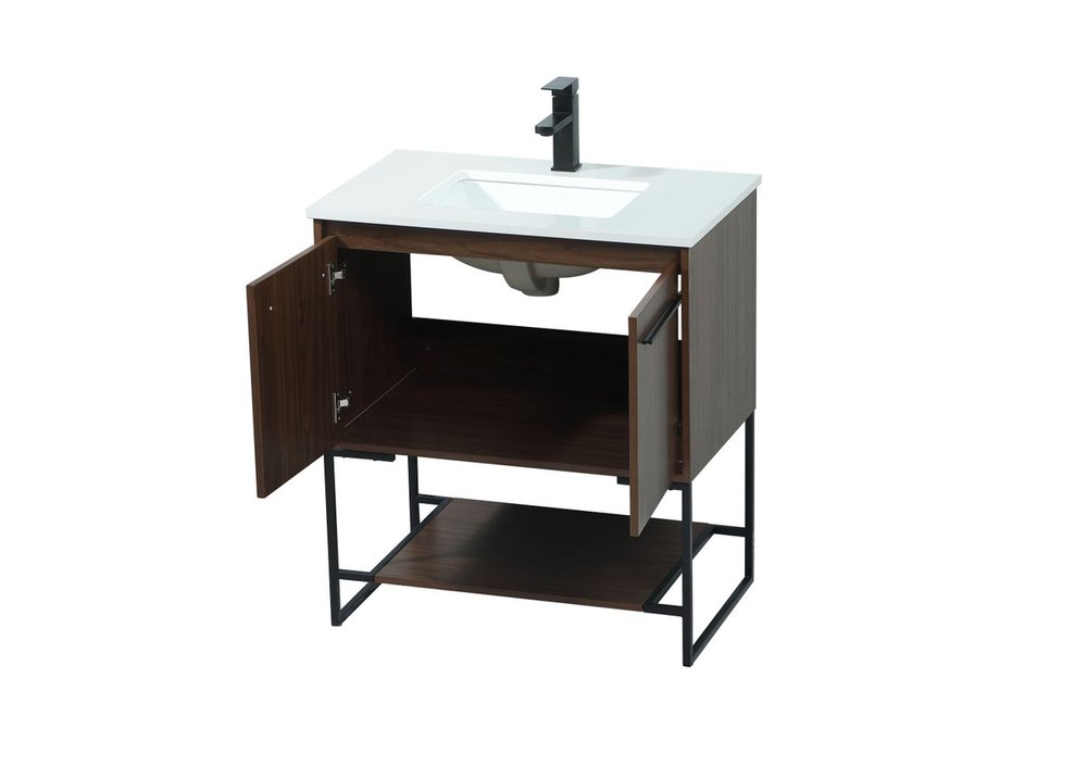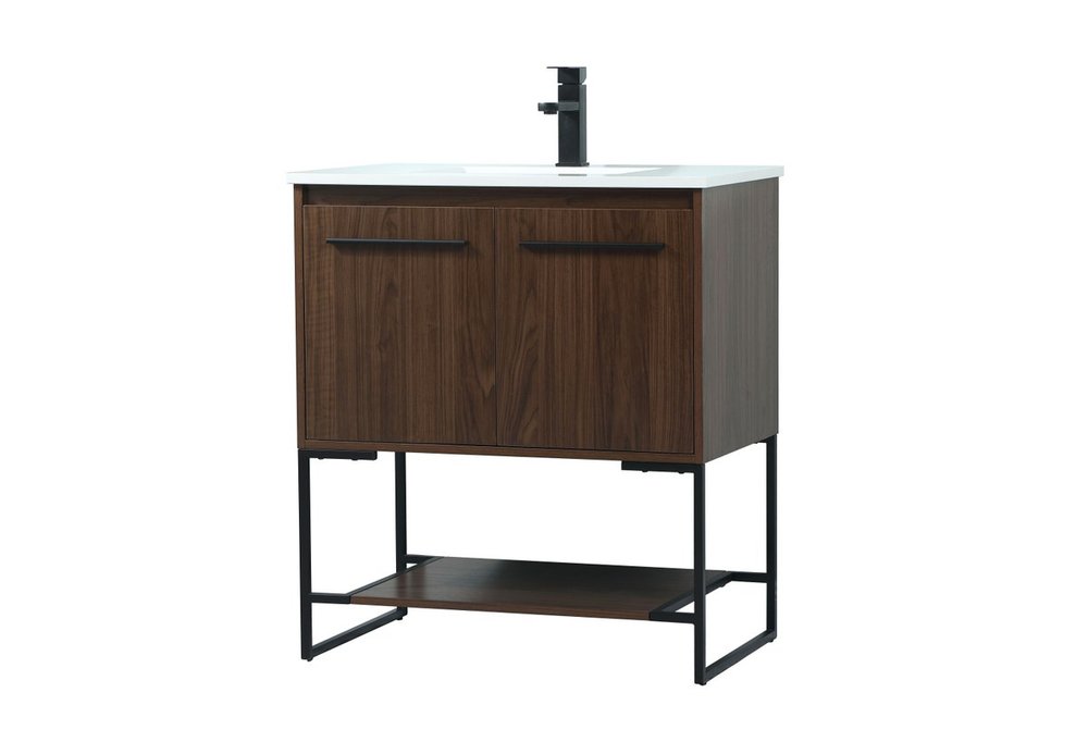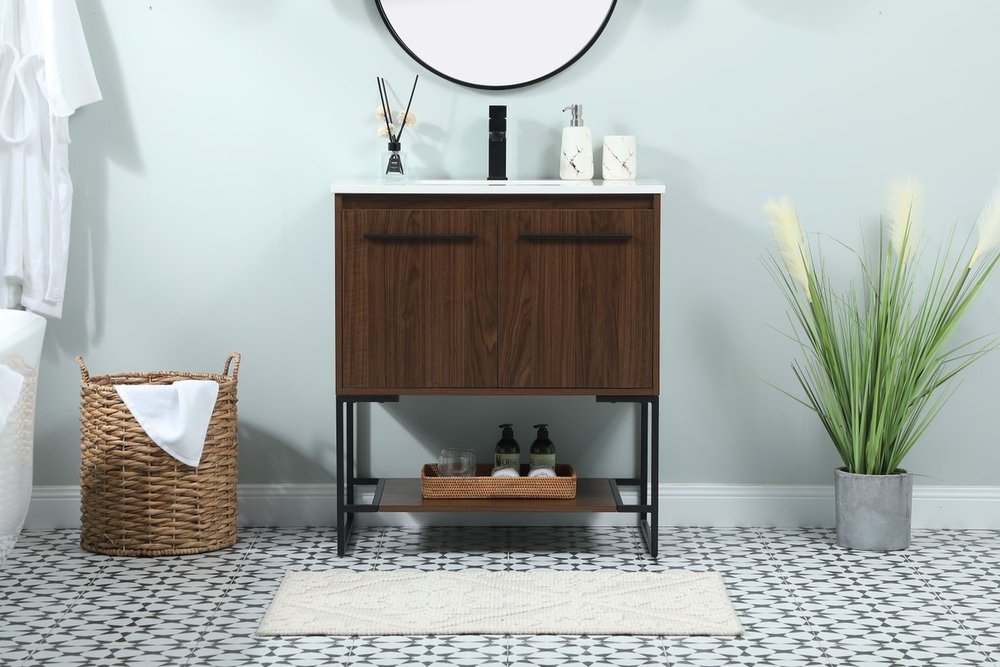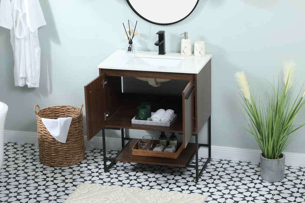 Live in modern comfort with this 30" walnut finish vanity. Dressed in a walnut and sleek black metal hardware, its contemporary style will have your bathroom or powder room elevated in industrial sophistication. The open shelf at the base and two doors reveal ample storage space for your bathroom essentials and miscellany. Clean lines create its own visual interest, adding trendy looks to your already chic room.