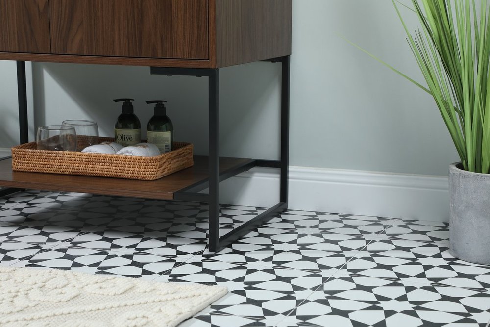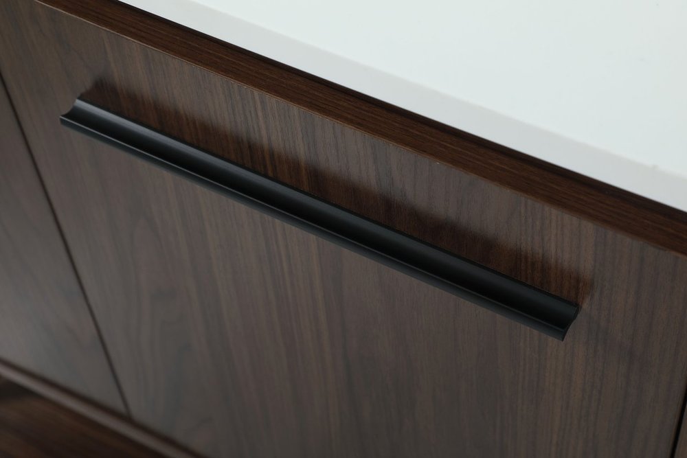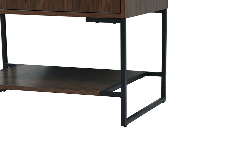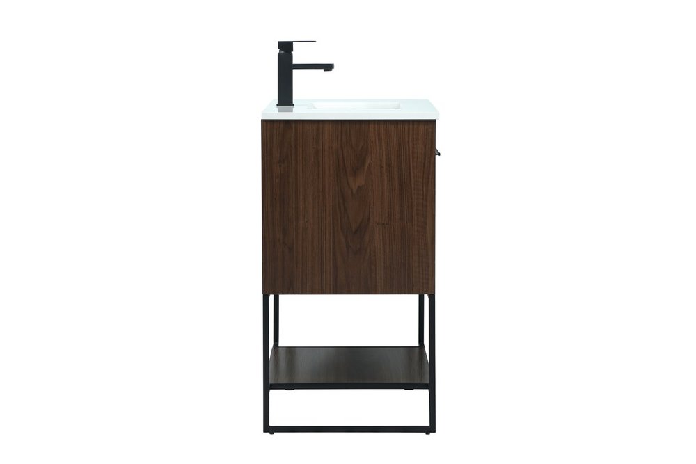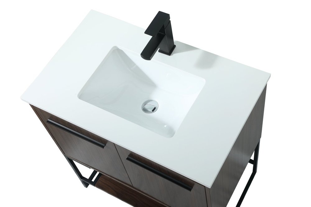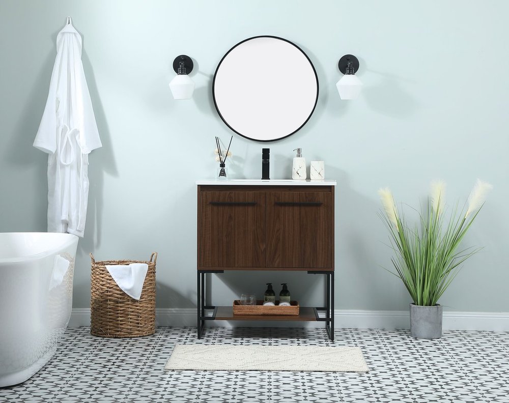 Live in modern comfort with this 30" walnut finish vanity. Dressed in a walnut and sleek black metal hardware, its contemporary style will have your bathroom or powder room elevated in industrial sophistication. The open shelf at the base and two doors reveal ample storage space for your bathroom essentials and miscellany. Clean lines create its own visual interest, adding trendy looks to your already chic room.