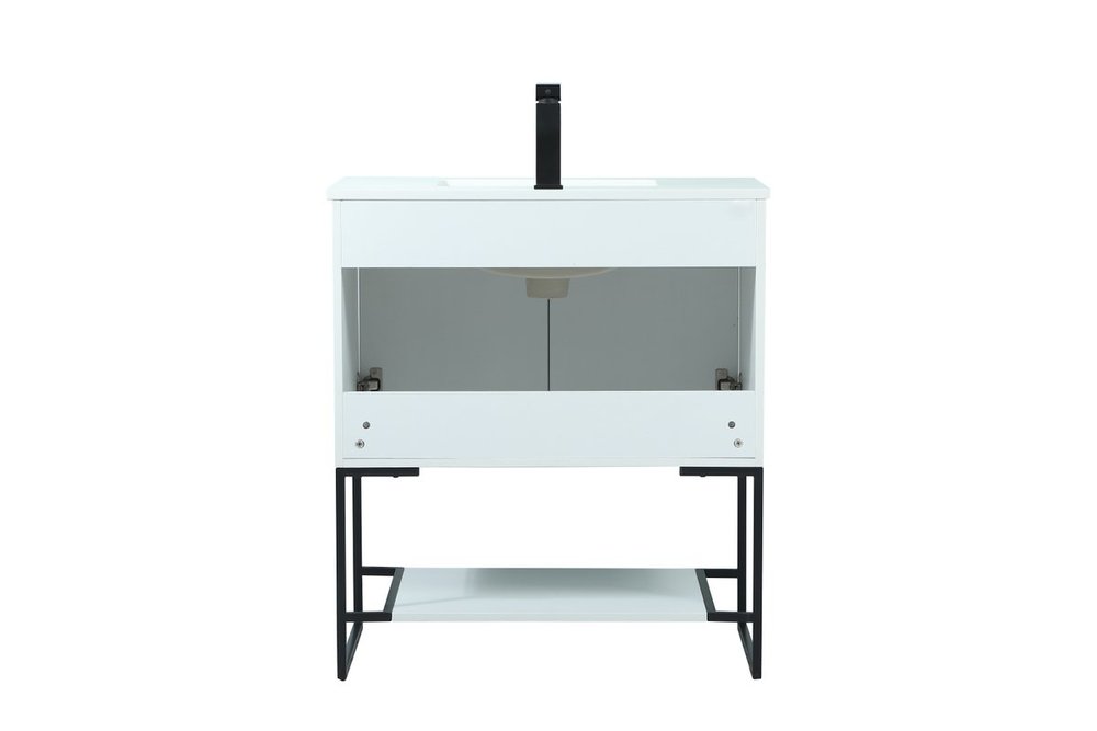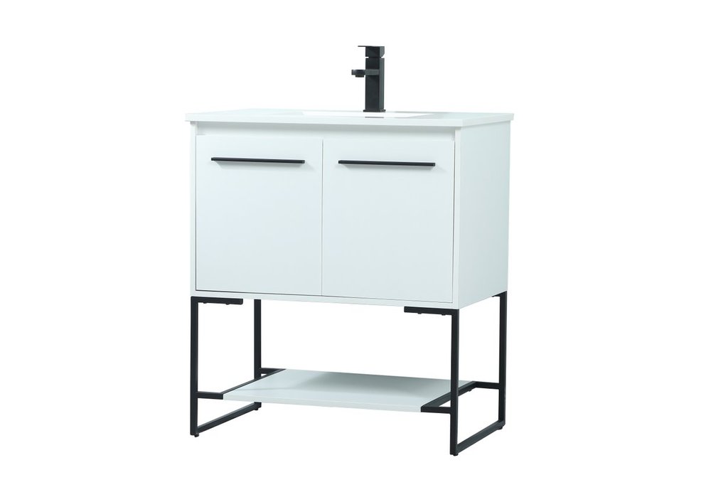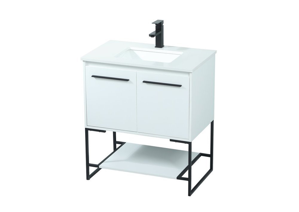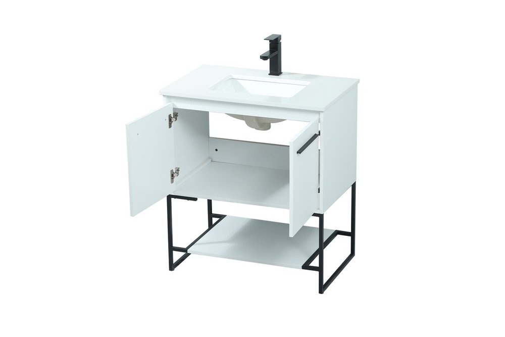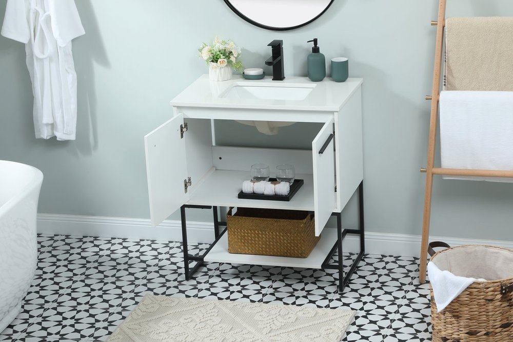 Live in modern comfort with this 30" white finish vanity. Dressed in a white and sleek black metal hardware, its contemporary style will have your bathroom or powder room elevated in industrial sophistication. The open shelf at the base and two doors reveal ample storage space for your bathroom essentials and miscellany. Clean lines create its own visual interest, adding trendy looks to your already chic room.