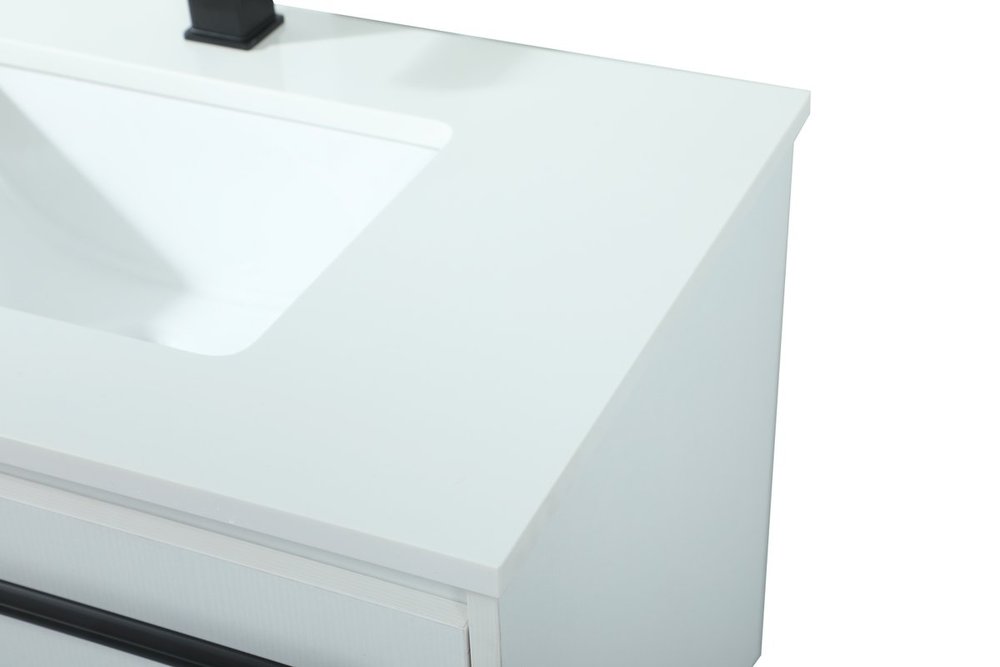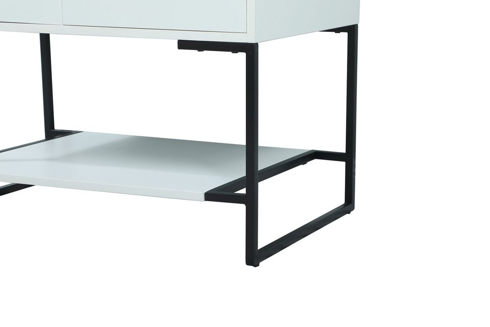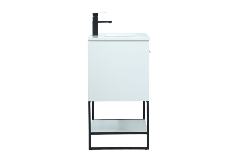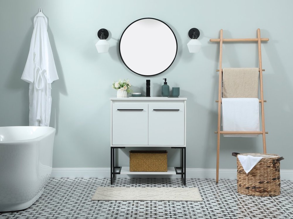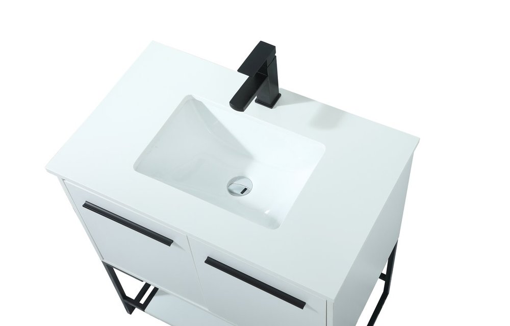 Live in modern comfort with this 30" white finish vanity. Dressed in a white and sleek black metal hardware, its contemporary style will have your bathroom or powder room elevated in industrial sophistication. The open shelf at the base and two doors reveal ample storage space for your bathroom essentials and miscellany. Clean lines create its own visual interest, adding trendy looks to your already chic room.