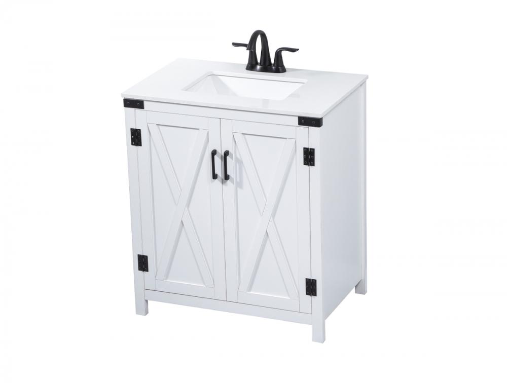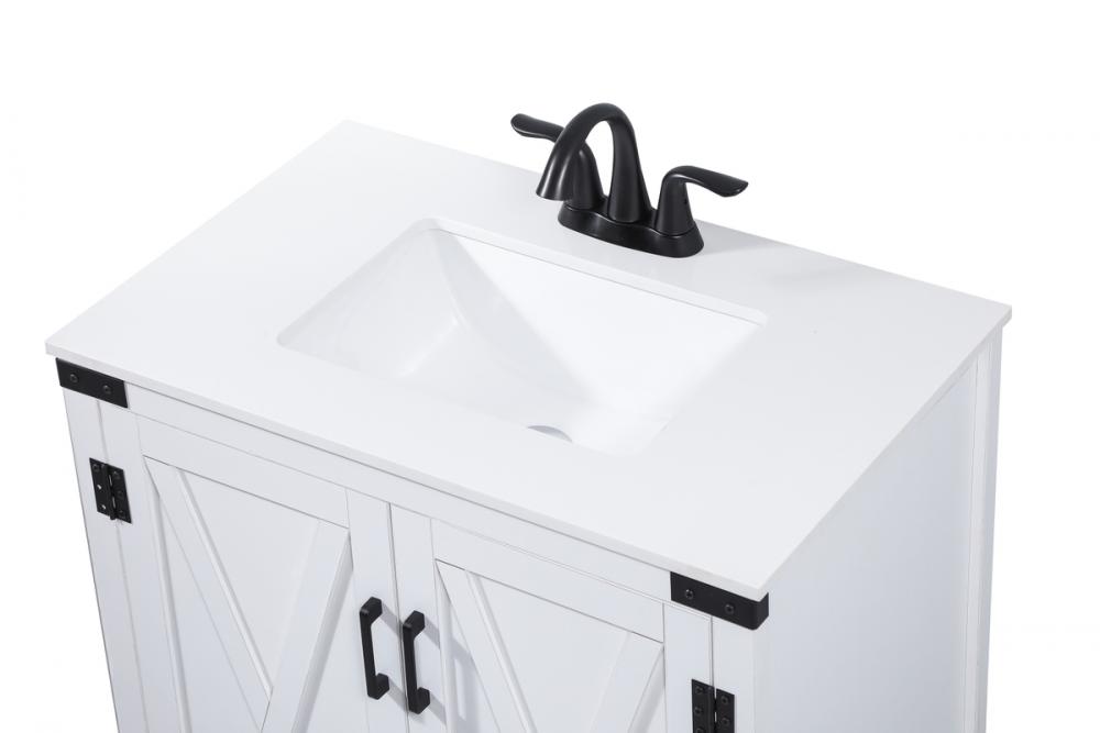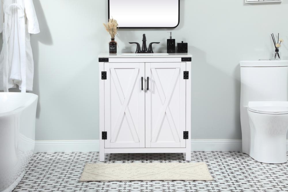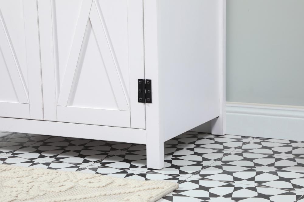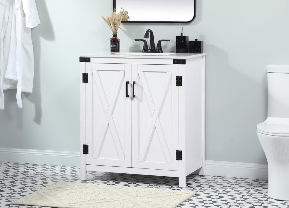 Reminiscent of barn doors, the 2 door cabinet adds both stylistic charm and function with its plethora of storage options for all your bathroom essentials. Whether for your bathroom or the guests', everyone will marvel at its classic look for traditional and farmhouse aesthetics. A slab of engineered marble rounds out the piece up top, as well as the porcelain under mount sink and predrilled faucet holes. This vanity arrives fully assembled.