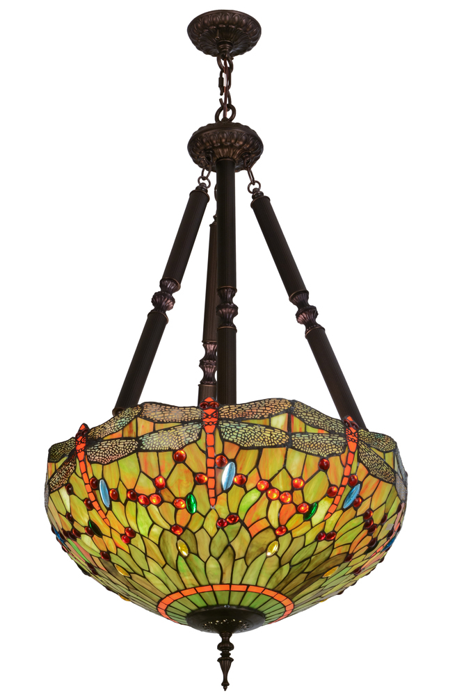 Re-creating Tiffany Studios' iconic lighting design that dates back to 1906; this Meyda Tiffany Wisteria pendant features cascading blossoms in variegated hues of Blue and Lavender art glass; that is accented with Spring Green leaves. Designed with an undulating border; this beautiful art glass shade offers a complex artistic pattern that comprises nearly 2;000 glass pieces which are individually selected; cut and set by hand. The overall effect achieved is lyrical and full of movement; capturing the lushness of the wisteria tree in bloom. This luxury styled pendant is complemented with hardware finished in a warm Mahogany Bronze. Custom colors; styles; sizes and lamping options are available.