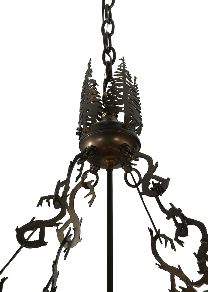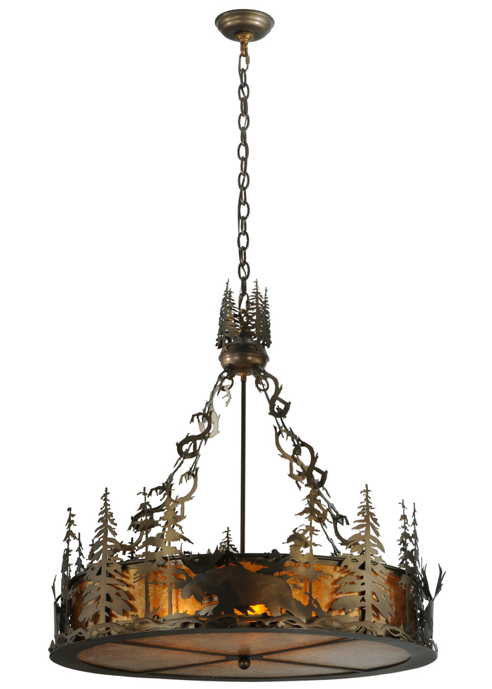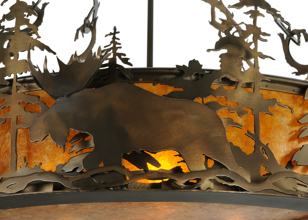 A Moose wanders through the tall pines around this circular pendant handcrafted in the USA by Meyda artisans. Suspended from hand crafted branch like chain links that hang from a pine tree adorned hub; this fixture is finished in Antique Copper and has Amber mica panels.