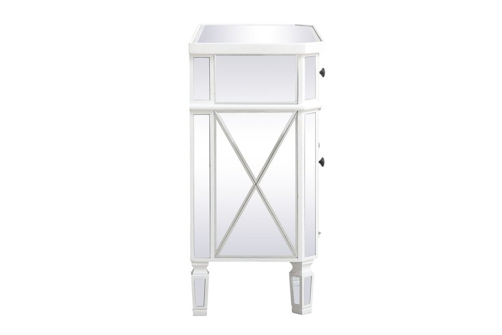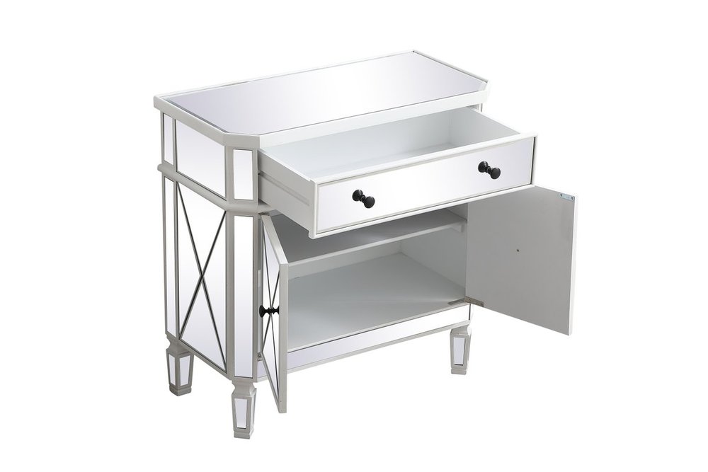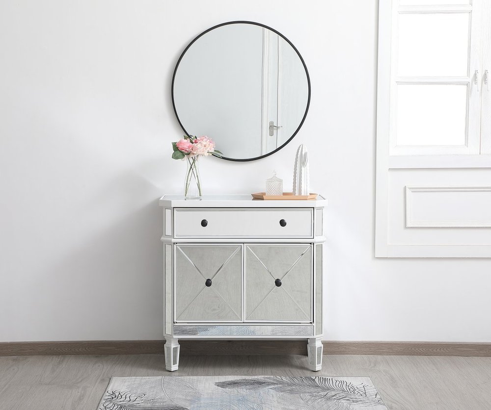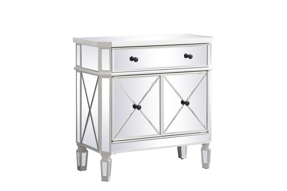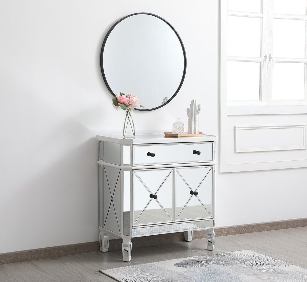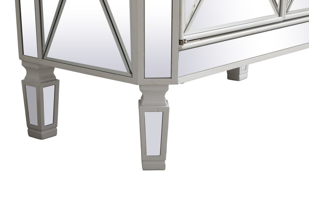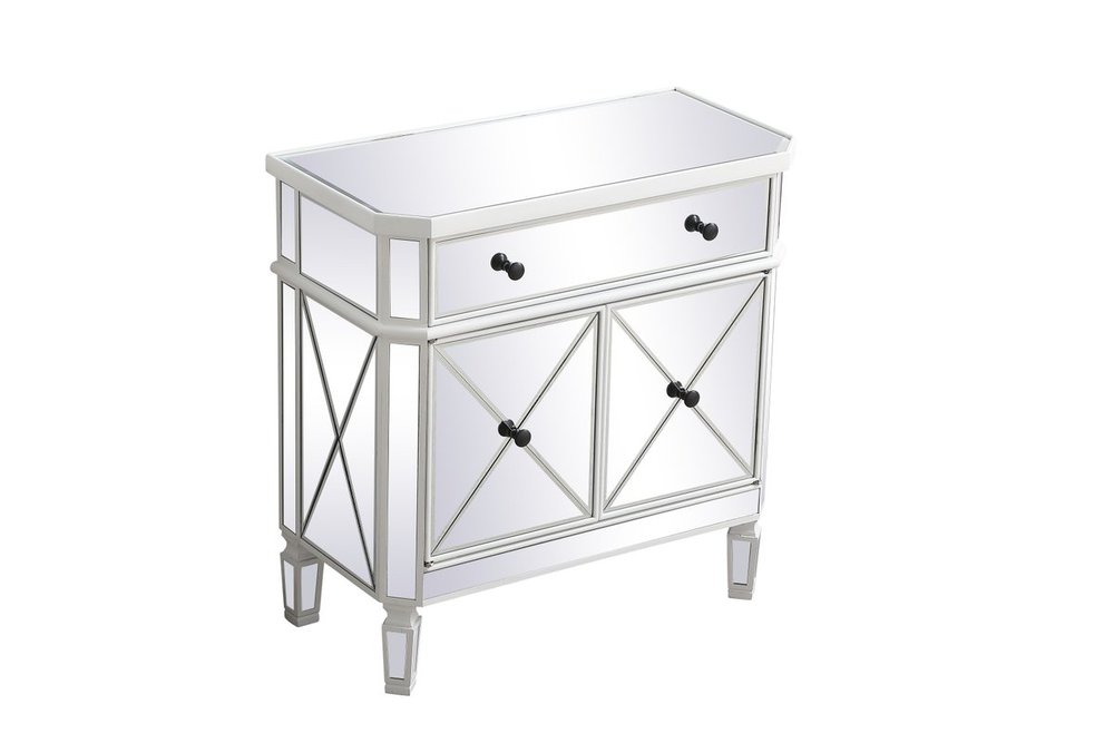 Make a striking statement with this gleaming mirrored storage cabinet and live in the elegantly sleek future. Its contemporary style is defined by the alternating panels of polished beveled mirror panels. Its alternating panels that wrap around the entire cabinet creates an amusing design that everyone will enjoy and marvel at. Place this storage cabinet in your home and adorn it with your favorite objects—captivating art pieces, beautiful floral arrangements, or even personal treasures like family portraits. Ships fully assembled with the exception of installing the legs.