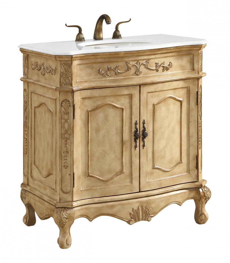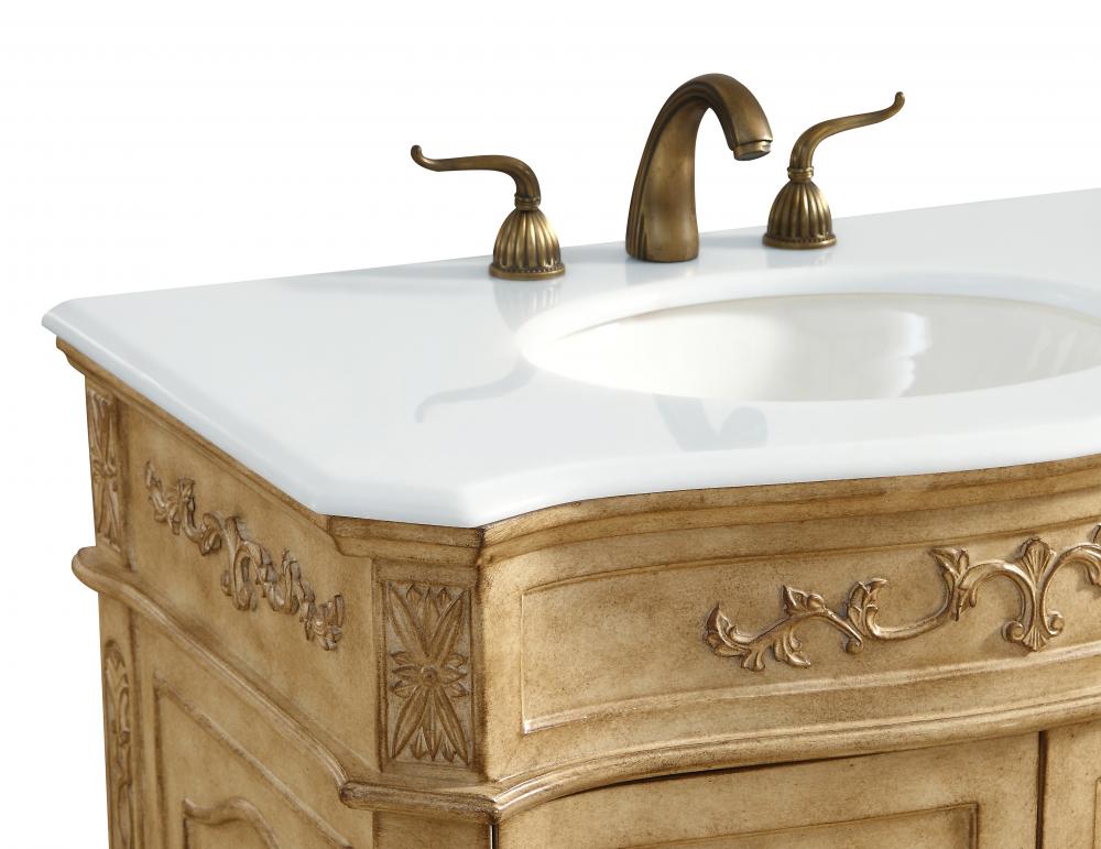 This superb balance of timeless tradition and opulent beauty in a engineered marble-topped vanity will certainly enhance the aesthetics of any home or office bathroom! Featuring an ivory white durable engineered marble countertop complimenting the hand painted cabinet with a delicate carved floral design, stands on stylishly carved solid wood French scroll feet. Don't let the design fool you, the engineered marble countertop and porcelain undermount sink allows for space to get ready, while the antique bronze hardware allows you to discover storage spaces with ease. You and your guests will marvel at this vanity that will both store away your bathroom essentials and enhance the aesthetics of your room.