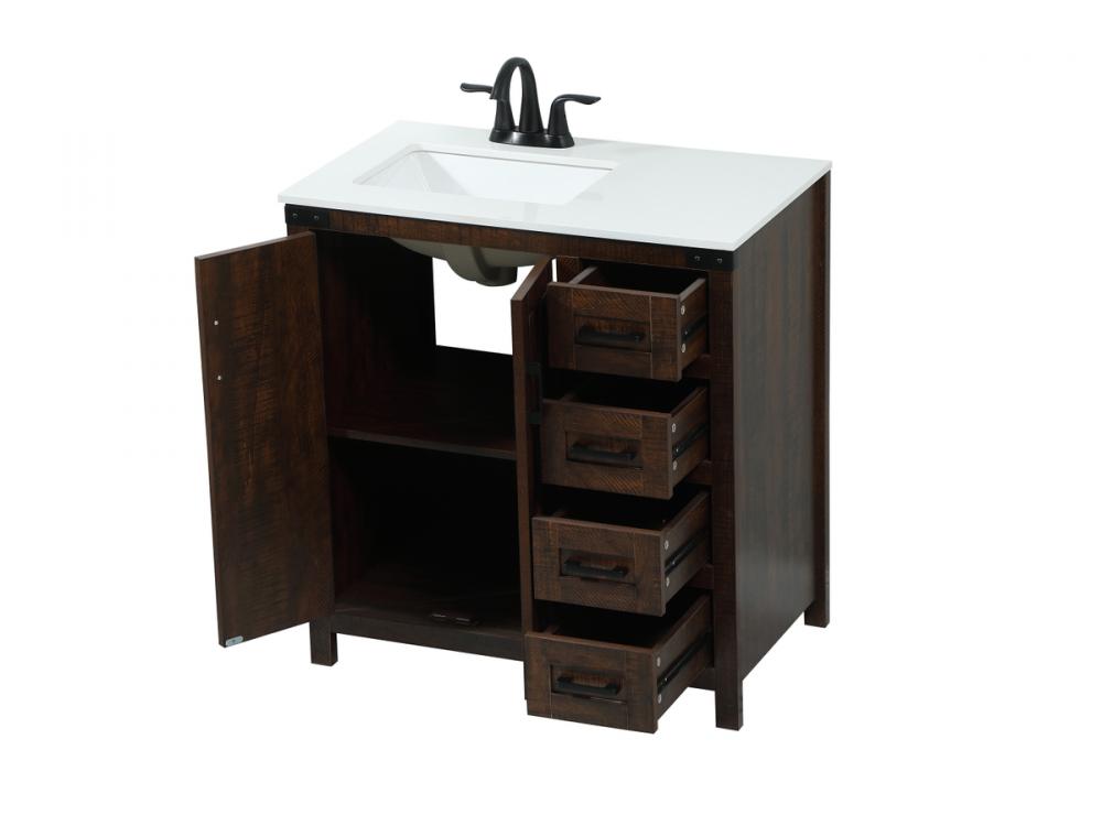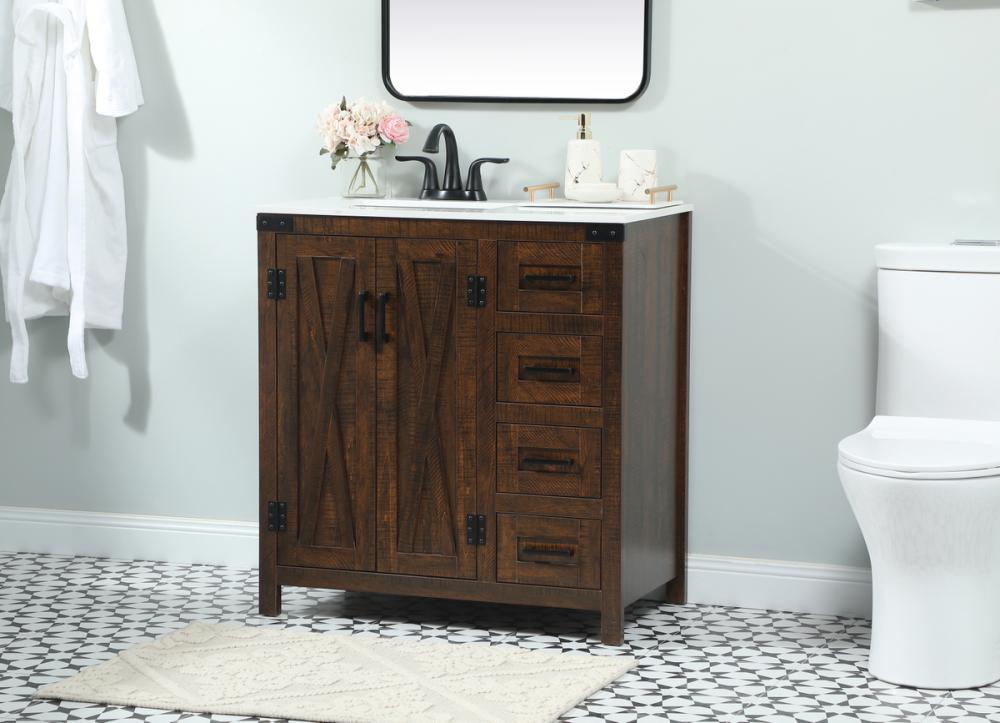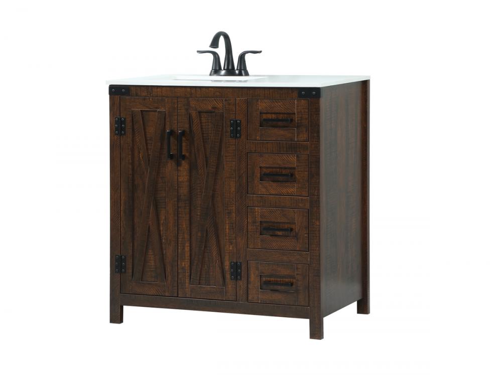 Reminiscent of barn doors, the two door cabinet and four drawers adds both stylistic charm and function with its plethora of storage options for all your bathroom essentials. Whether for your bathroom or the guests', everyone will marvel at its classic look for traditional and farmhouse aesthetics. A slab of engineered marble rounds out the piece up top, as well as the porcelain under mount sink and predrilled faucet holes. This vanity arrives fully assembled.