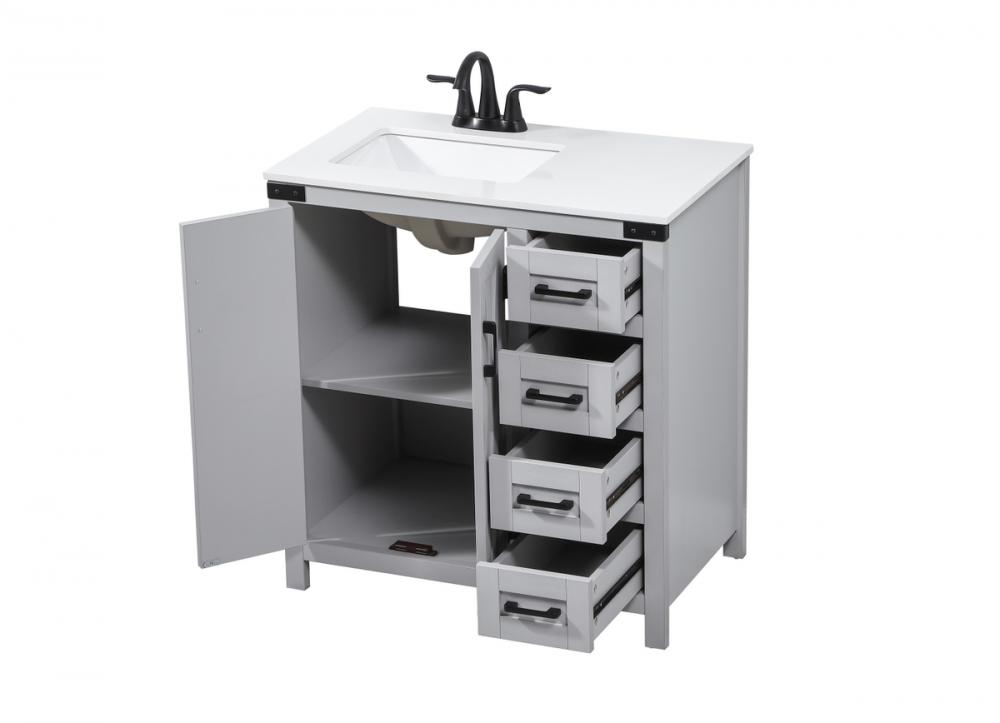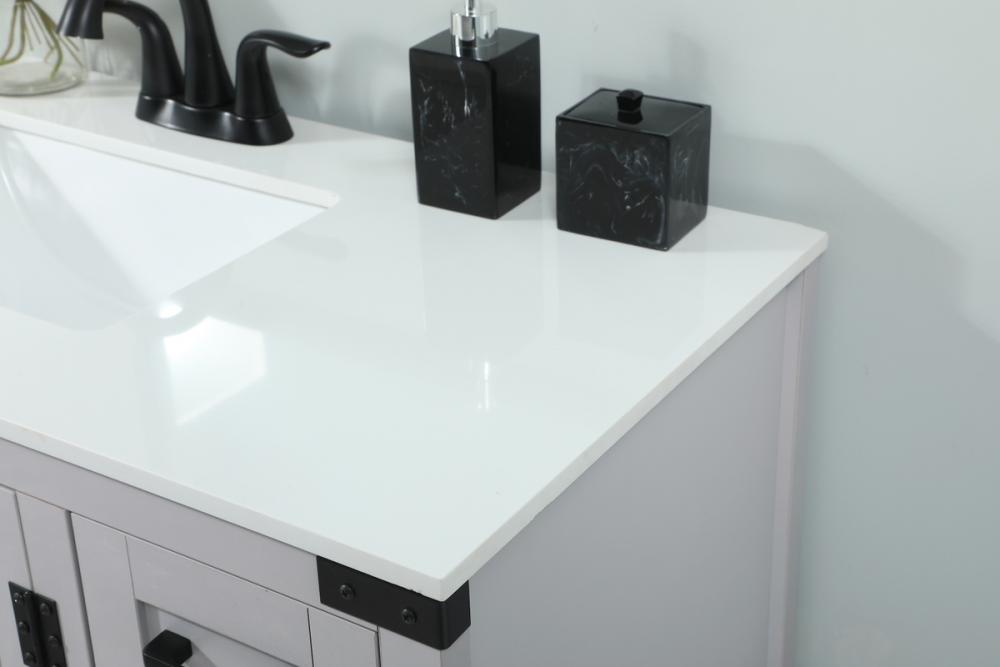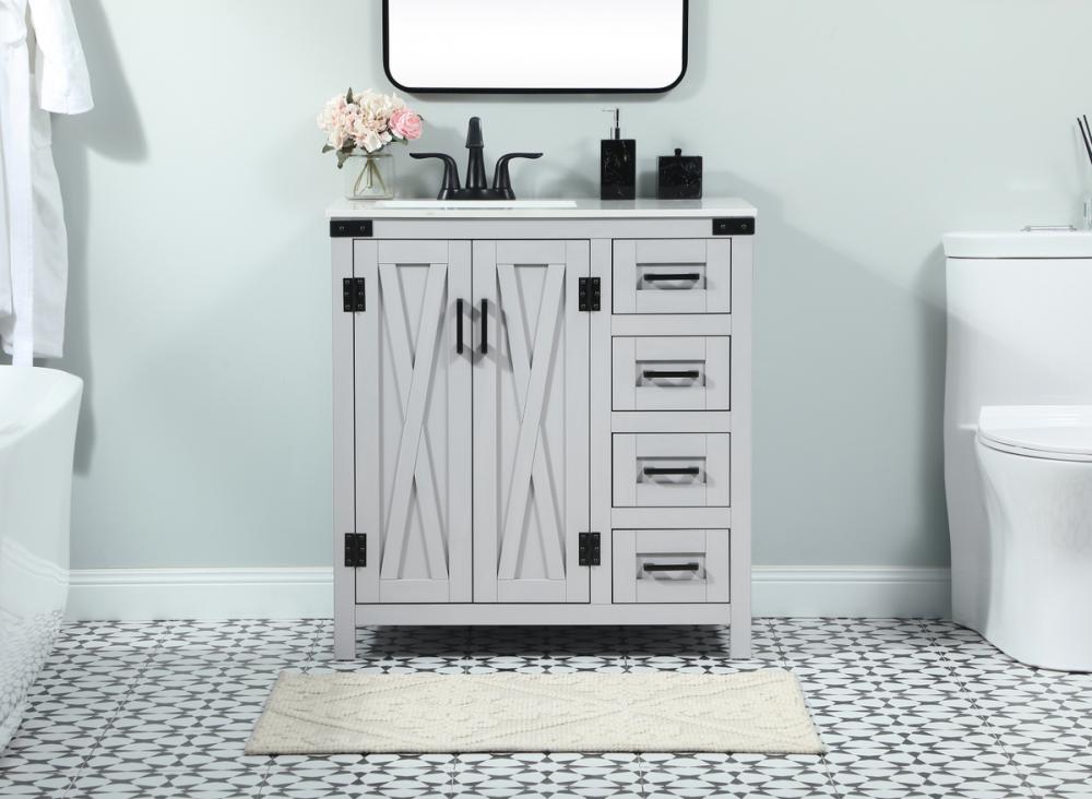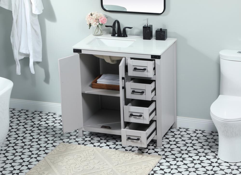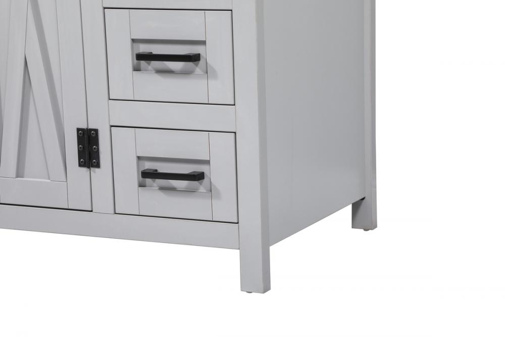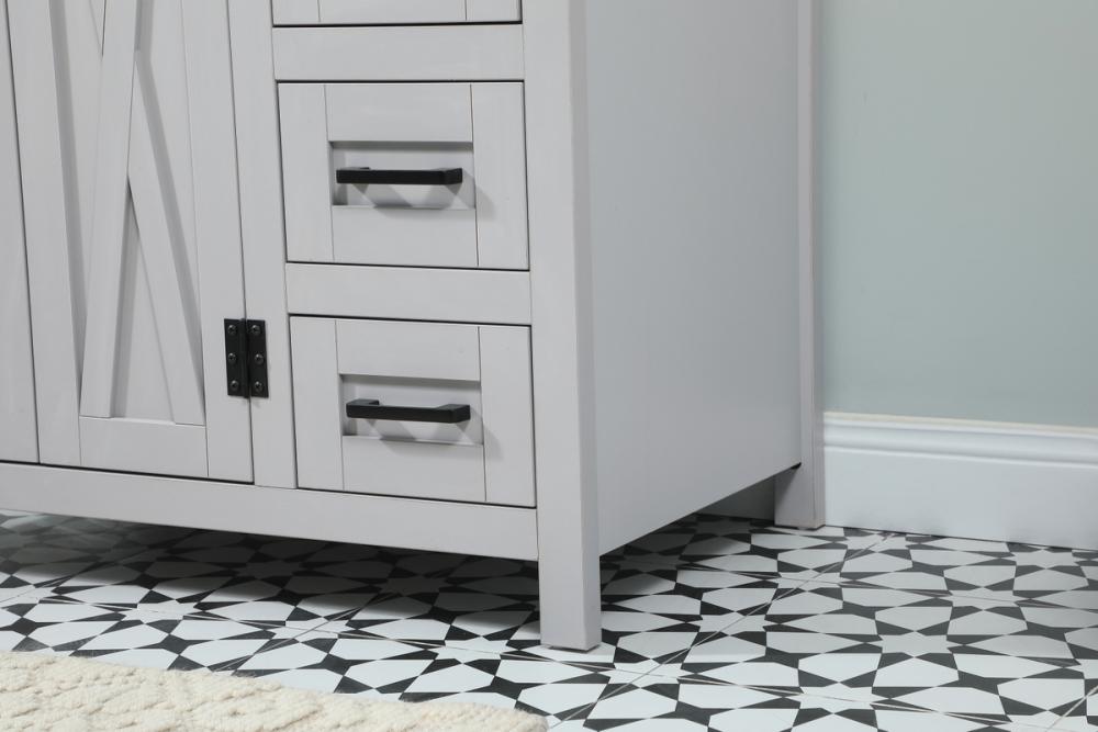 Reminiscent of barn doors, the two door cabinet and four drawers adds both stylistic charm and function with its plethora of storage options for all your bathroom essentials. Whether for your bathroom or the guests', everyone will marvel at its classic look for traditional and farmhouse aesthetics. A slab of engineered marble rounds out the piece up top, as well as the porcelain under mount sink and predrilled faucet holes. This vanity arrives fully assembled.