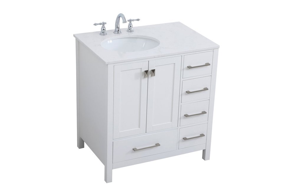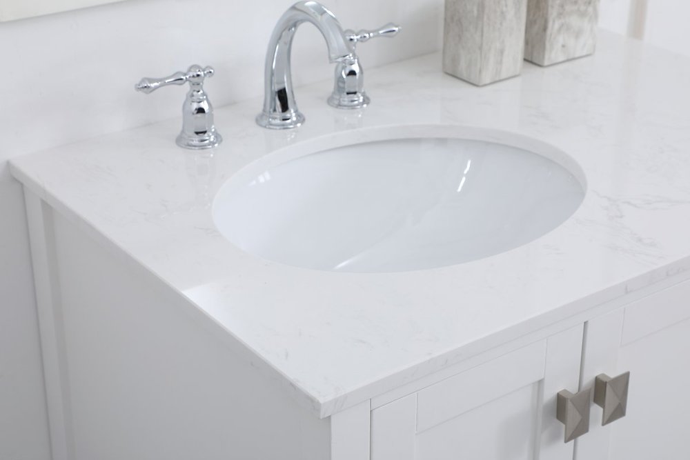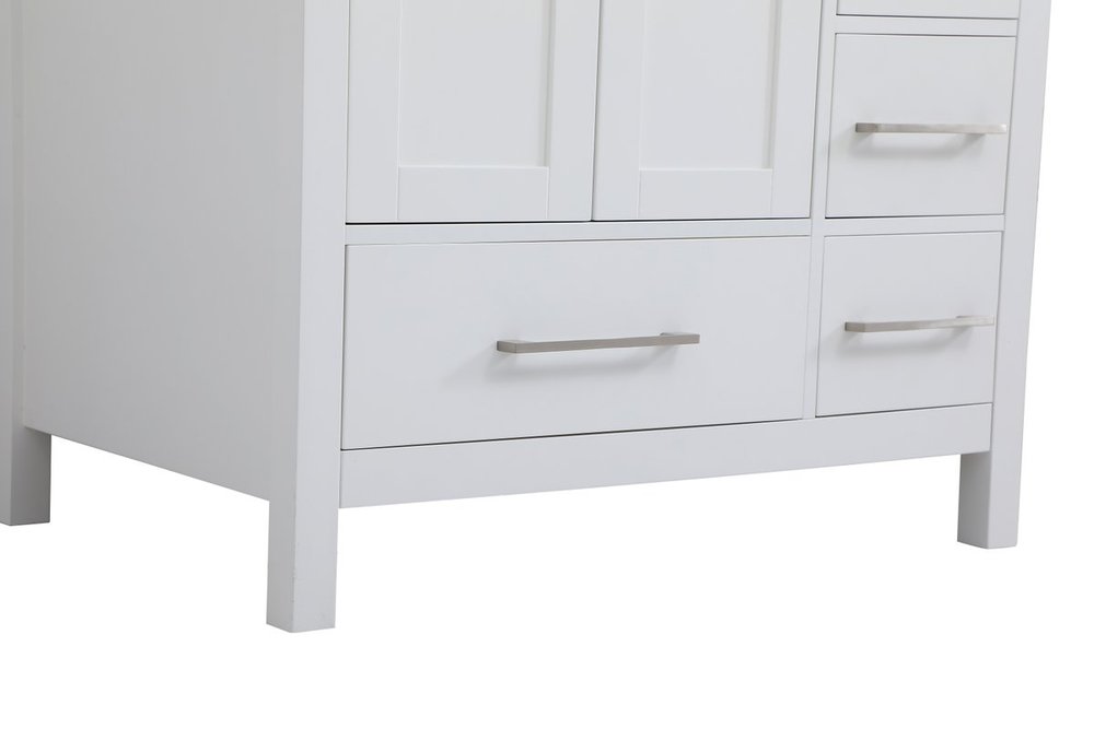 Never compromise beauty--the Irene collection stunning vanity in a white finish will add lovely sophistication and complement any bathroom or powder room, while utilizing its charm and function to provide you with ample storage spaces. Brushed nickel pulls gently adorn the minimalist cabinet doors and drawers at the base, allowing for you to store away your bathroom essentials. The calacatta engineered marble countertop, porcelain undermount sink, dignified subtle engravings on the side edges, and squared legs all come together to create contemporary beauty. Work with your space, and design a beautiful room, no matter the size.