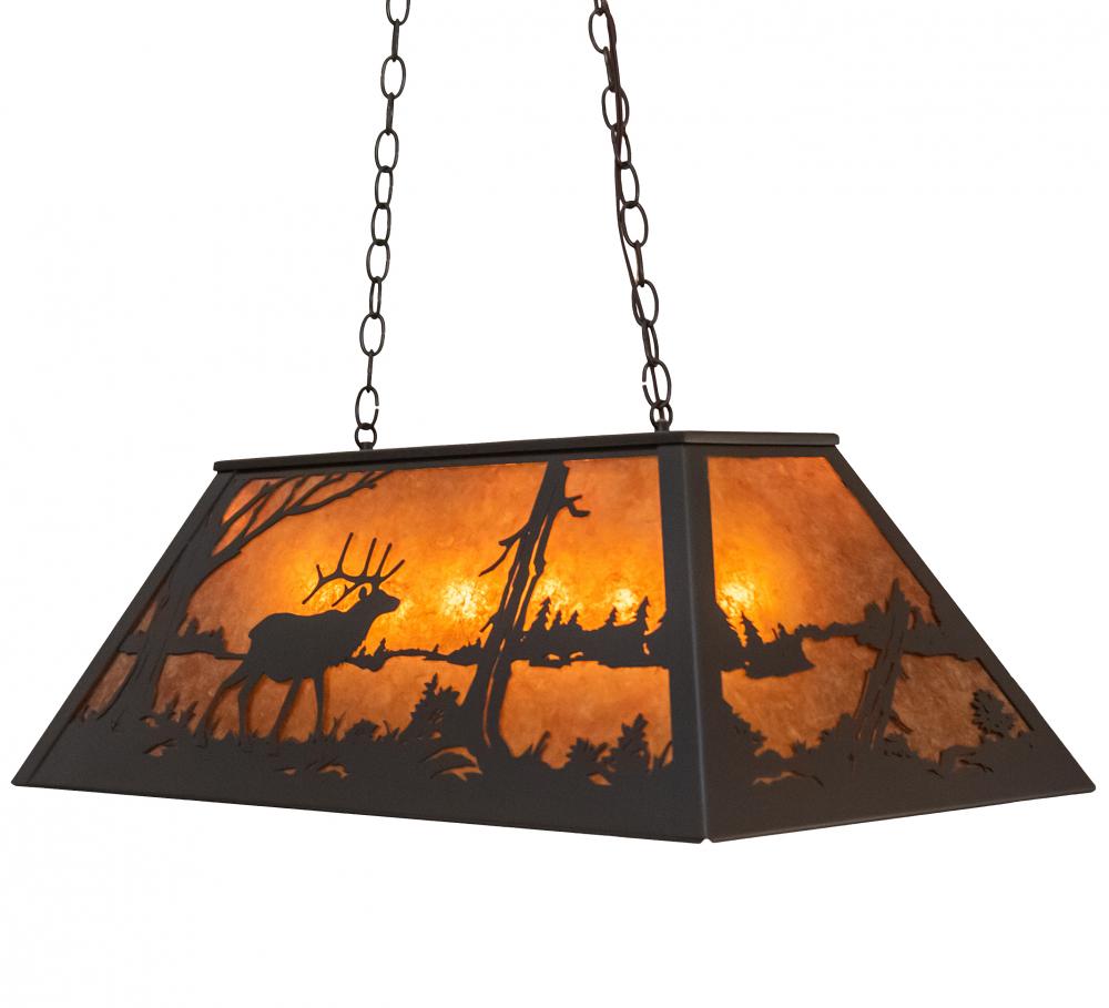 Rustic charm is captured beautifully with this majestic Elk walking by the lake in the forest while the sun rises in the background of this natural wildlife inspired pendant. Soft ambient light projects through stunning Amber Mica panels complemented with a Timeless Bronze finish. Ideal for placement over kitchen islands; counters; dining and billiard tables. Overall height ranges from 18 to 43 inches as the chain length can be easily adjusted in the field. Handcrafted in our 180;000 square foot manufacturing facility in Yorkville; New York. Shade colors; metal finishes and fixture sizes can be customized to your needs. UL and cUL listed for dry and damp locations.